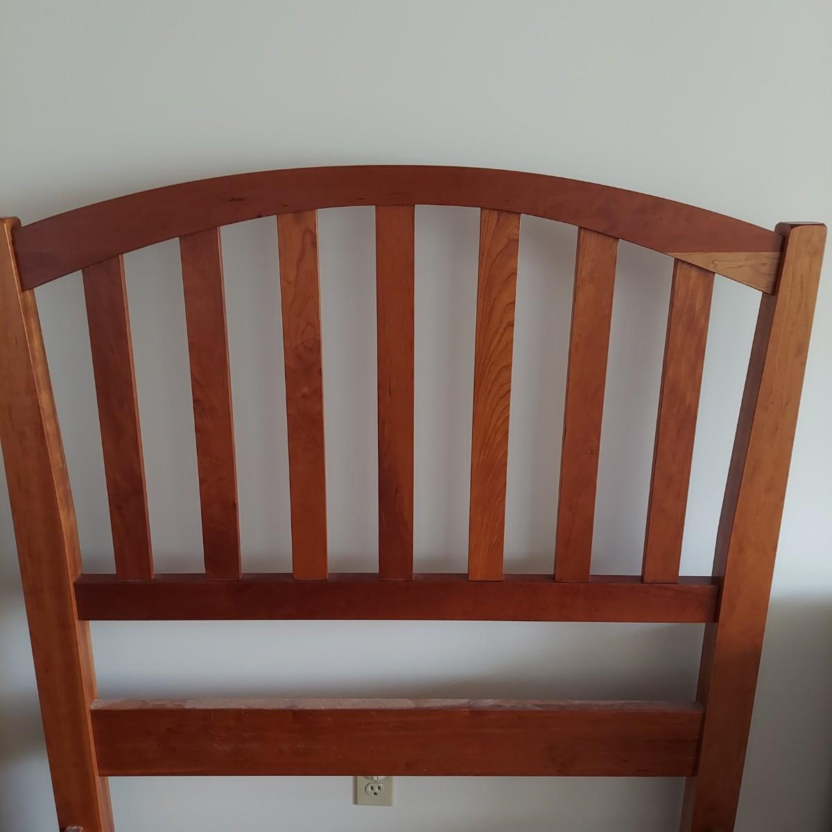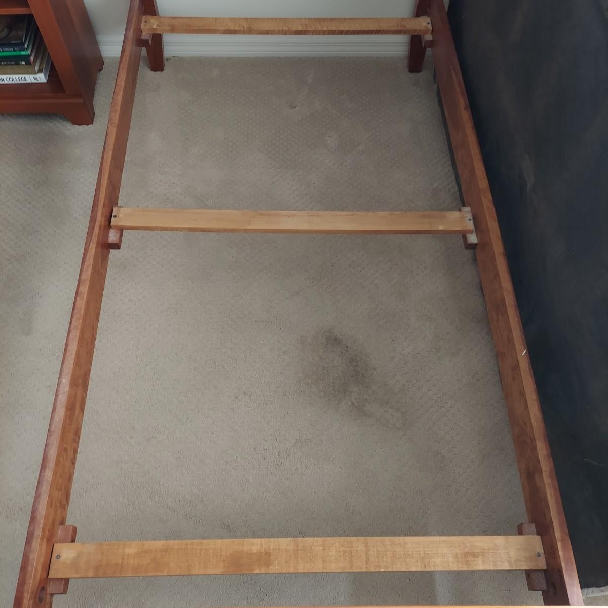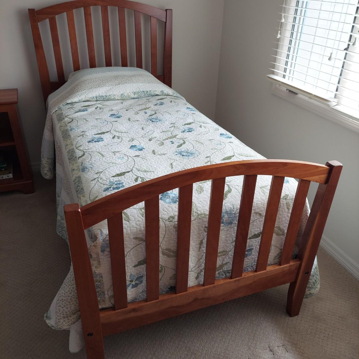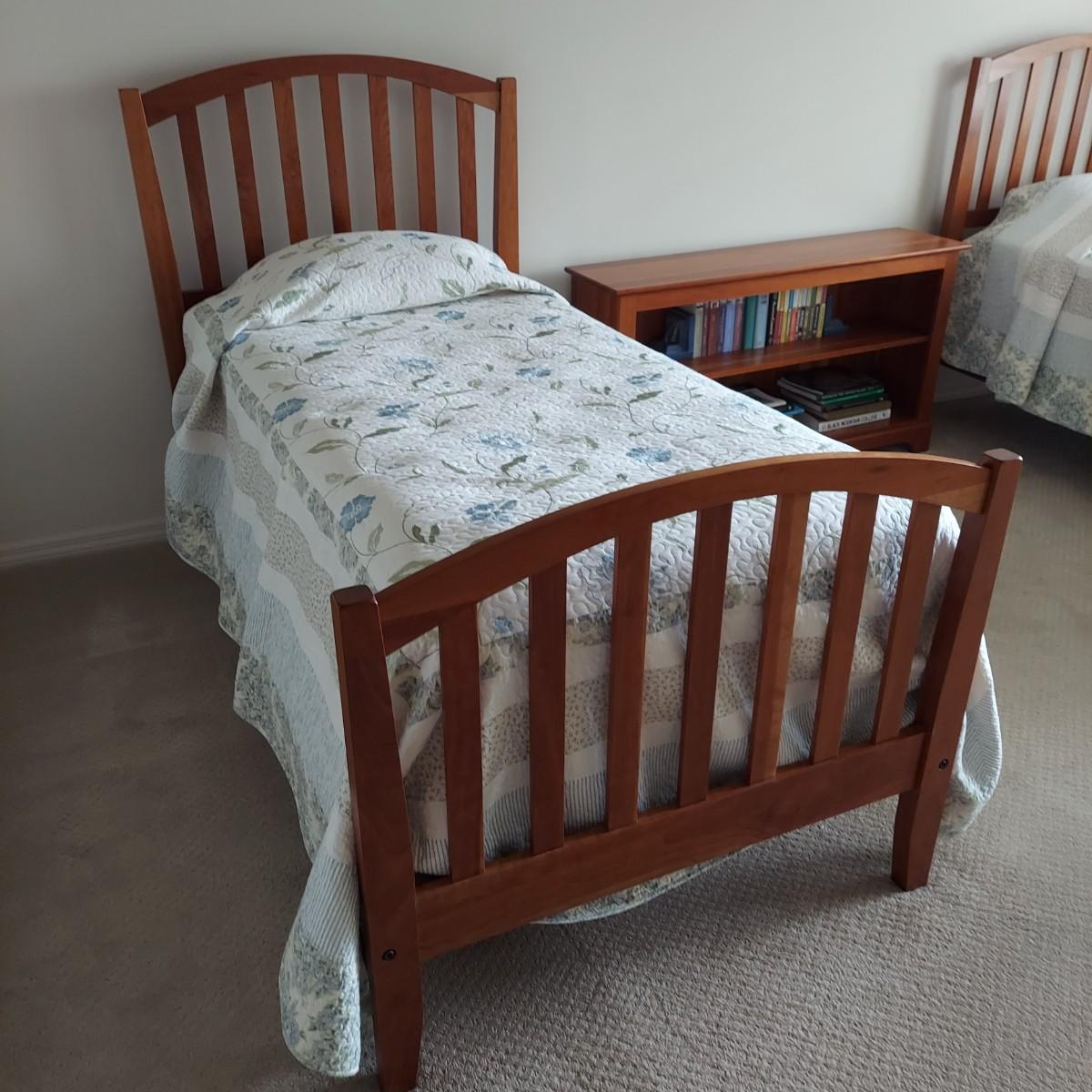 Two wooden Mission style twin bed frames with matching floral quilts. The beds each measure 42.5" x 80" x 54"H. The quilts are approximately 81" x 109". One quilt has a stain that's about 6". Bed Frames will need disassembled at pickup by winning bidder. Please see photos of hardware and bring appropriate tools. The mattresses are available to the winning bidder if desired, but the winning bidder is not required to take them. Local Pickup Only. Winning bidder must bring assistance to help move and load this item due to its weight and/or size.