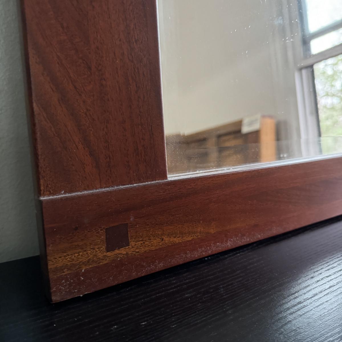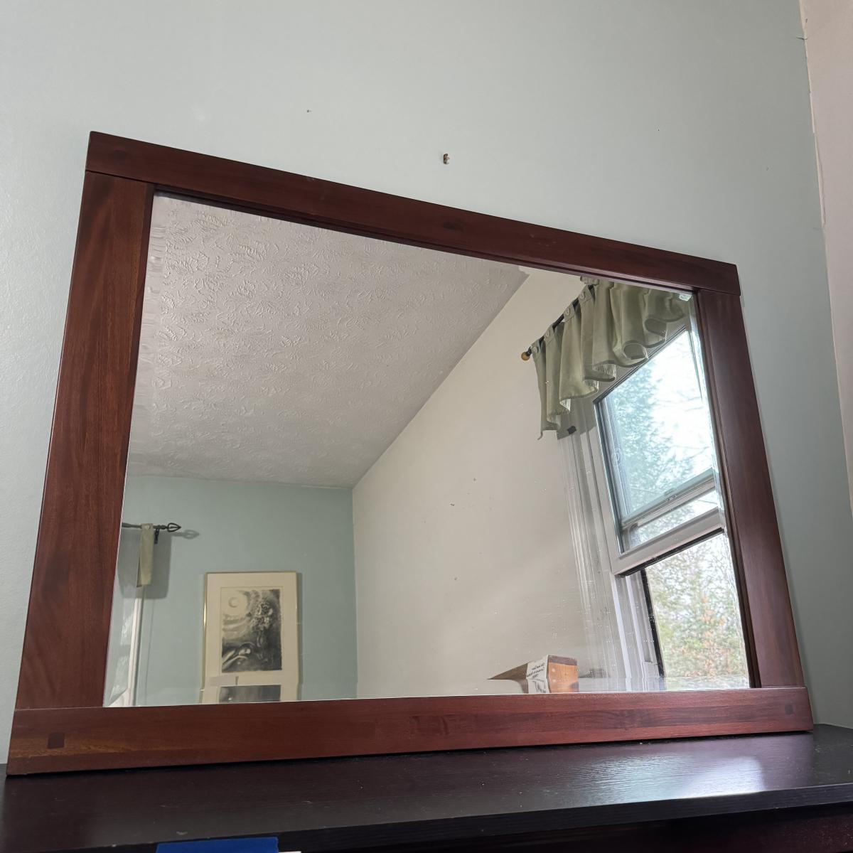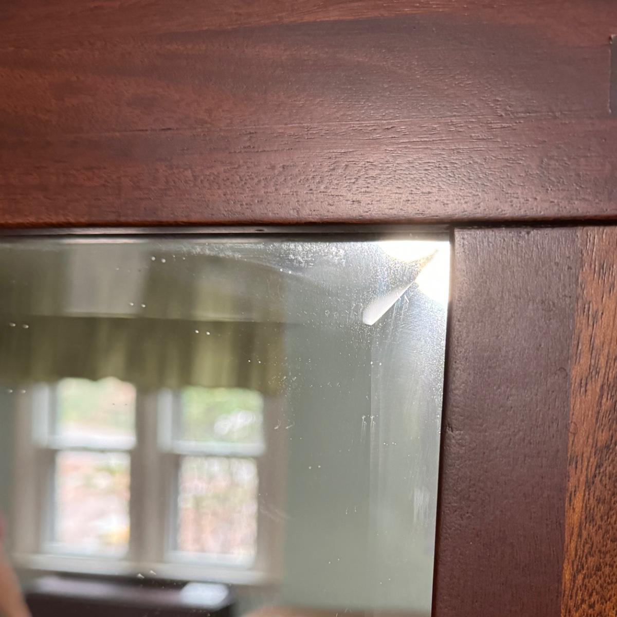 Lovely wooden mirror with a mission style design. Cherry wood colored wood and beveled mirror. Measures 44” x 32”. Local pick up only