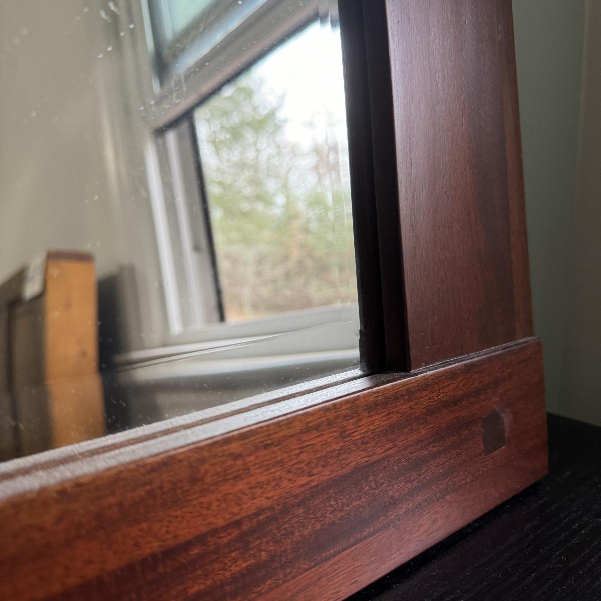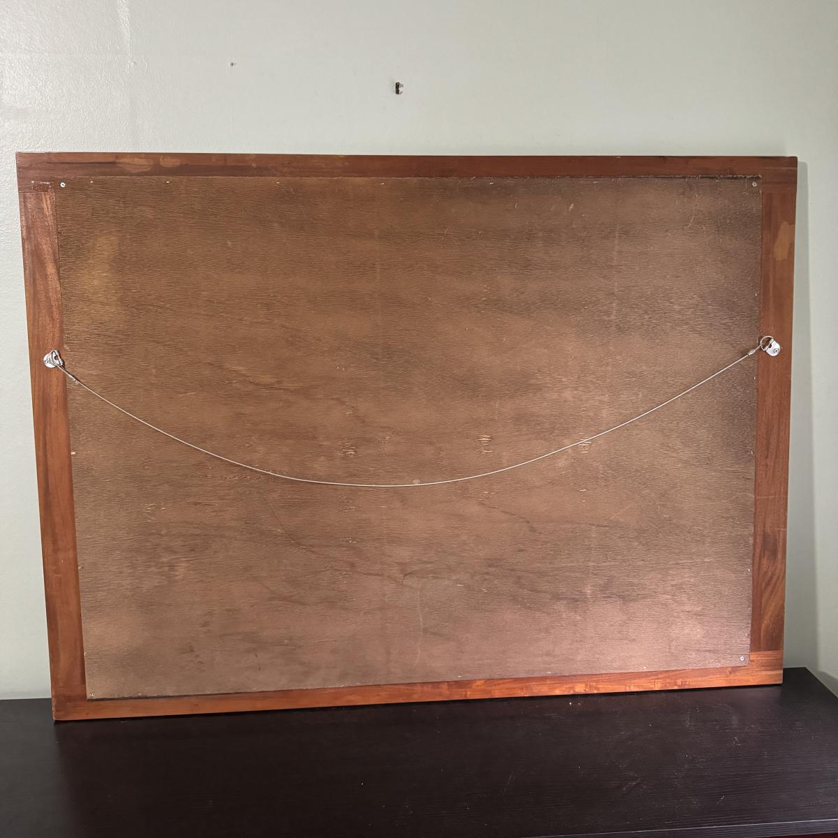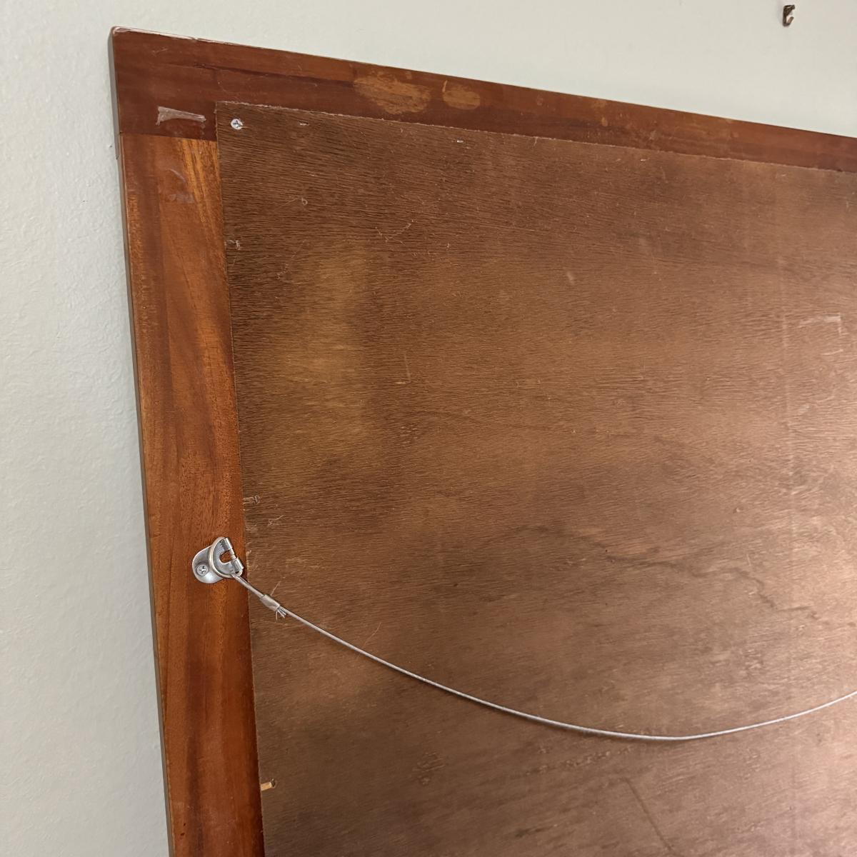 Lovely wooden mirror with a mission style design. Cherry wood colored wood and beveled mirror. Measures 44” x 32”. Local pick up only