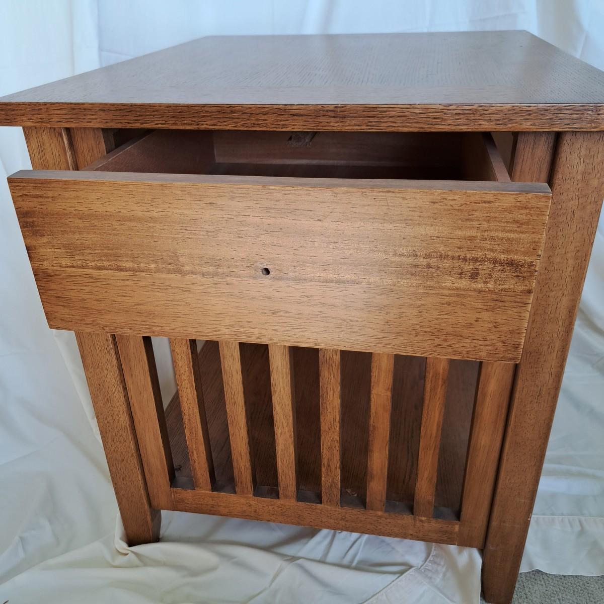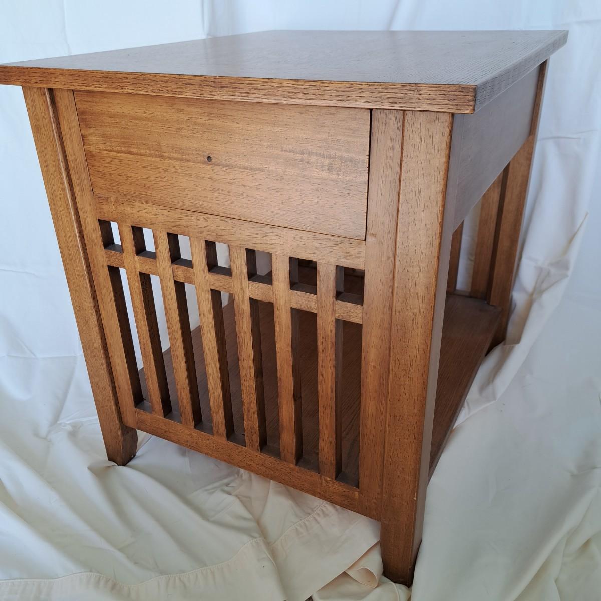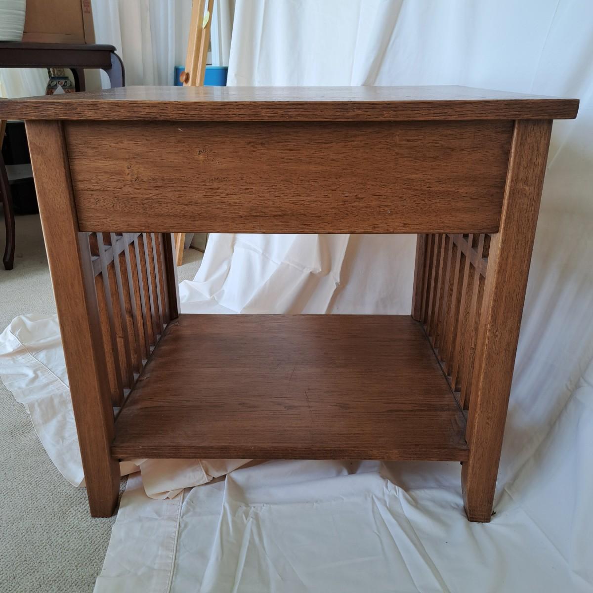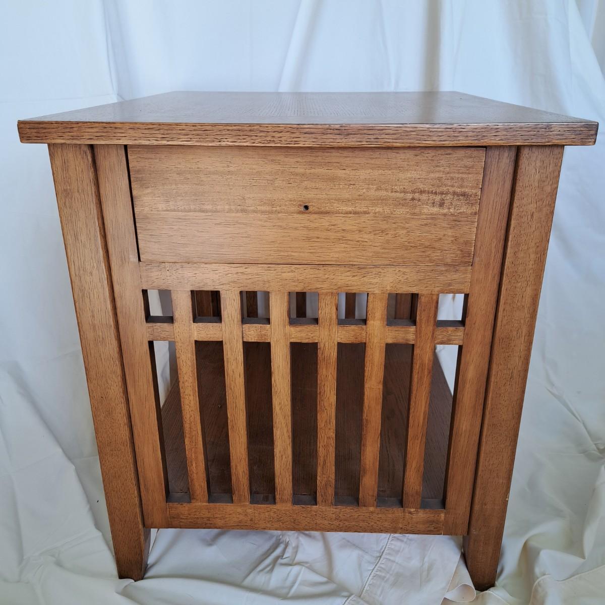 A nice Mission-style wooden (oak veneer) side table, 26" x 22" x 24"H, with one drawer, missing a knob as shown, but which can be easily fixed! Has a tiny chip of veneer loss on one corner. No maker's mark visible. Heavy piece. Local pickup only.