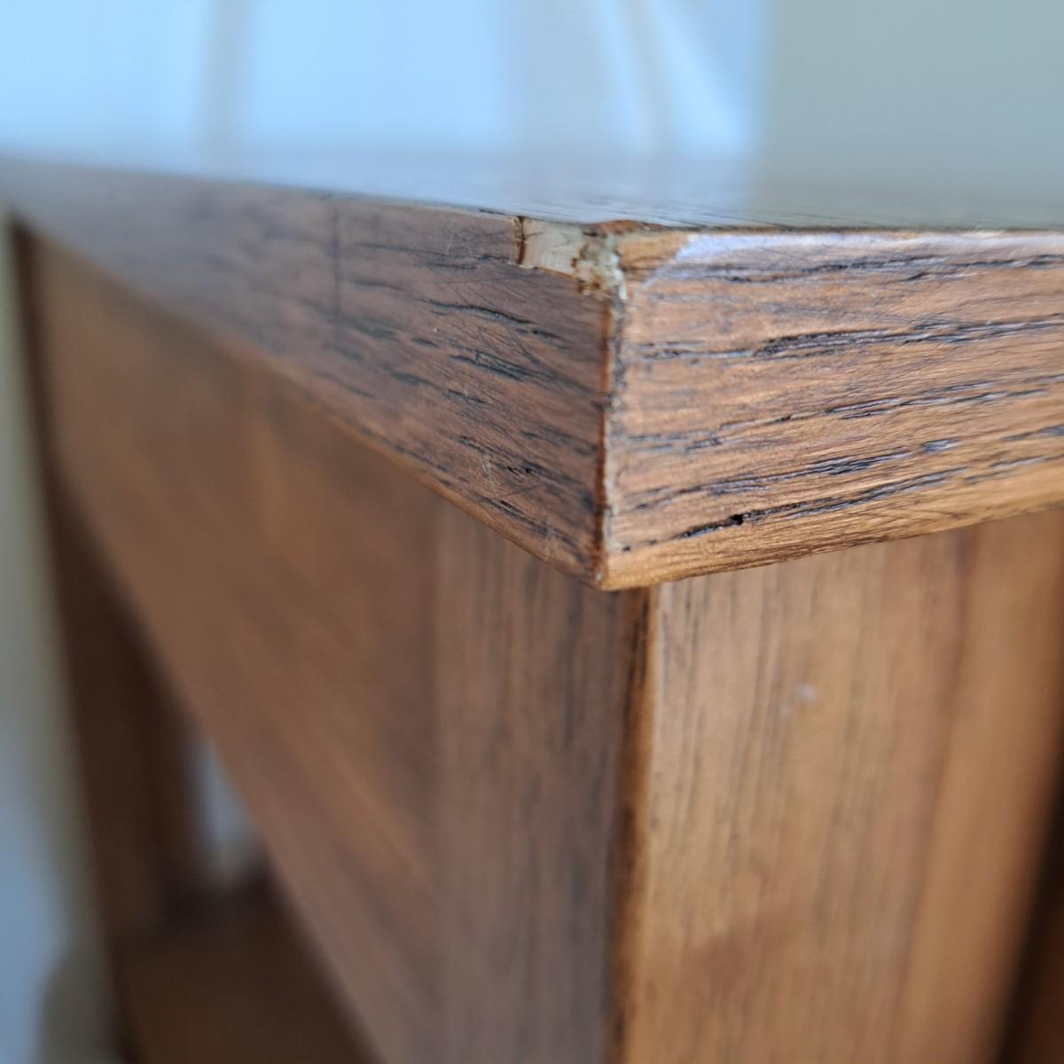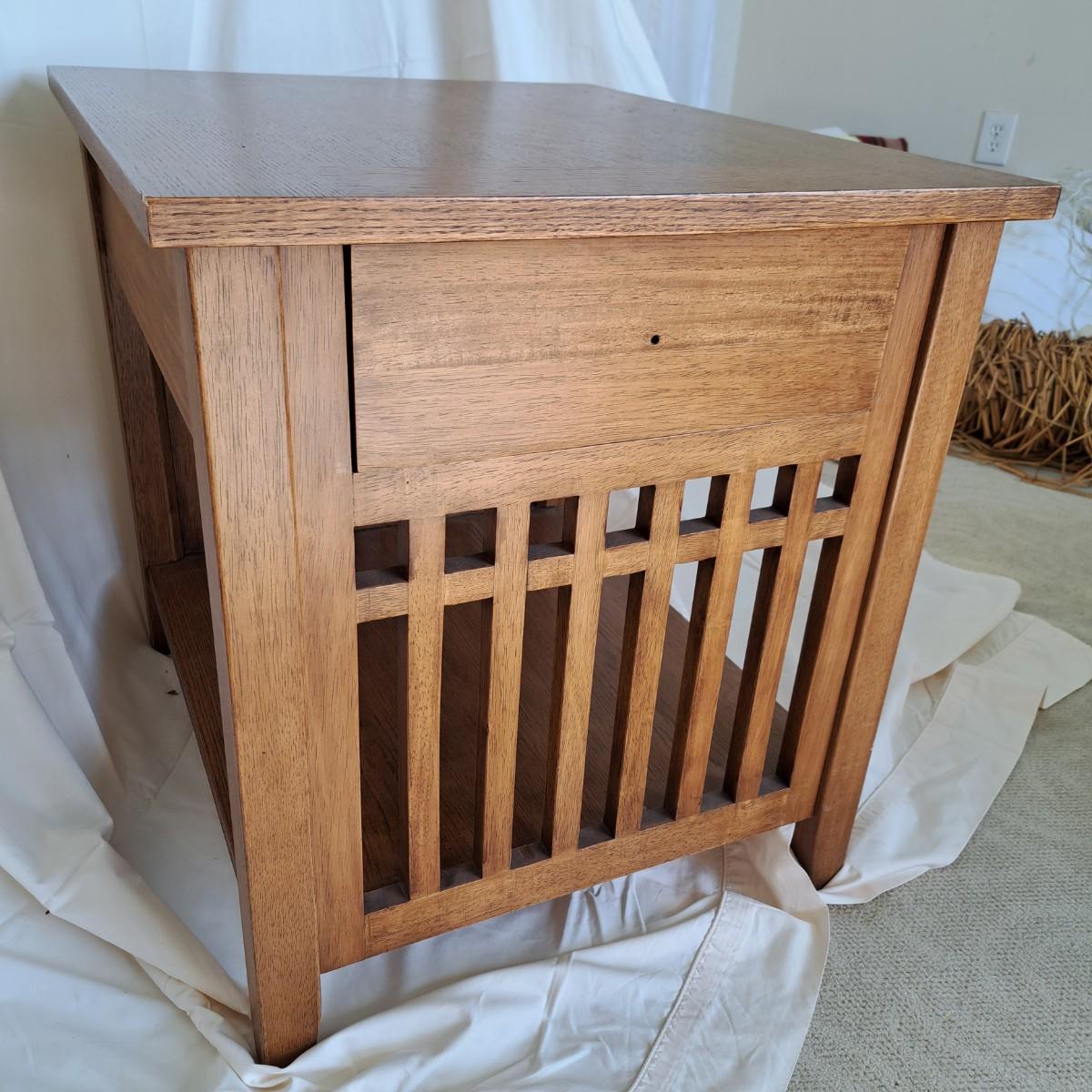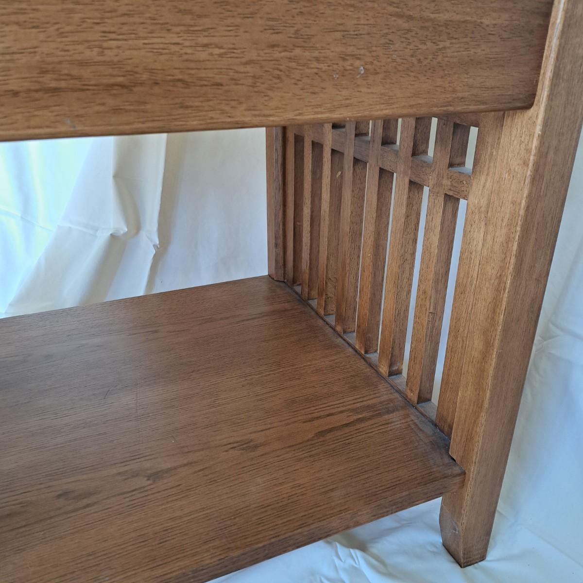 A nice Mission-style wooden (oak veneer) side table, 26" x 22" x 24"H, with one drawer, missing a knob as shown, but which can be easily fixed! Has a tiny chip of veneer loss on one corner. No maker's mark visible. Heavy piece. Local pickup only.