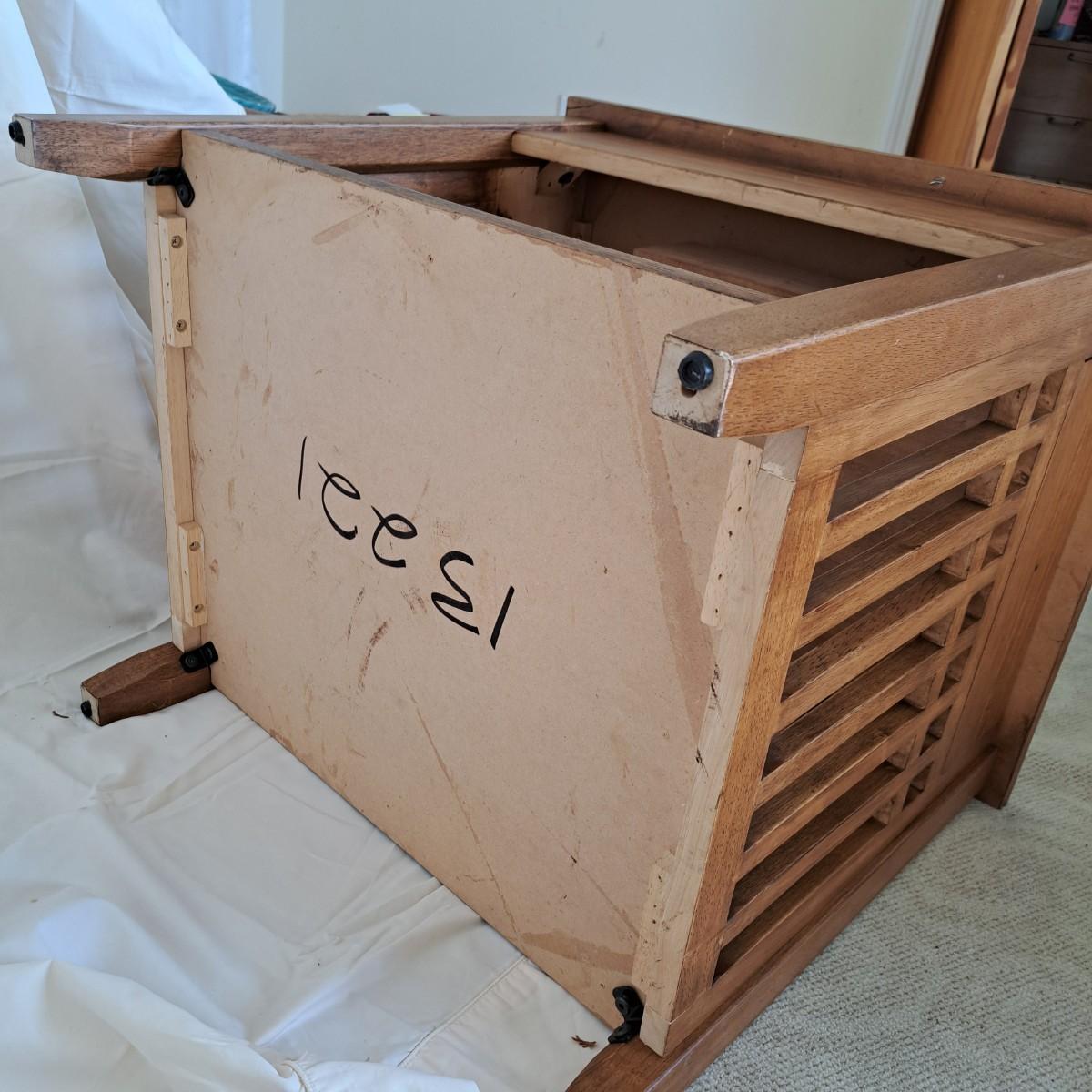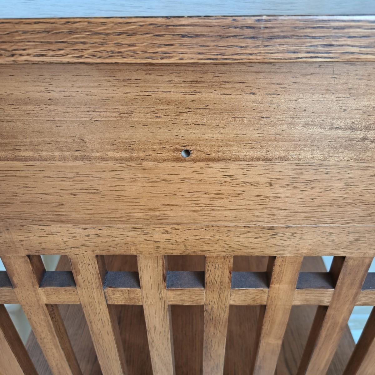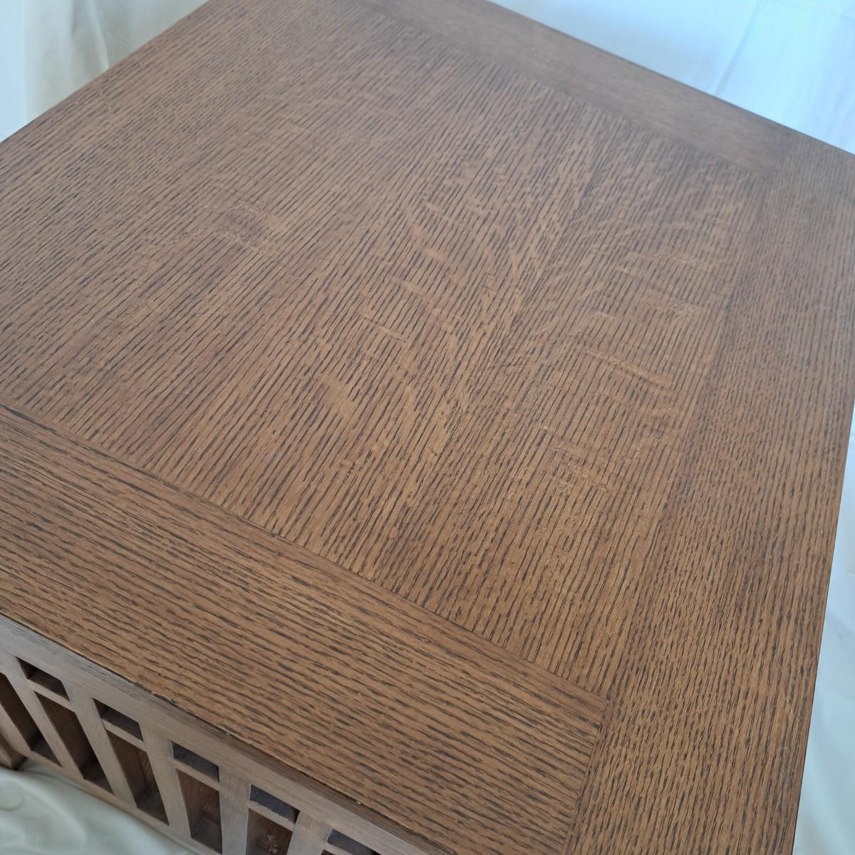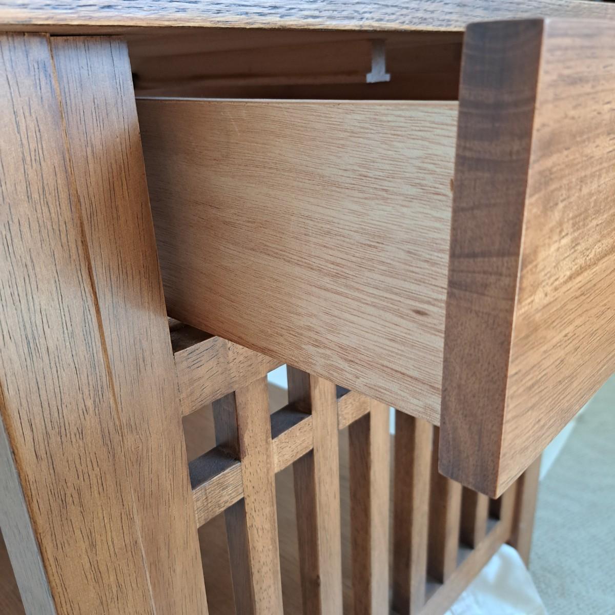 A nice Mission-style wooden (oak veneer) side table, 26" x 22" x 24"H, with one drawer, missing a knob as shown, but which can be easily fixed! Has a tiny chip of veneer loss on one corner. No maker's mark visible. Heavy piece. Local pickup only.