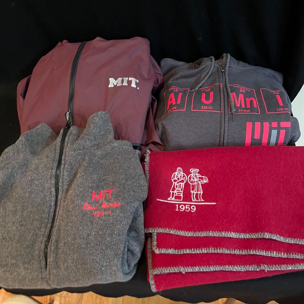 This lot includes a variety of Massachusetts Institute of Technology (MIT) merch. The lot includes three MIT jackets, a blanket, a couple MIT books, a glass cup, and more. The three jackets are all size XL. The books have some wear (see photos). Shipping available.