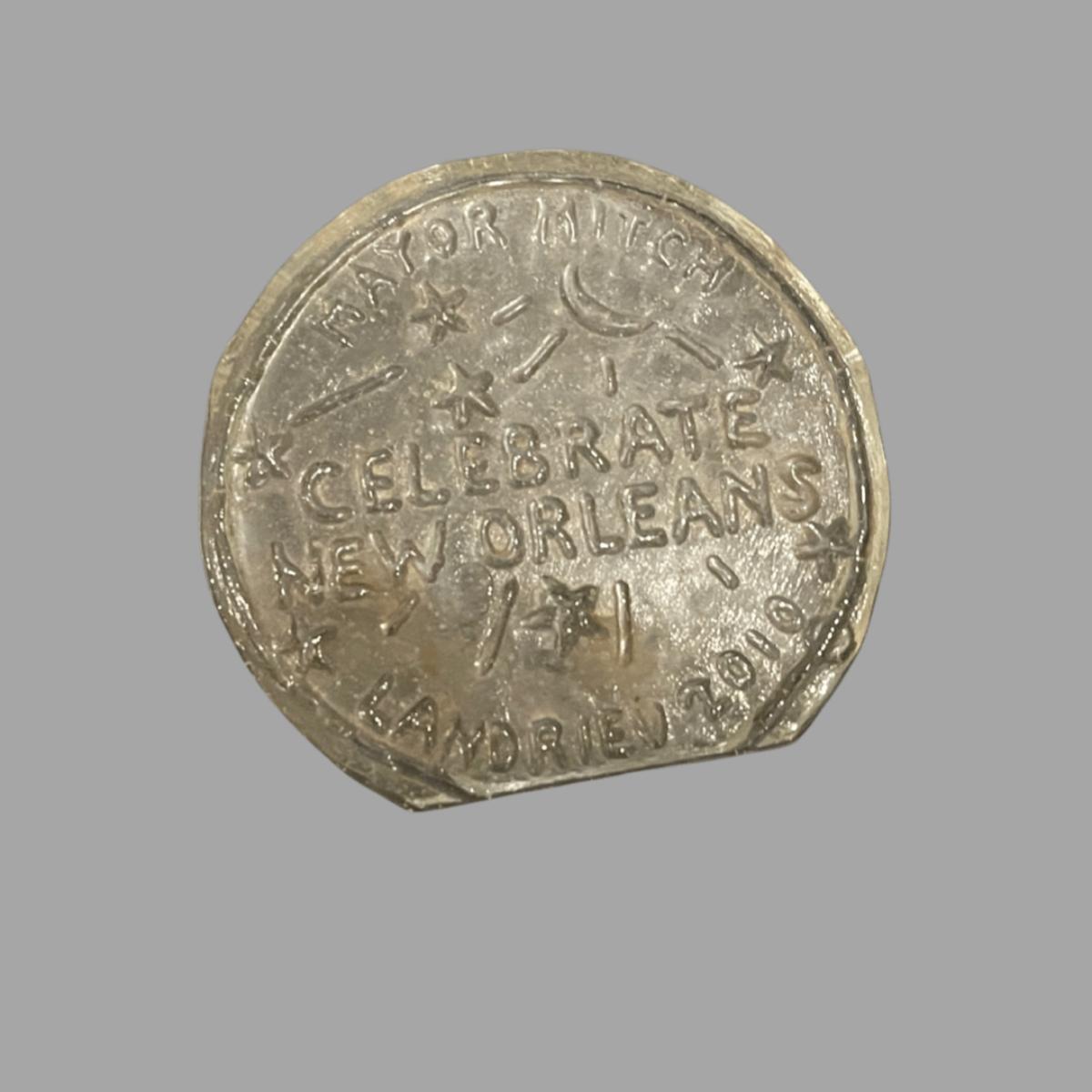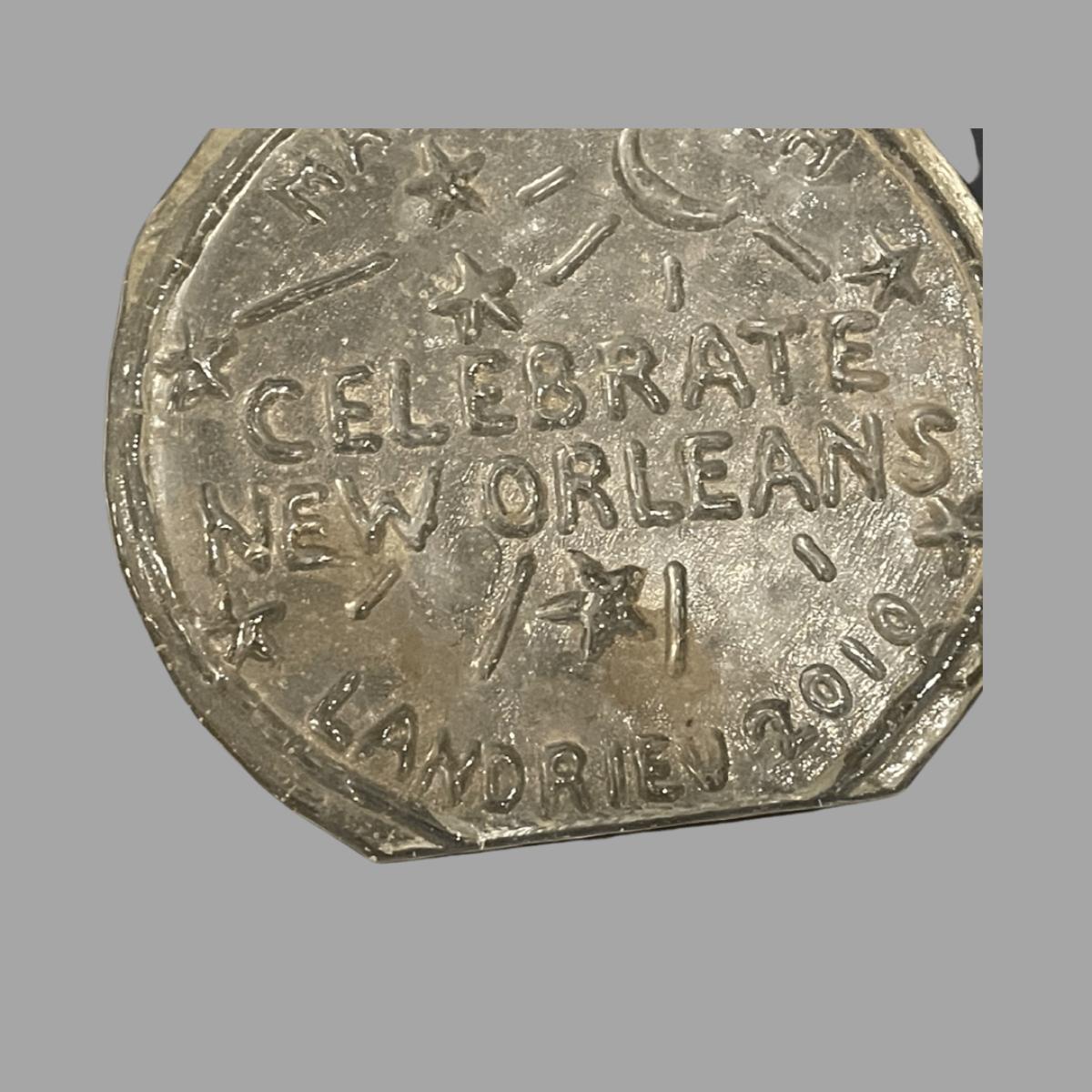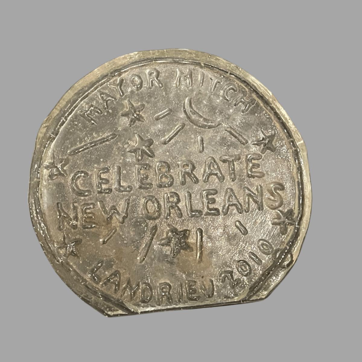 This is a glass souvenir from Mitch Landrieu’s 2010 inauguration. It’s a 5” glass circle piece.