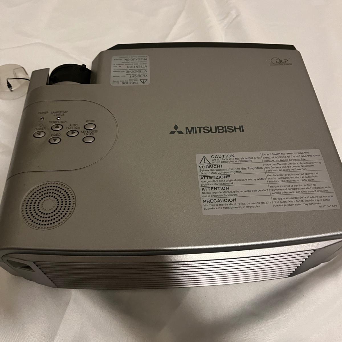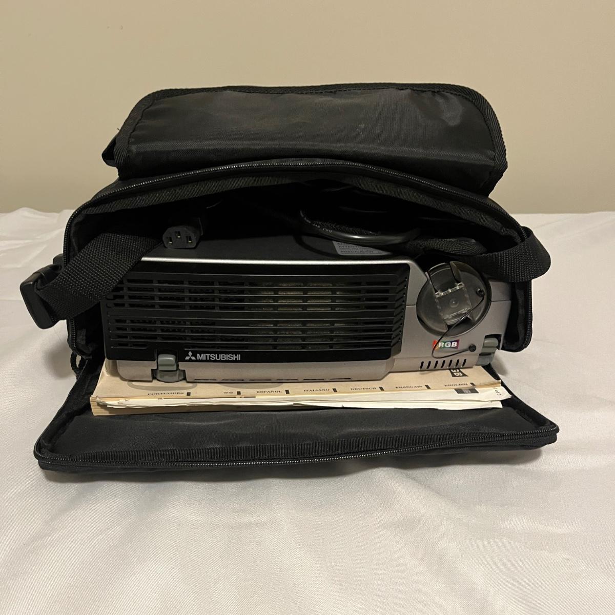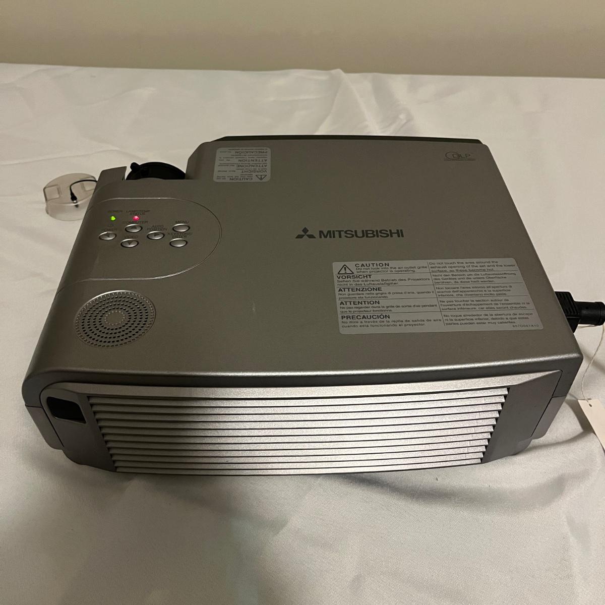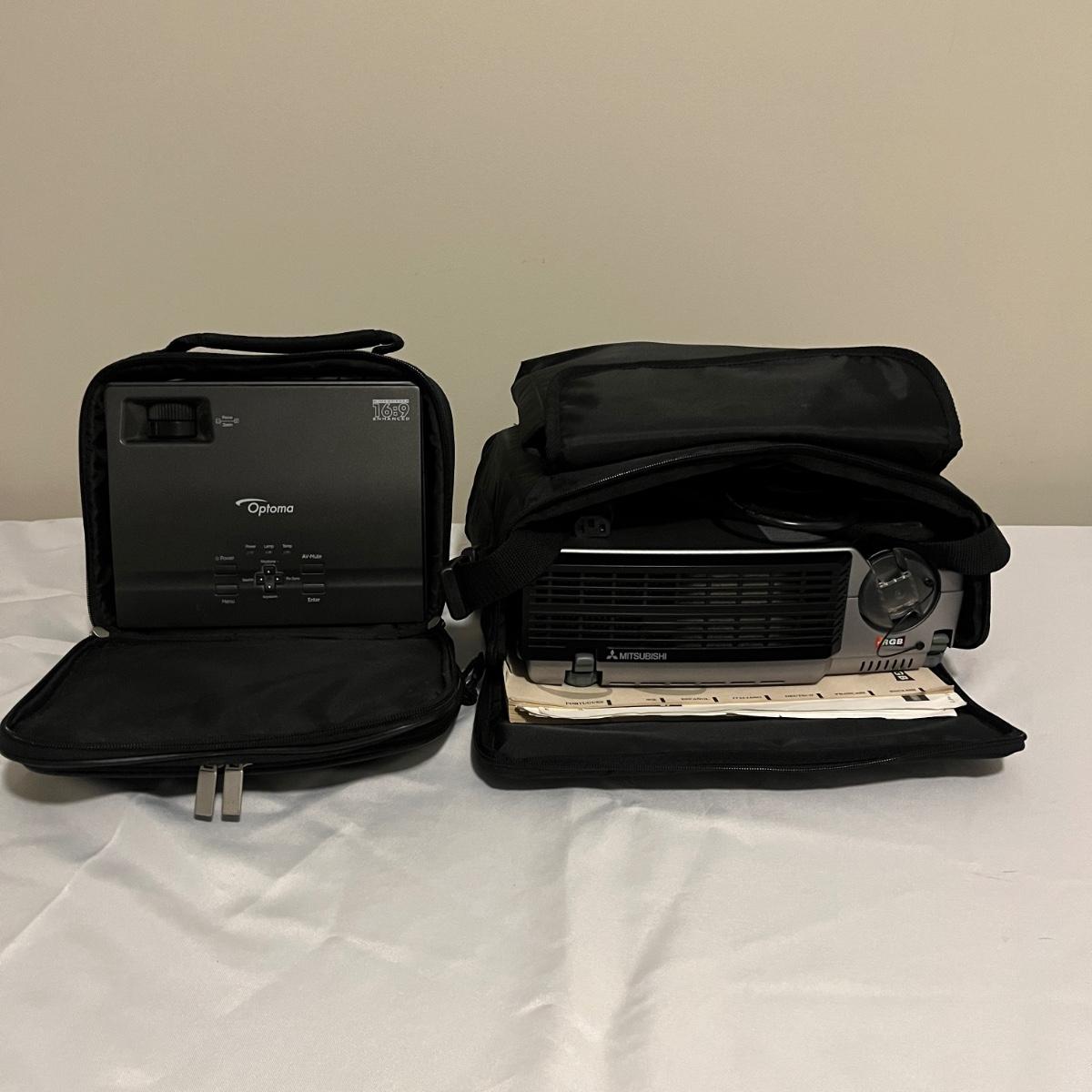 Lot includes a Optoma projector with carrying case, remote and original box and a Mitsubishi projector with carrying case, remote and owners manual. Both items powered on when plugged in, remote was not tested.