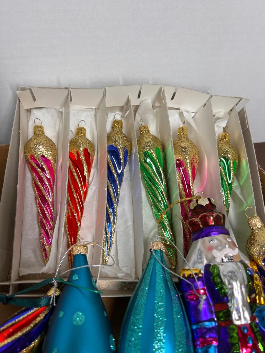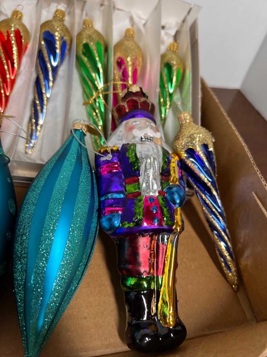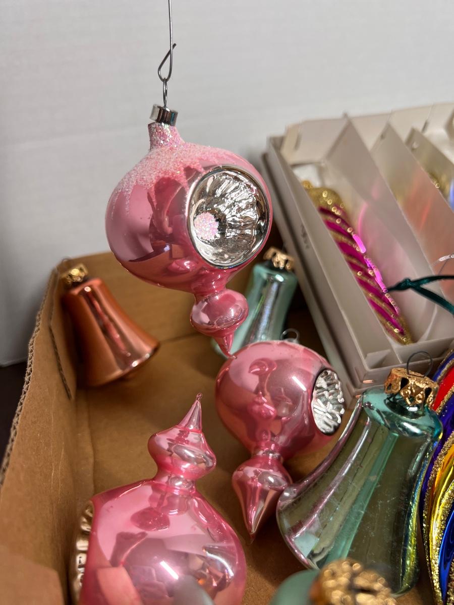 Some vintage and some contemporary glass Christmas ornaments. Varying sizes. Santa has paint chip as shown in pics