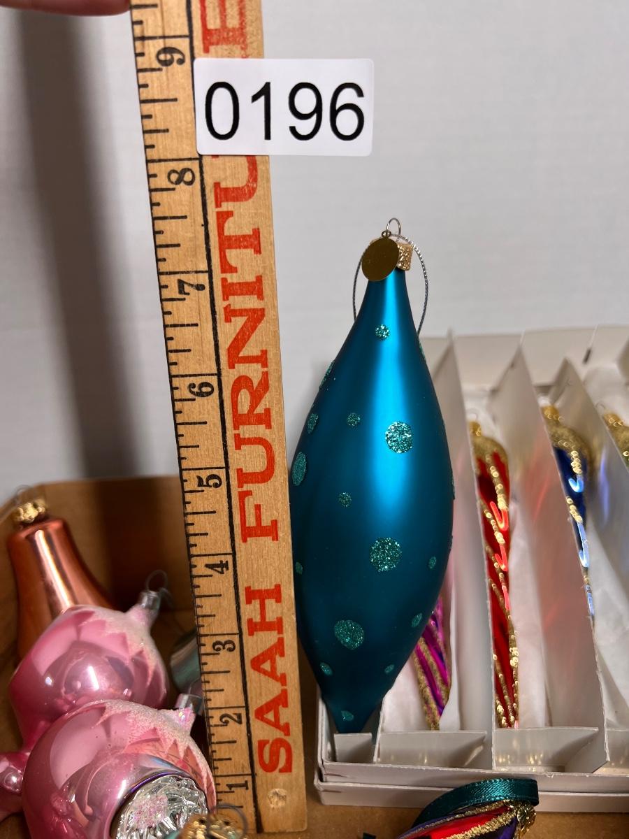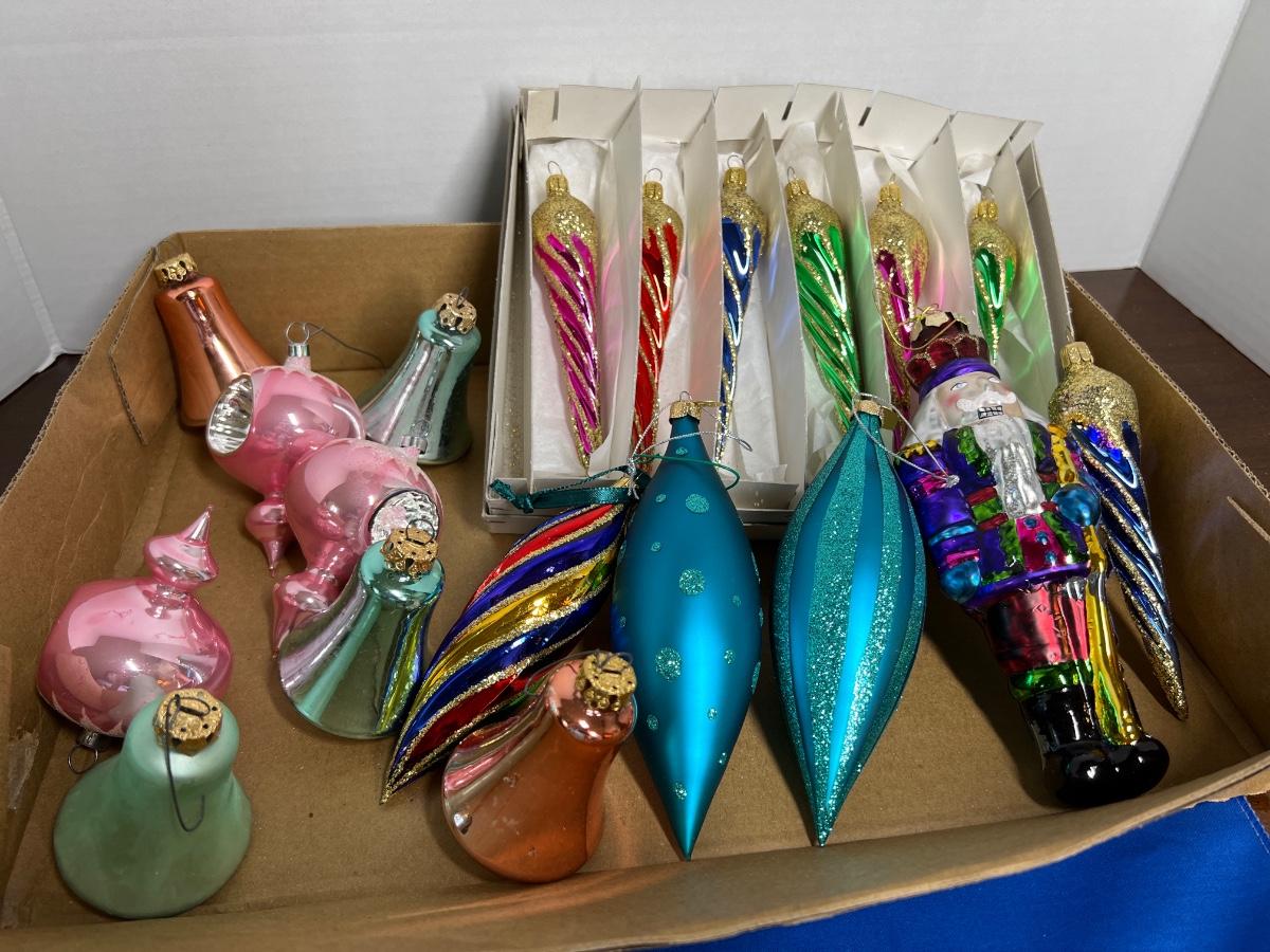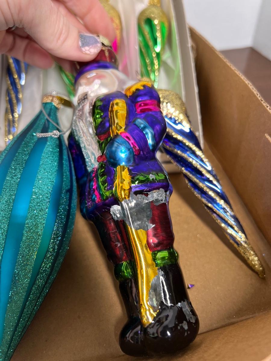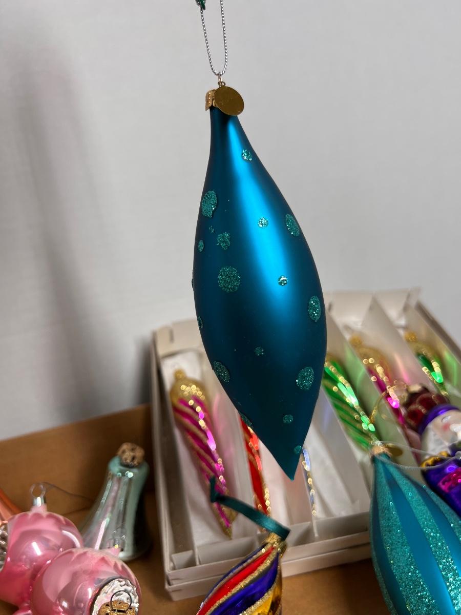 Some vintage and some contemporary glass Christmas ornaments. Varying sizes. Santa has paint chip as shown in pics