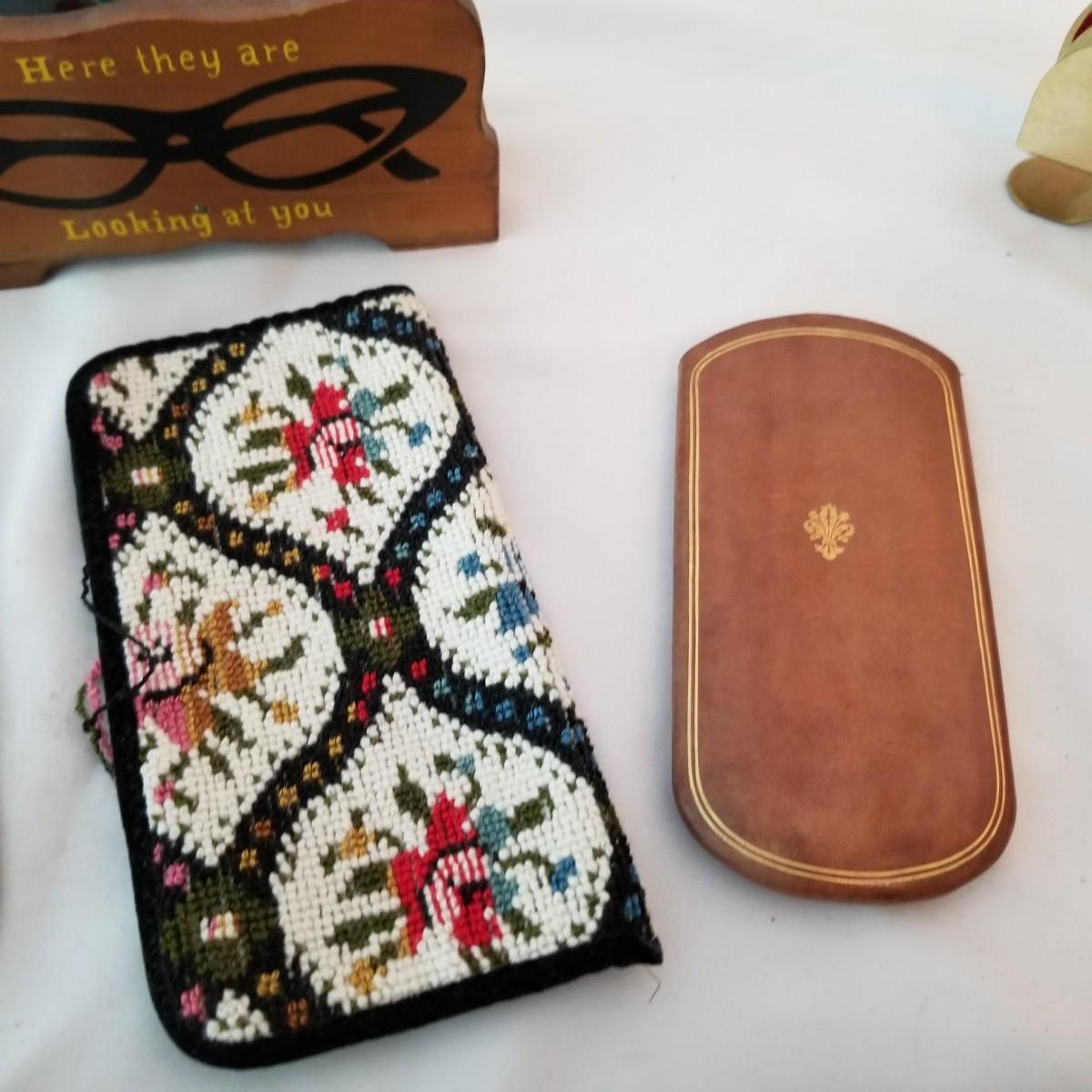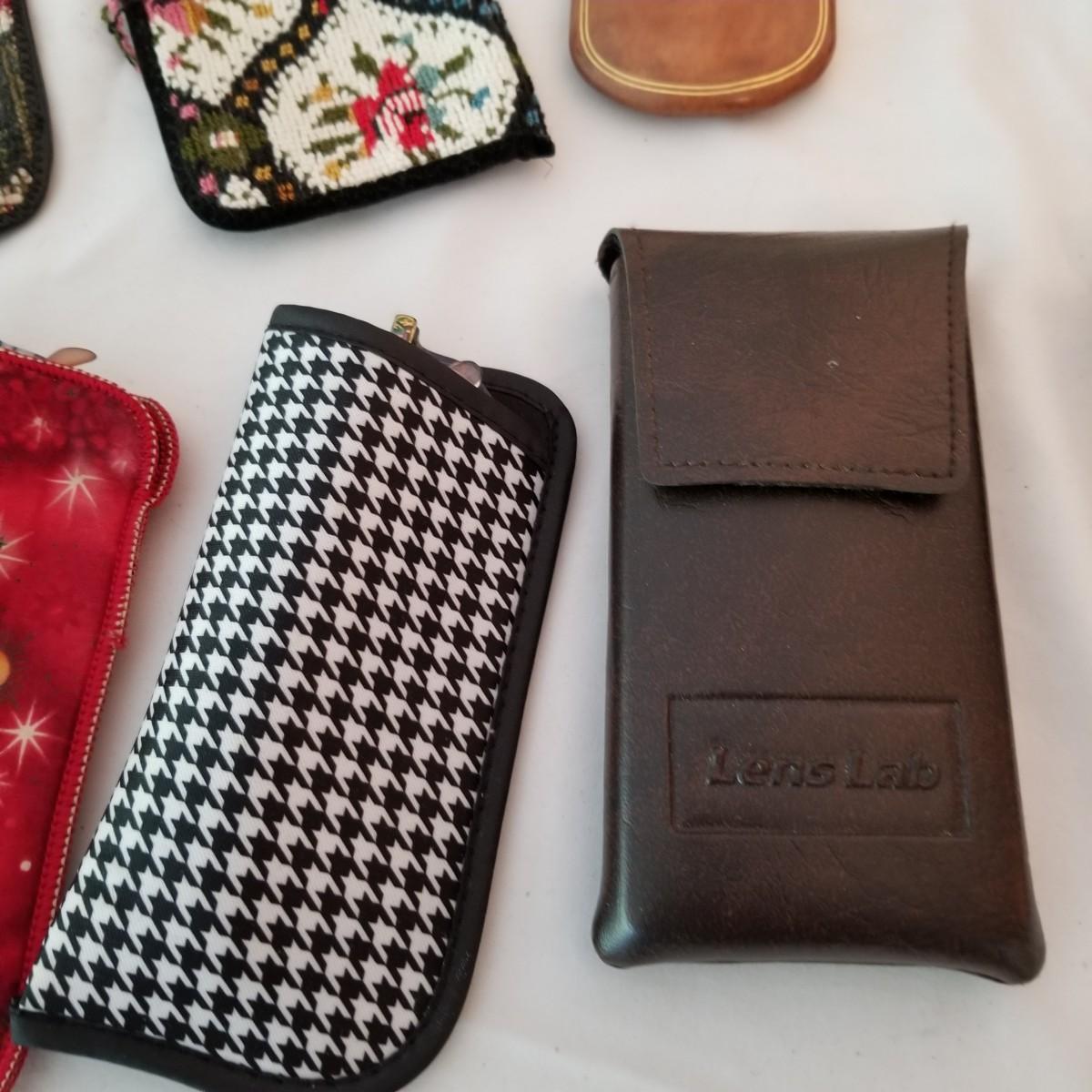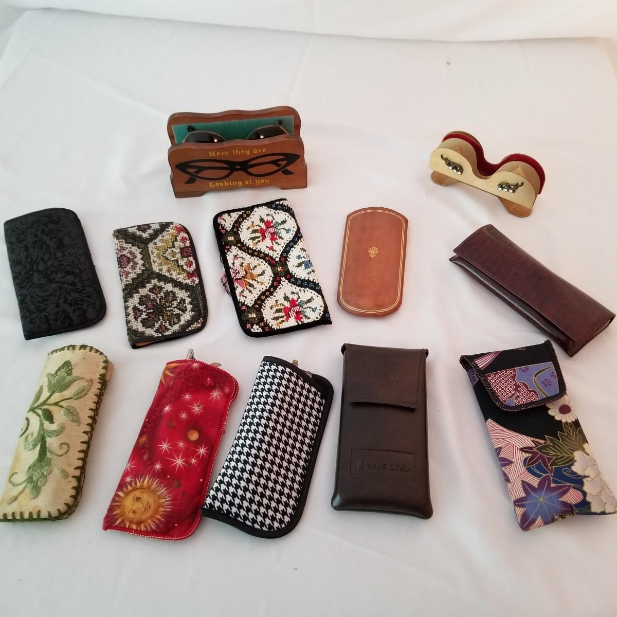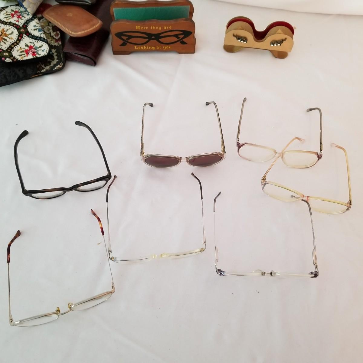 Retro frames and cases plus two desktop eyeglass holders. Ten cloth and pleather cases, seven pairs of mild prescription glasses. See photos for detail. Shipping available.