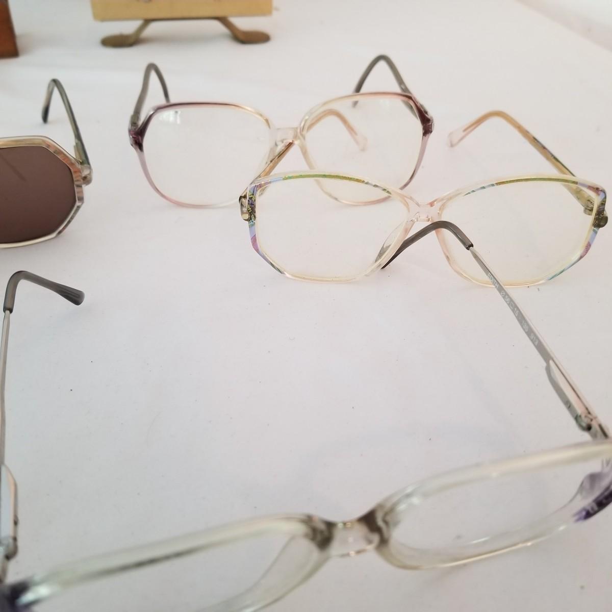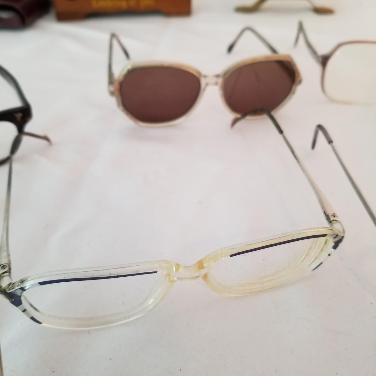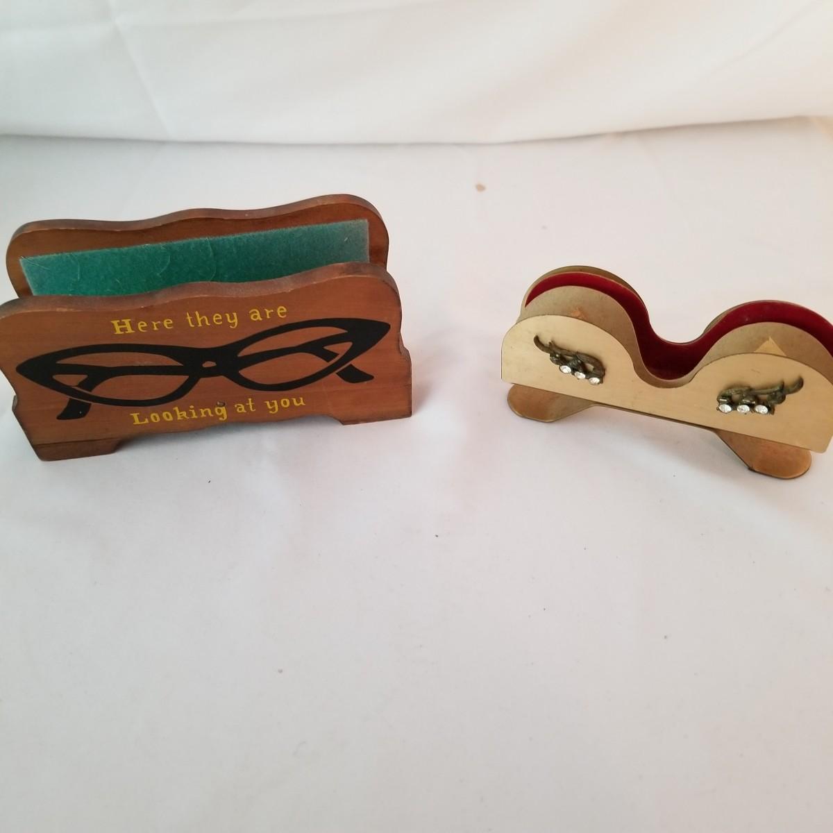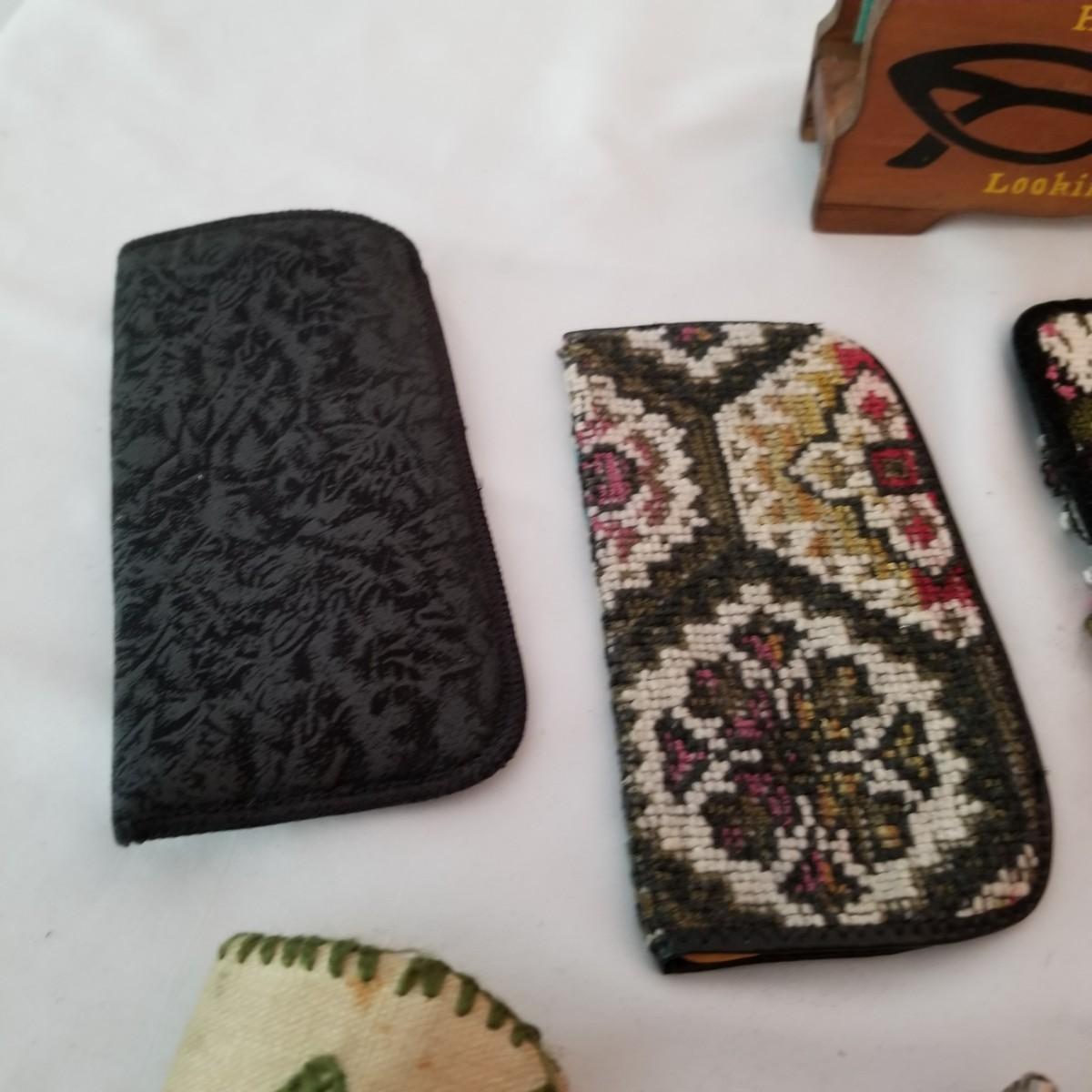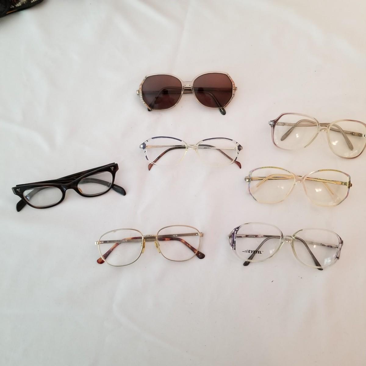Retro frames and cases plus two desktop eyeglass holders. Ten cloth and pleather cases, seven pairs of mild prescription glasses. See photos for detail. Shipping available.