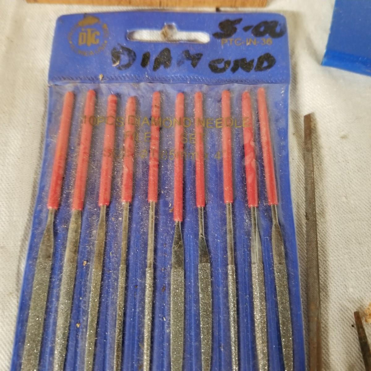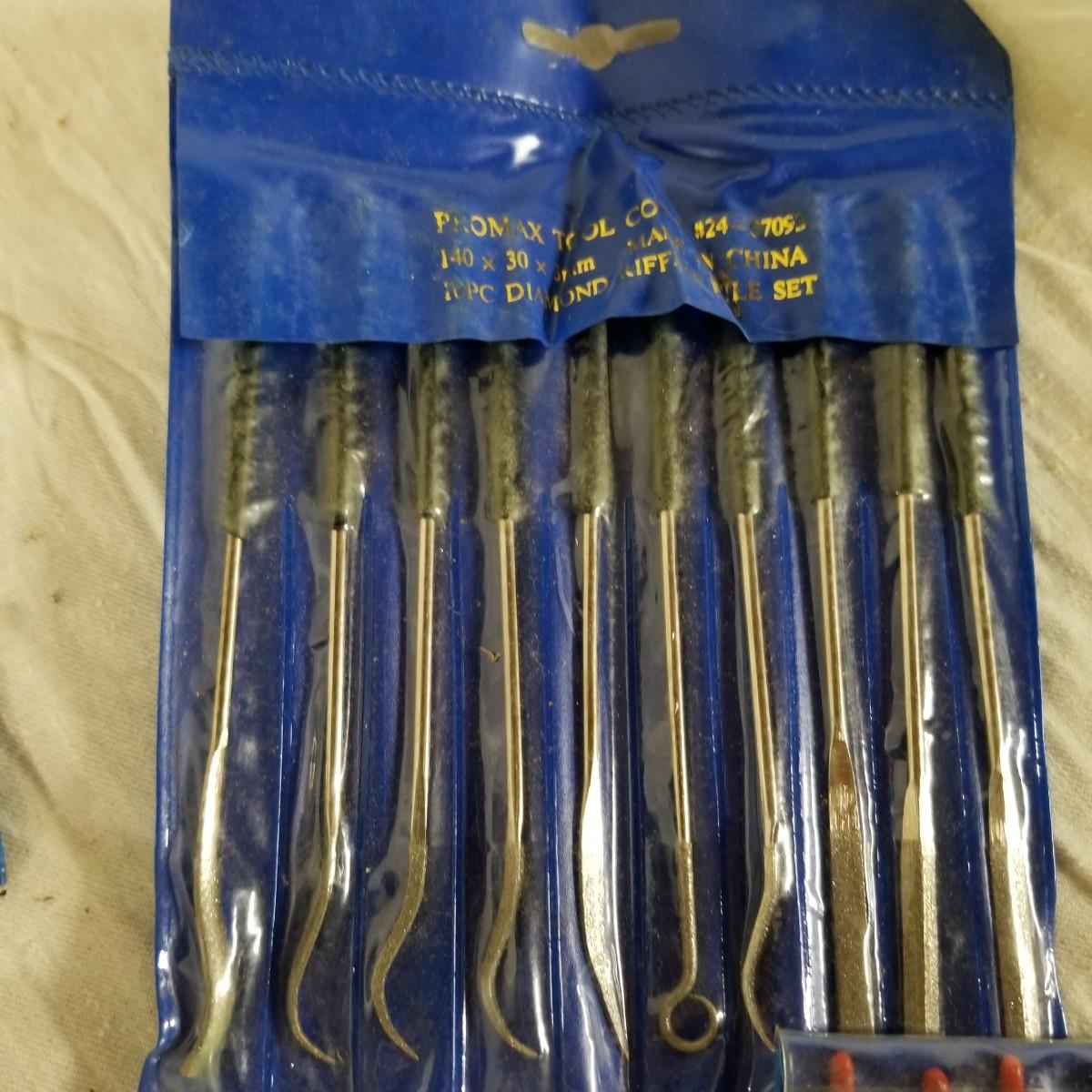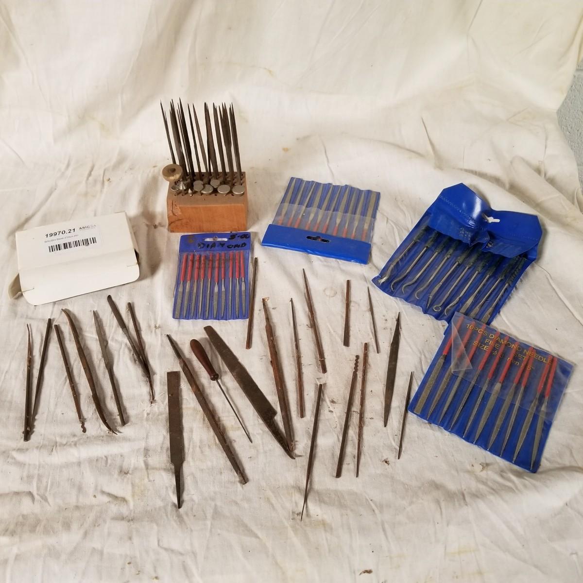 Assortment of small files rifflers and picks.  Some standard cut and some diamond.  Some appear to be new and others used.   Also includes box of 21mm steel brushes, new, and several diamond head tools.  Shipping available.