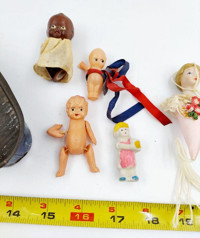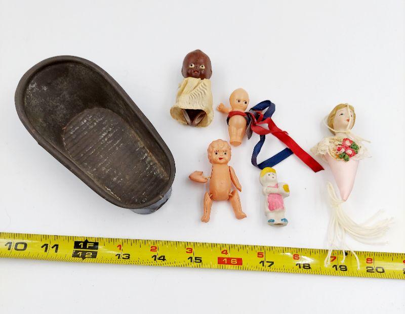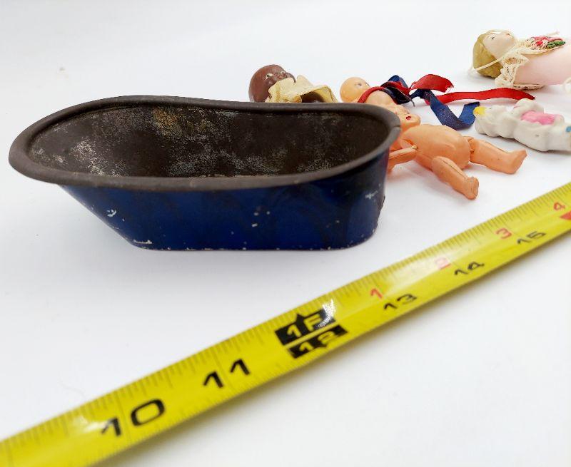 MIX UP OF SMALL DOLLS INCLUDING AN ANTIQUE METAL DOLL WASH TUB