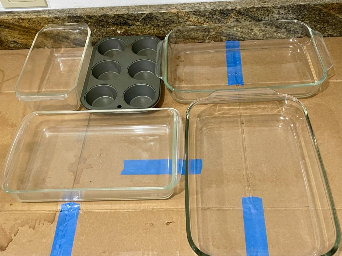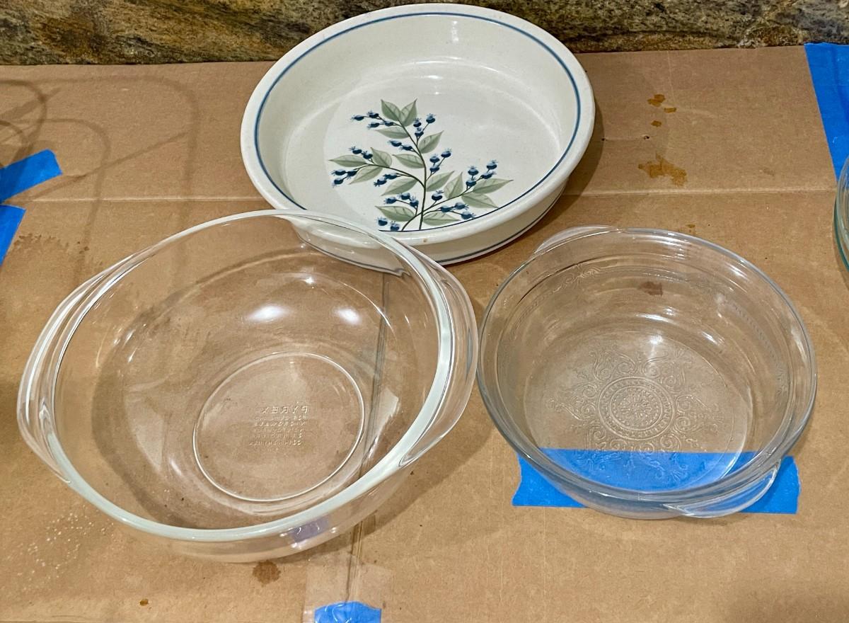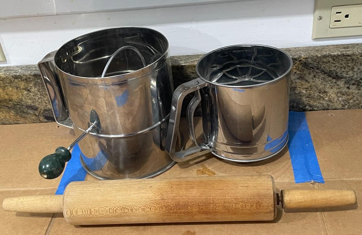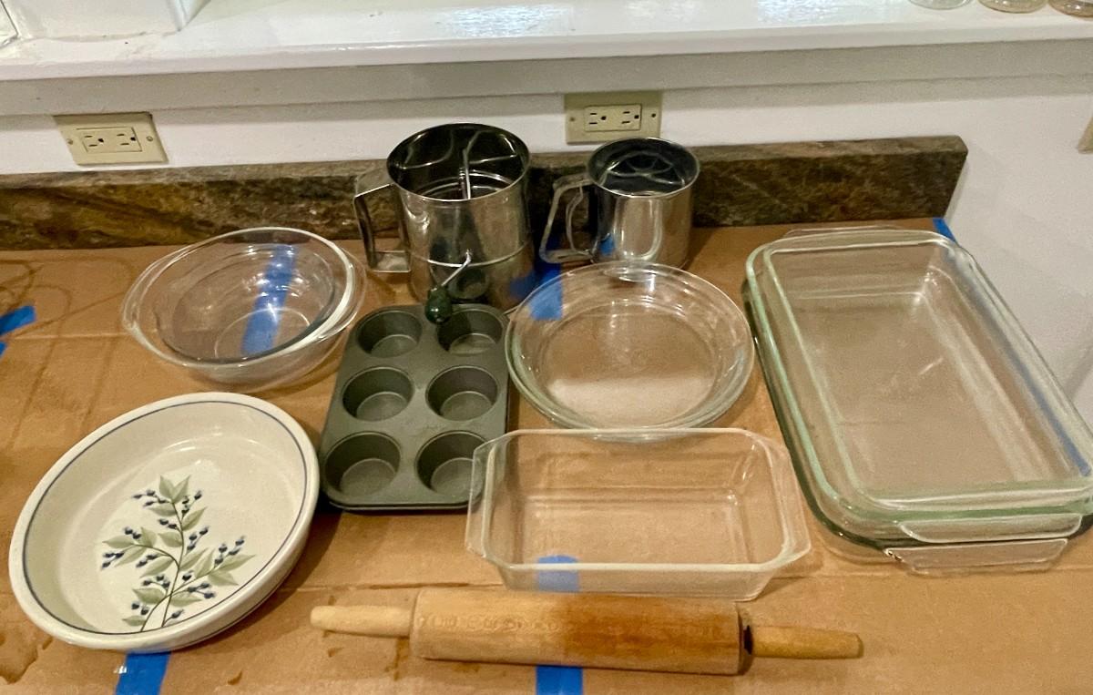 Includes rolling pin, Pyrex glass baking dishes, flour sifters and pie pans.