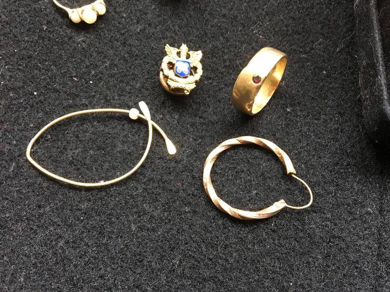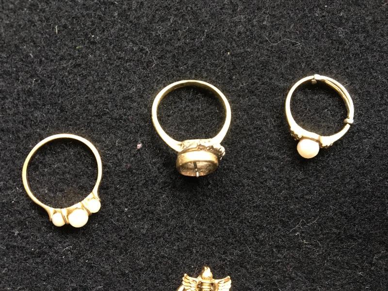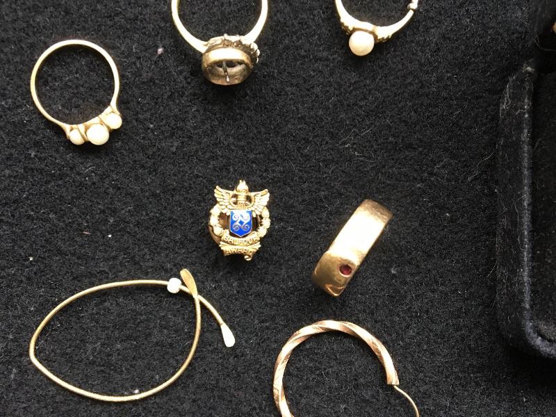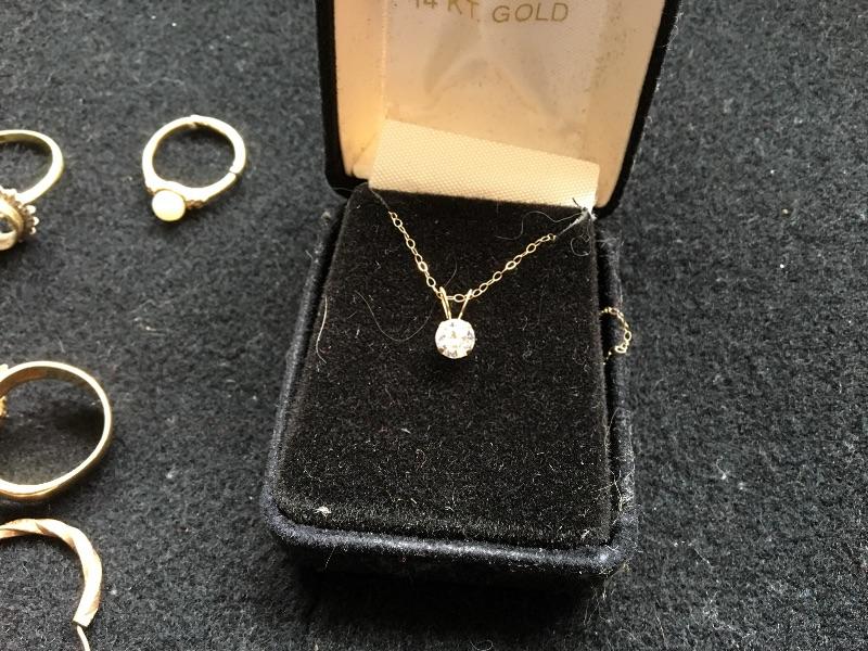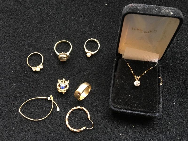 Nice lot consisting of 4 gold rings, one gold necklace with diamond pendant, one award pin and two odd earrings (untested). The pin is 10k and everything else is 14k. Total gold weight is over 13 grams. We offer packaging and shipping services!