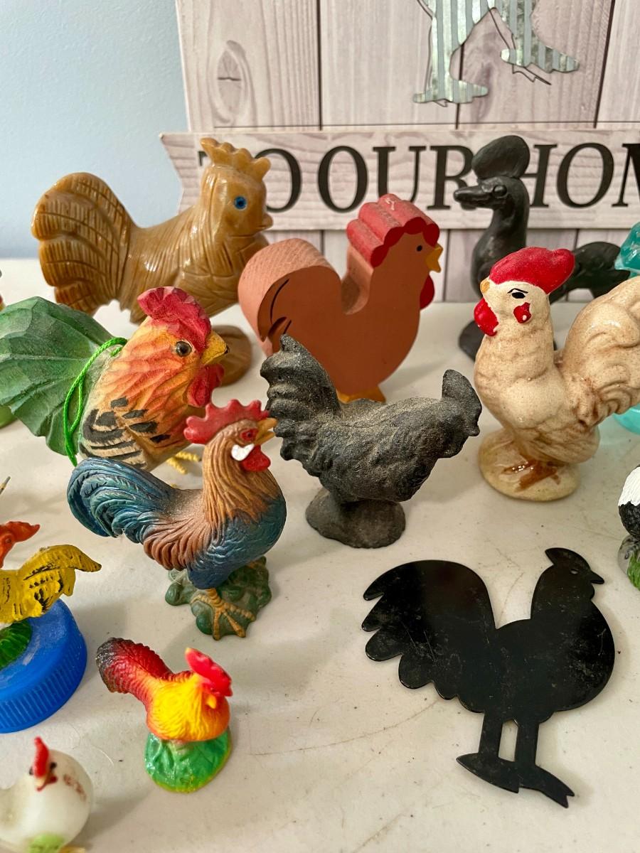 Includes plastic, wood, porcelain and metal rooster figurines.