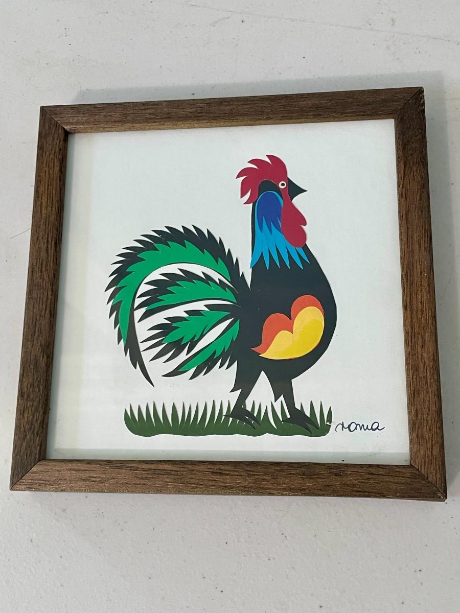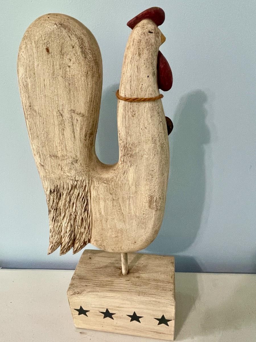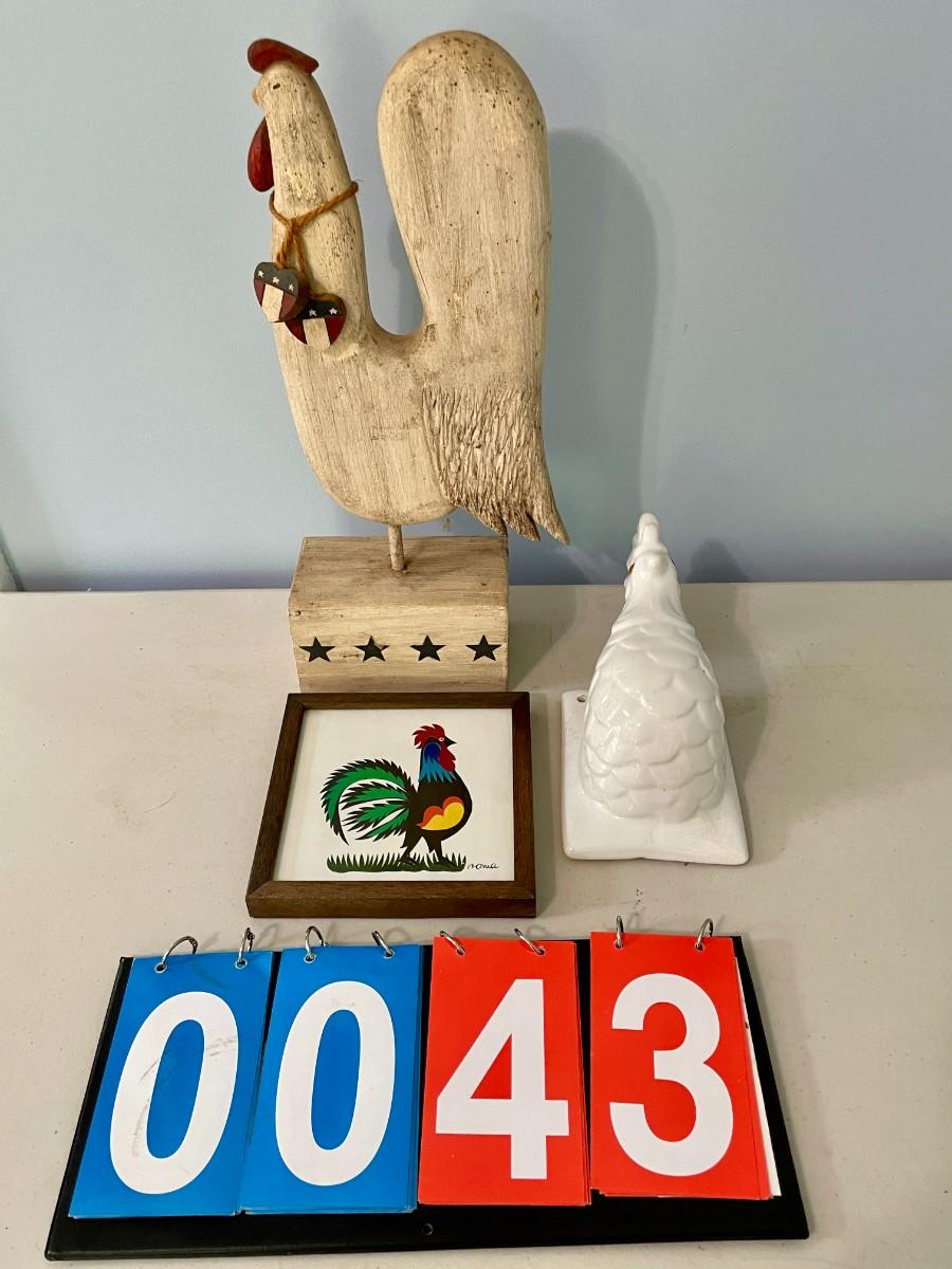 Includes wooden rooster, rooster trivet and ceramic wall head/hook.