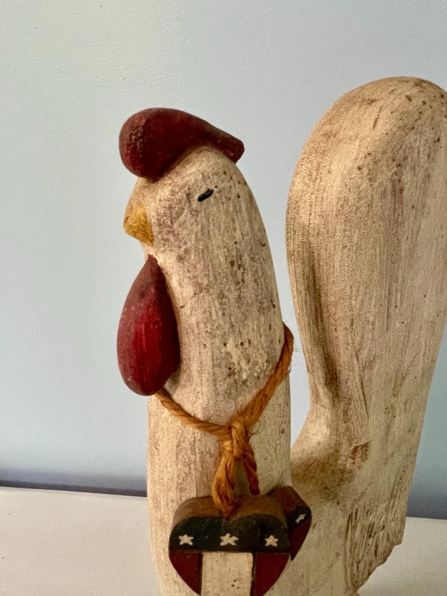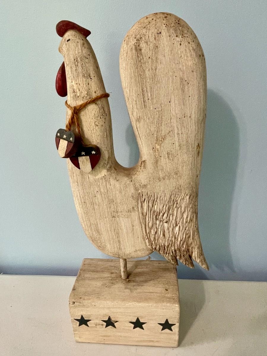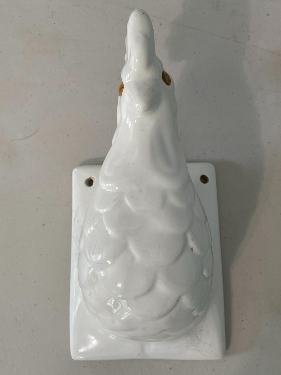 Includes wooden rooster, rooster trivet and ceramic wall head/hook.