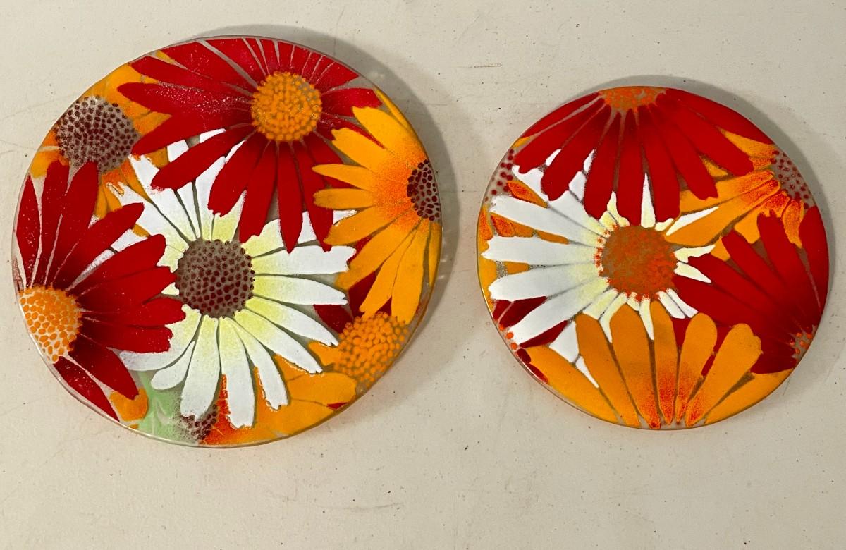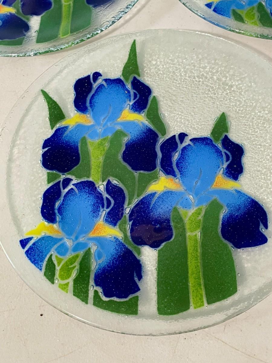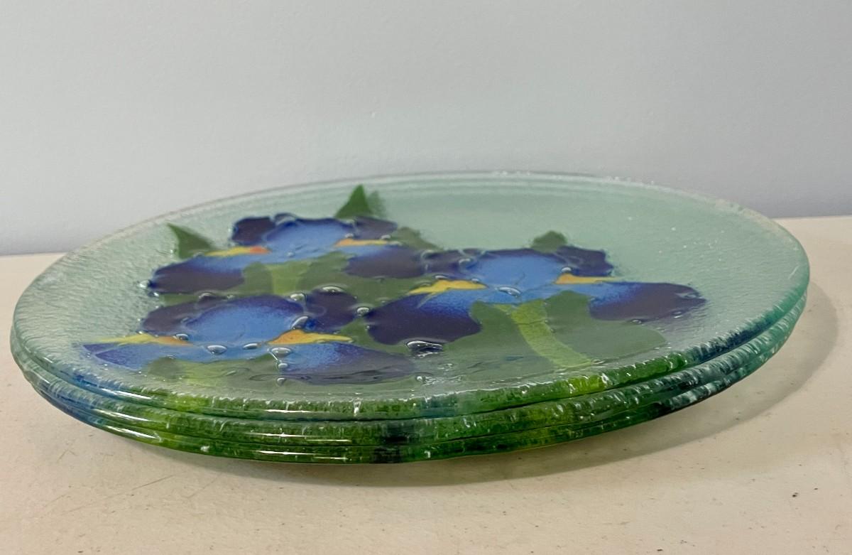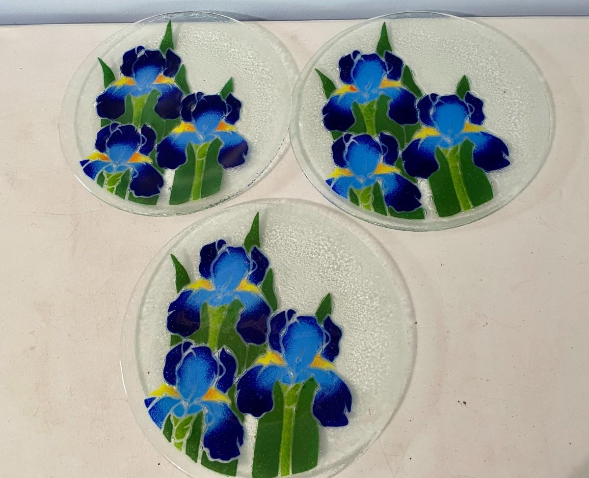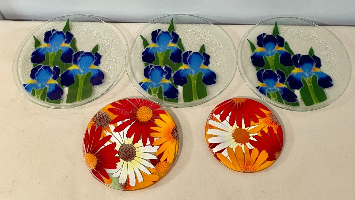 Includes three blue iris dinner plates and two red/orange daisy plates.