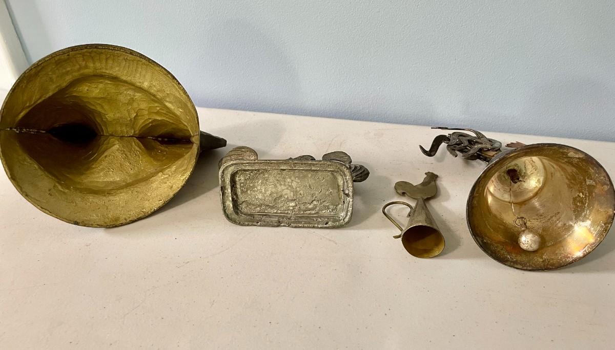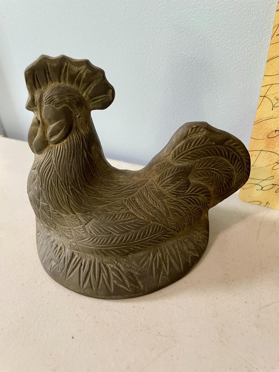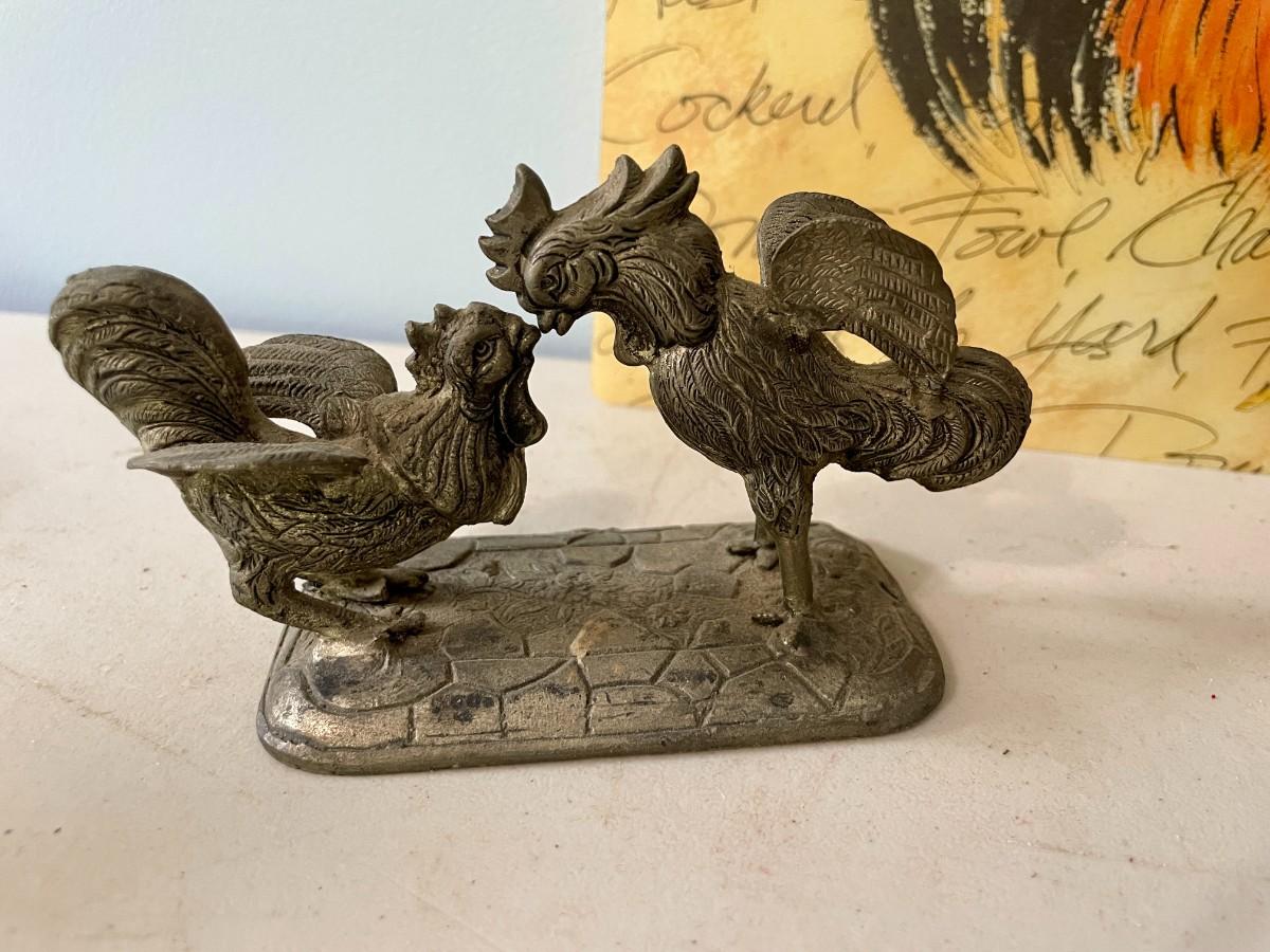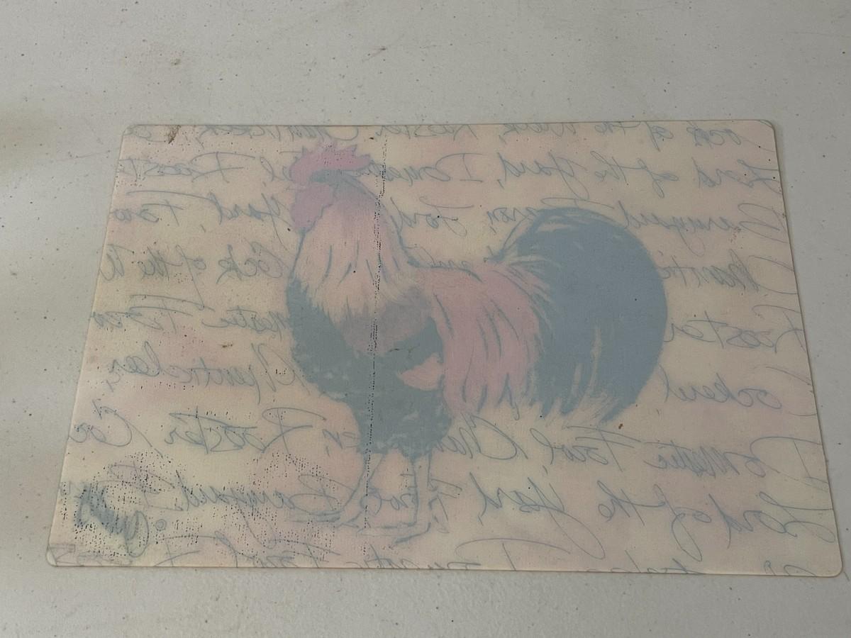 Mixed 5pc vintage lot of metal roosters + vinyl placemat