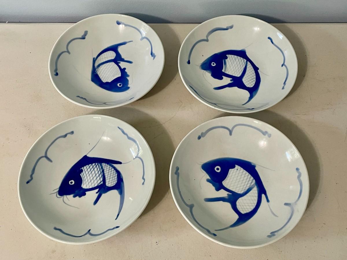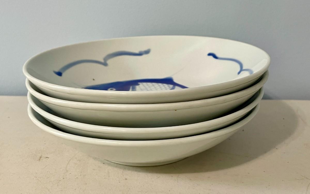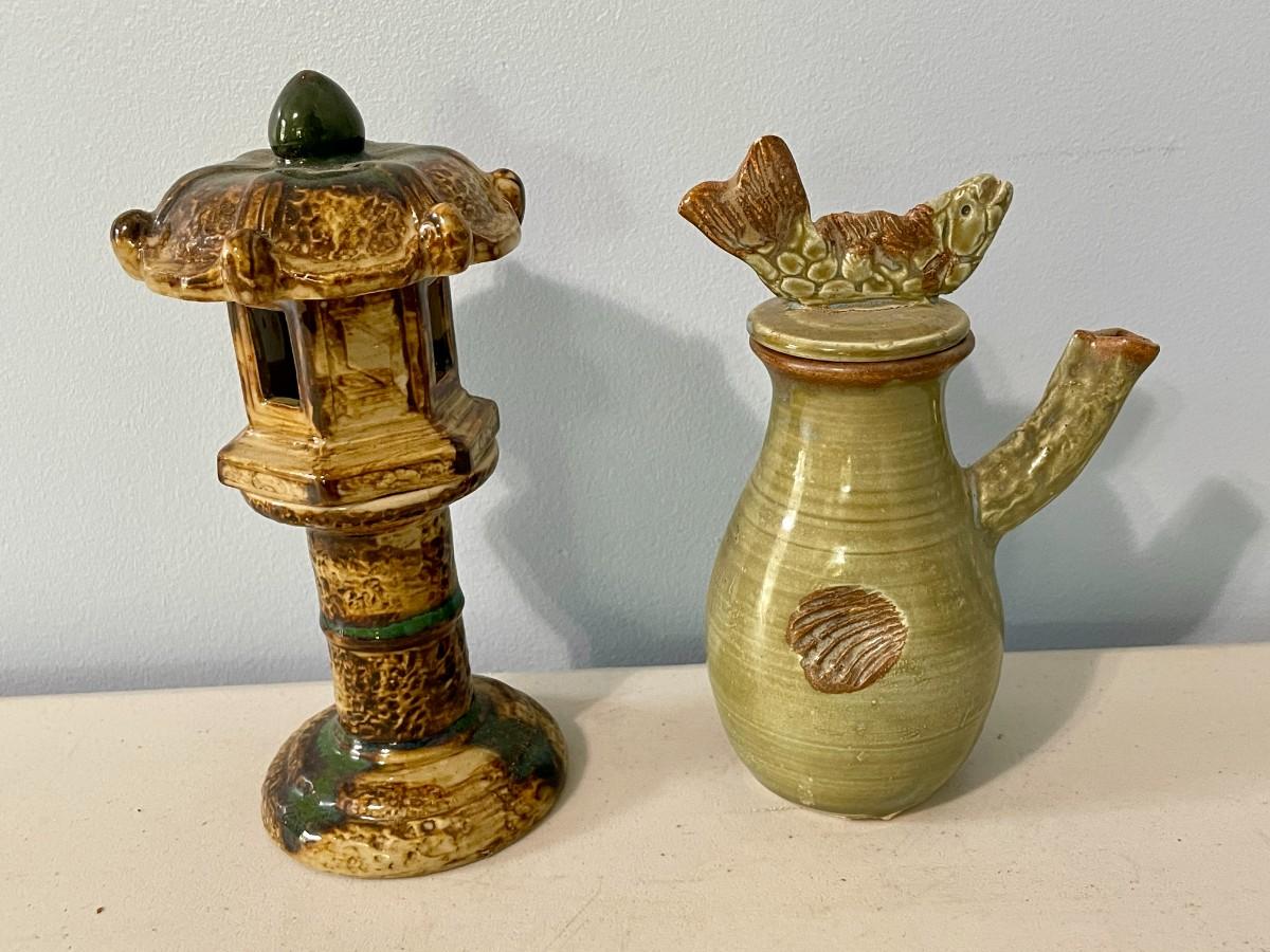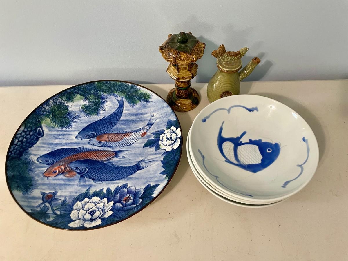 Includes koi platter, set of 4 fish rice bowls, pottery tea/saki pot, ceramic pagoda.