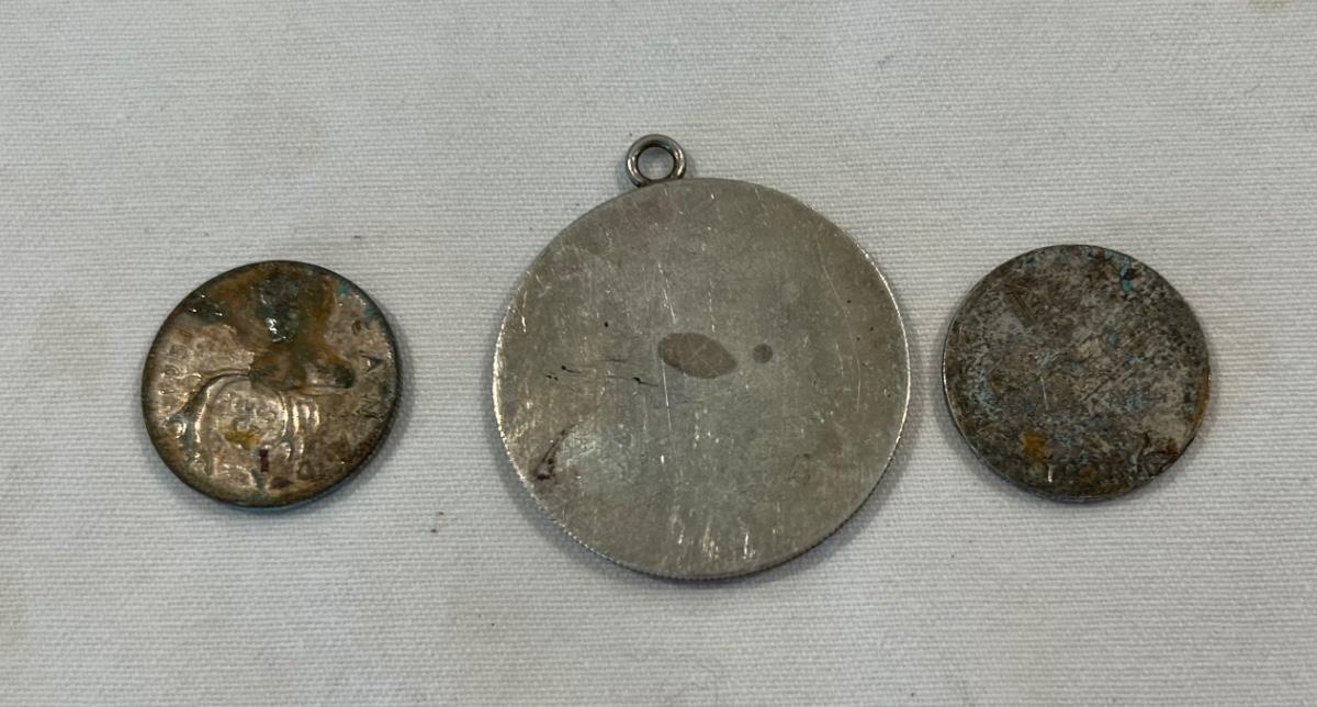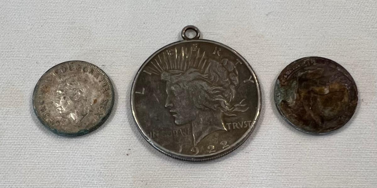 **WIRE TRANSFER IS REQUIRED IF SHIPPED.** [35.4g] This assortment contains a 1922 Peace Dollar in bezel, a 1961 Canadian quarter, and a U.S. Standing Liberty quarter. Silver content is 90%. Weight given is overall weight.