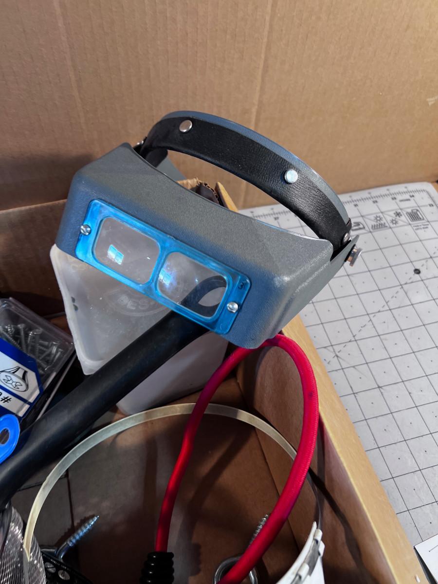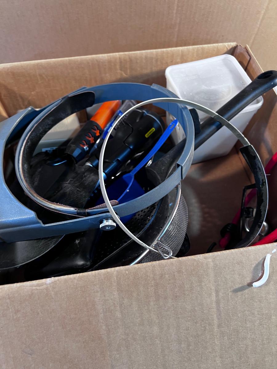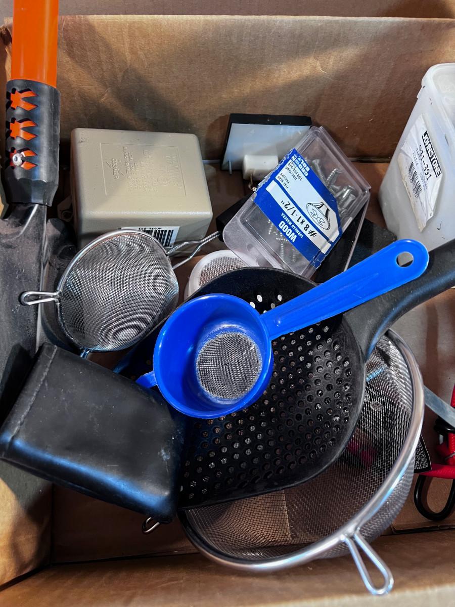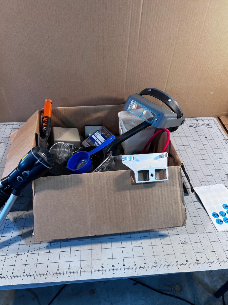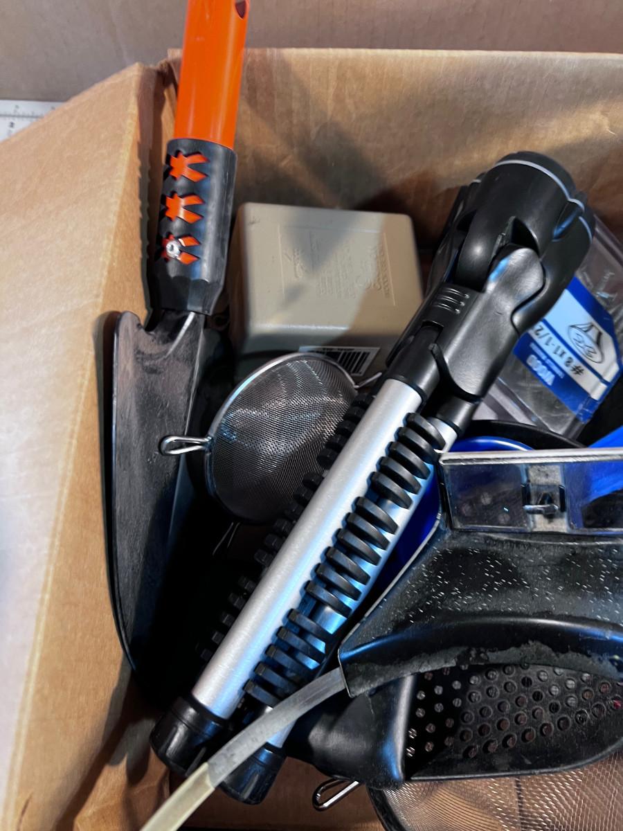 Mixed Box of Tools: Shovel, Flashlight, Magnifying Glasses