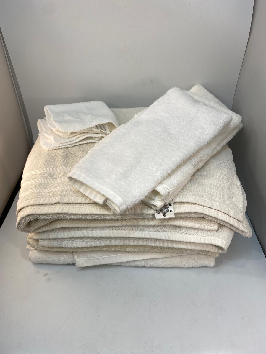 Mixed Brand Lot of White & Offwhite Bath Hand Towels Wash Cloths. Includes 4 large bath towels, 3 hand towels, and 2 wash cloths. In good previously owned condition. May be a light spot or two but the material feels soft on all towels.