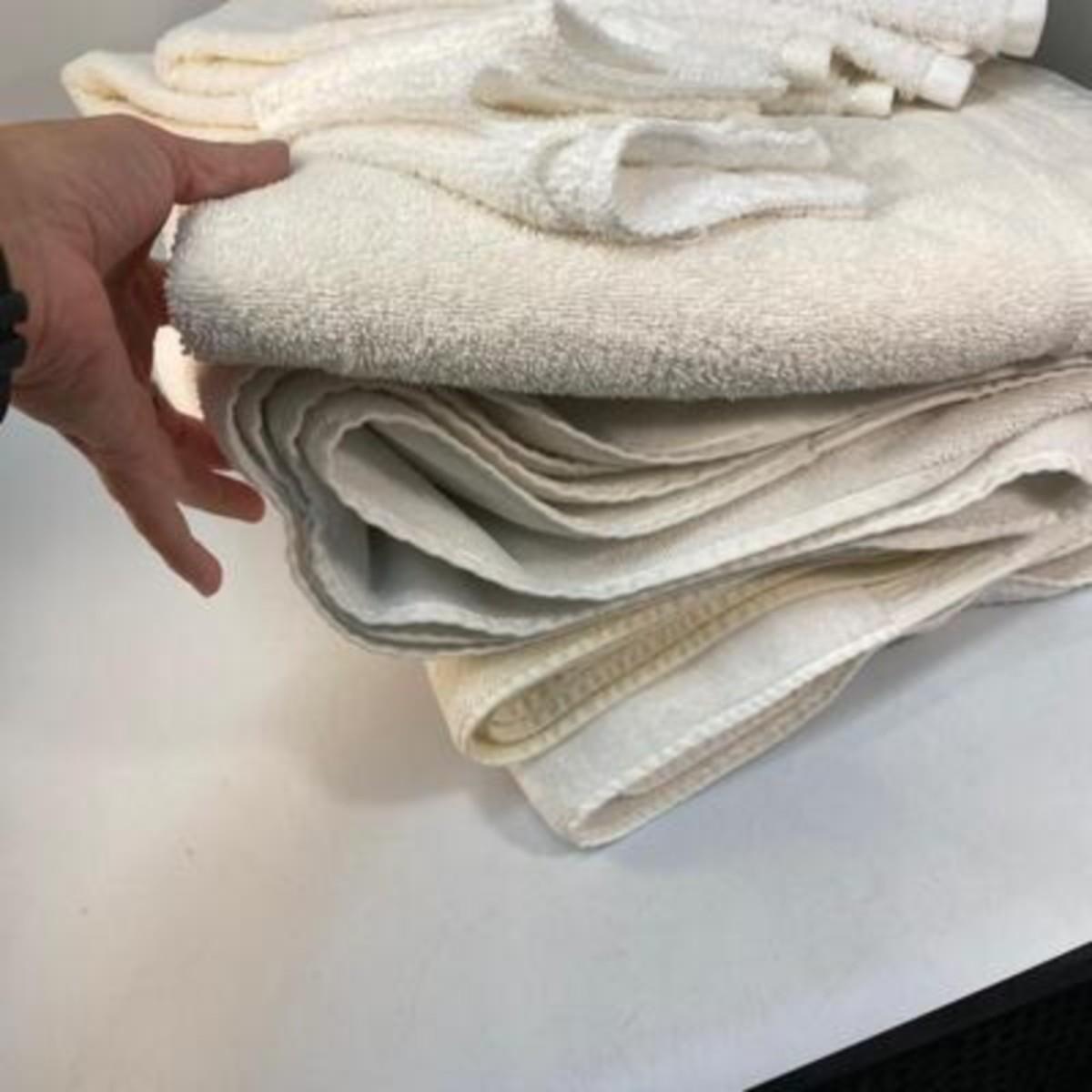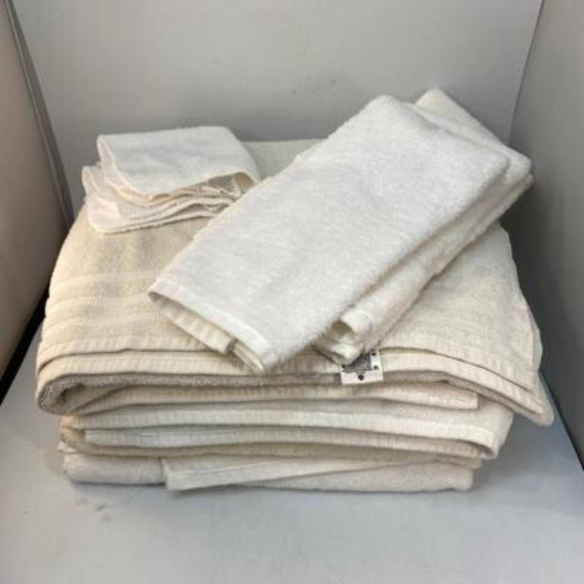 Mixed Brand Lot of White & Offwhite Bath Hand Towels Wash Cloths. Includes 4 large bath towels, 3 hand towels, and 2 wash cloths. In good previously owned condition. May be a light spot or two but the material feels soft on all towels.