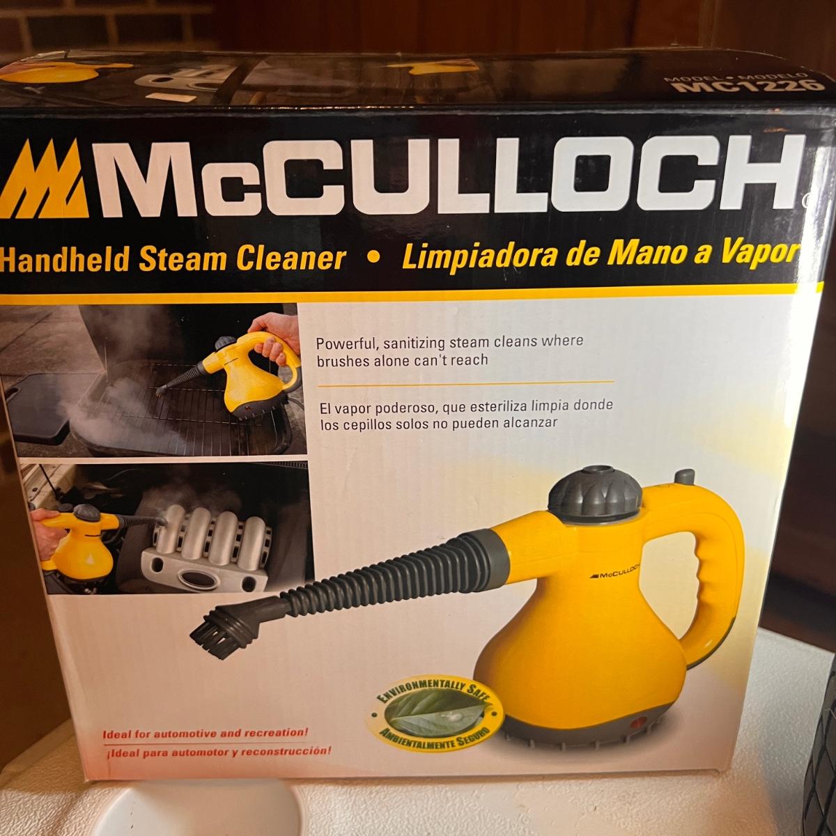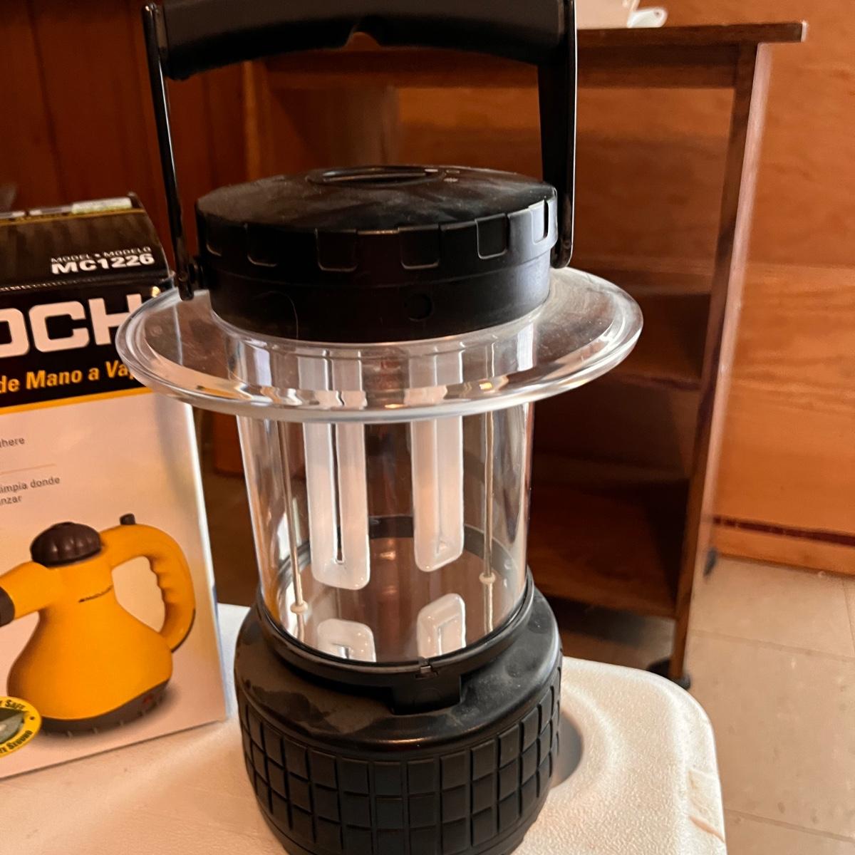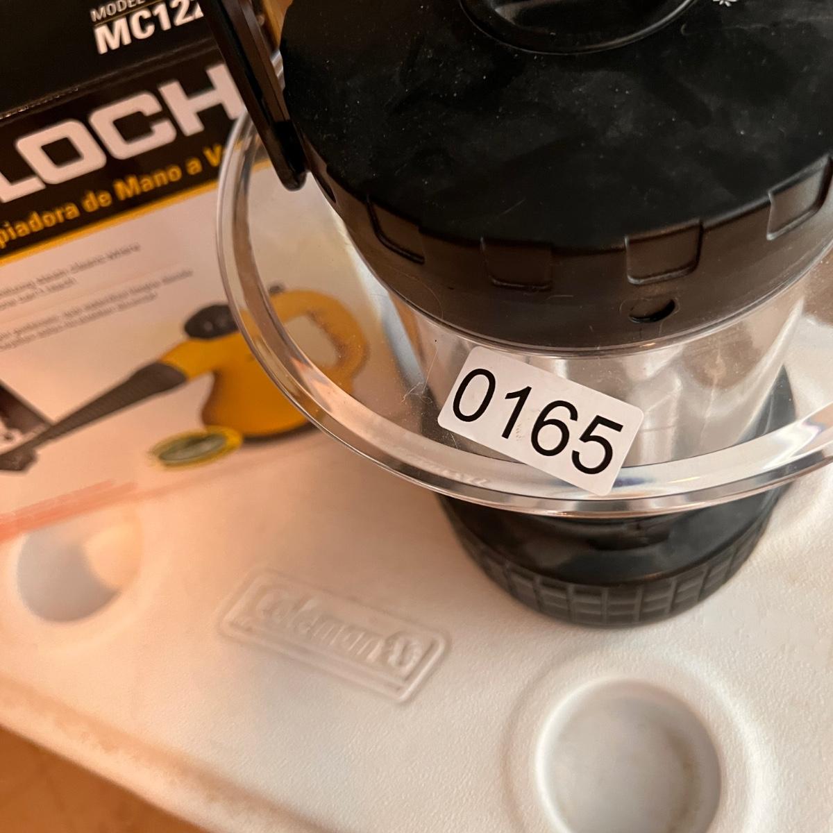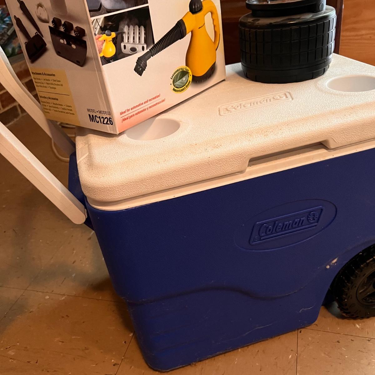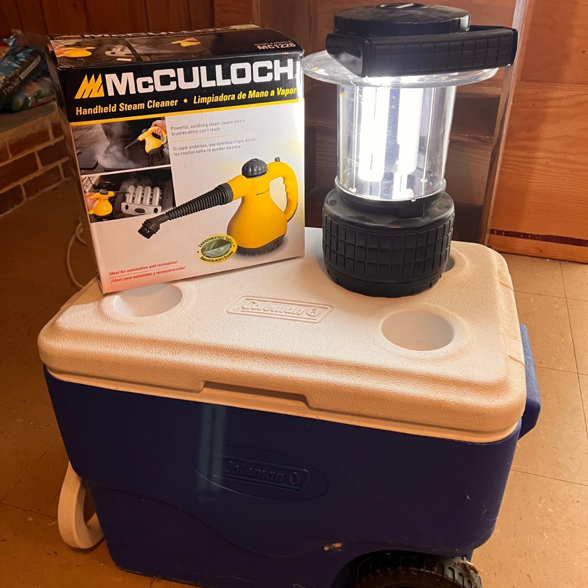 Portable lamp, Coleman cooler on wheels, McCulloch hand held steam cleaner.