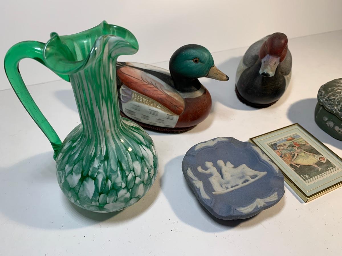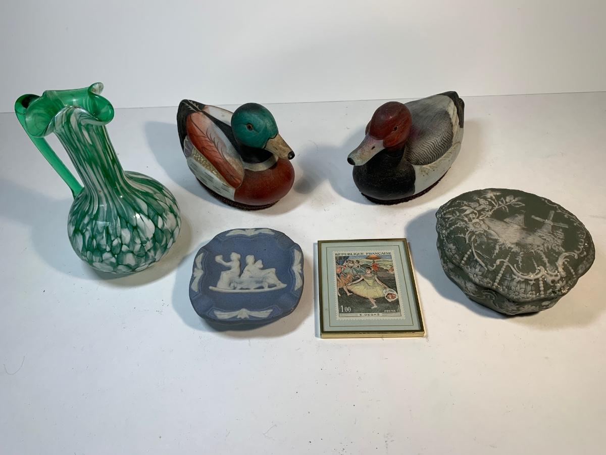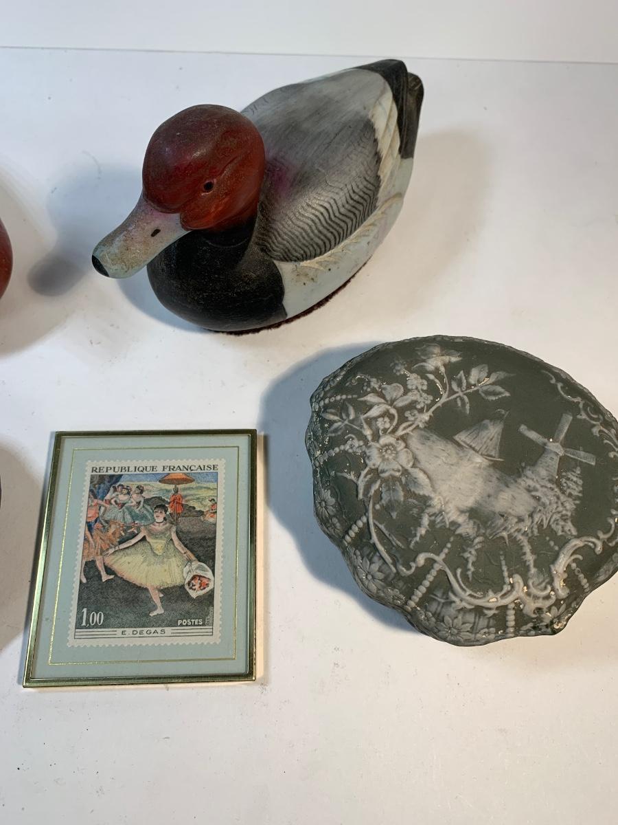 Two porcelain ducks a frame French stamp and others