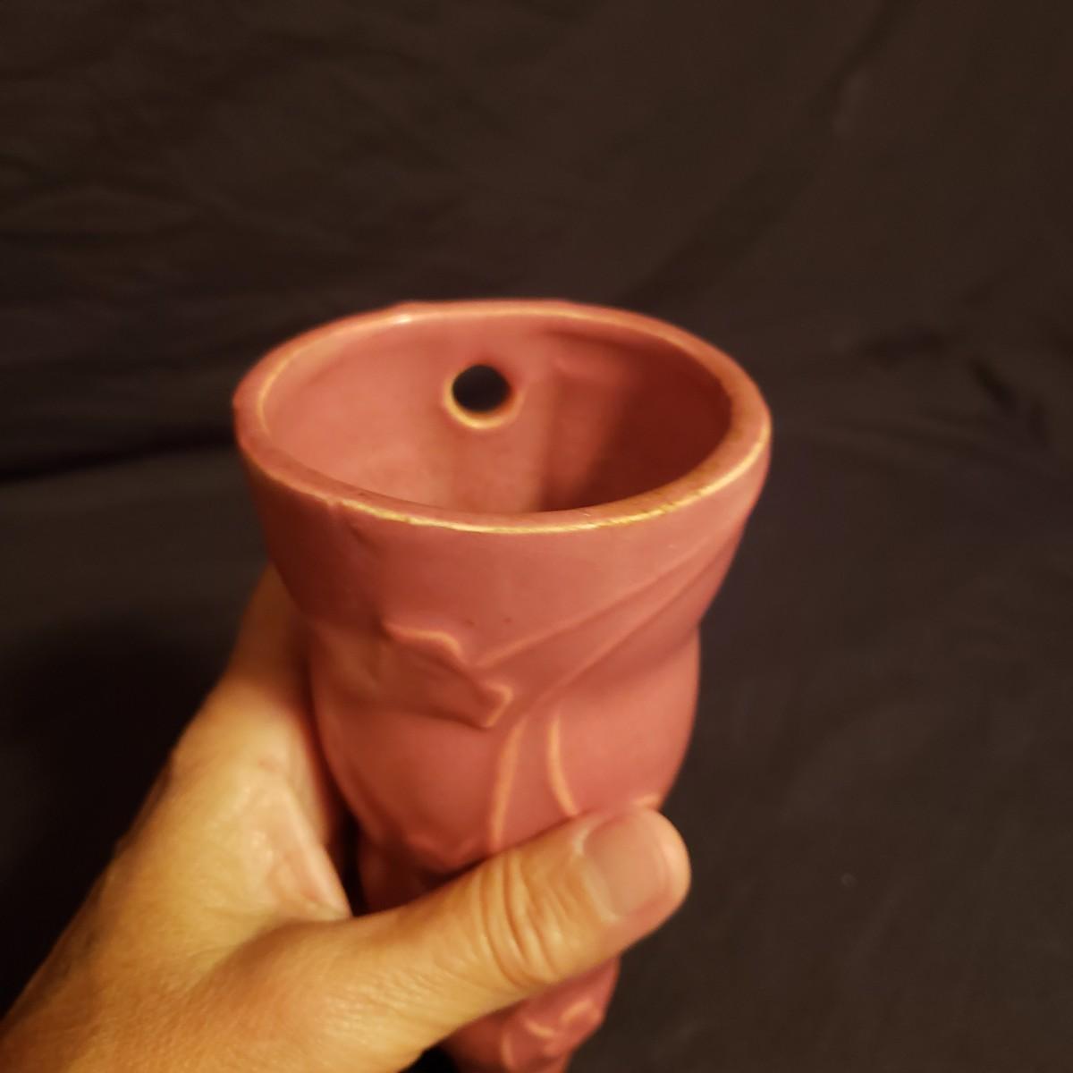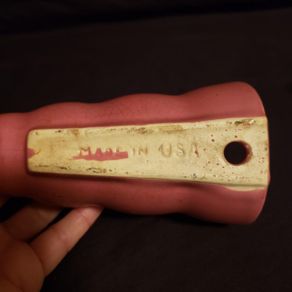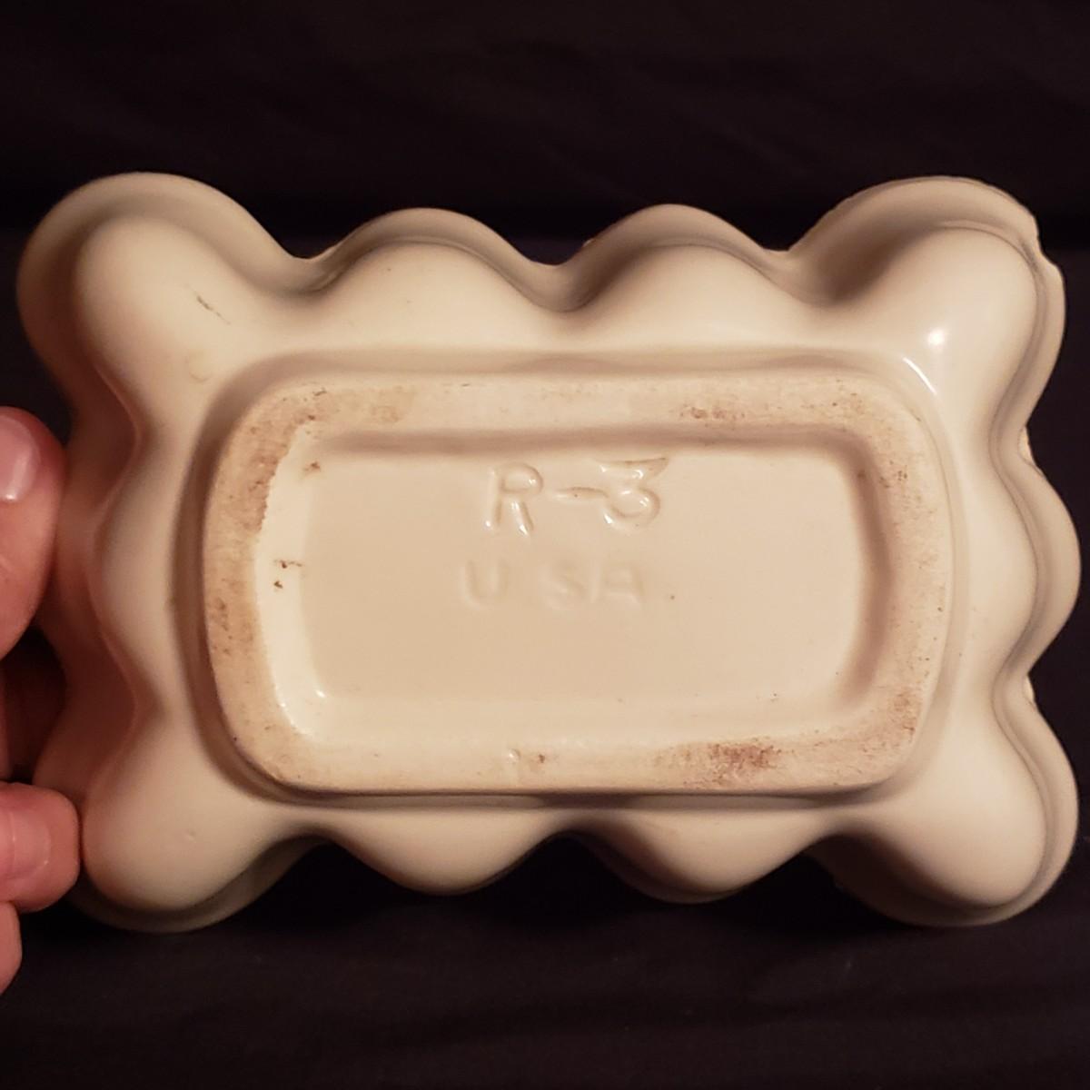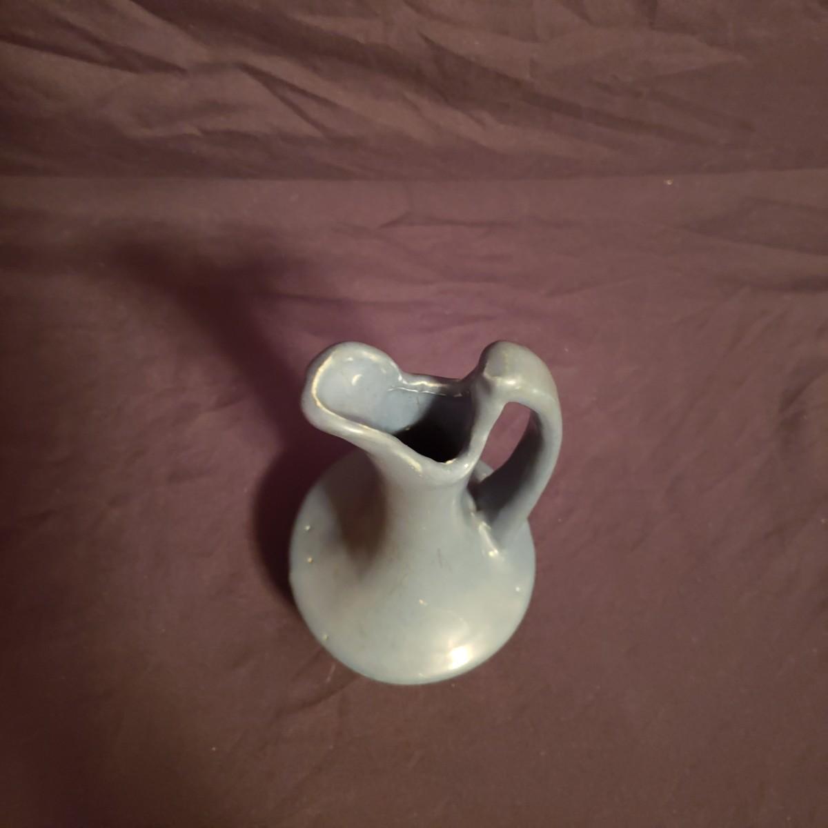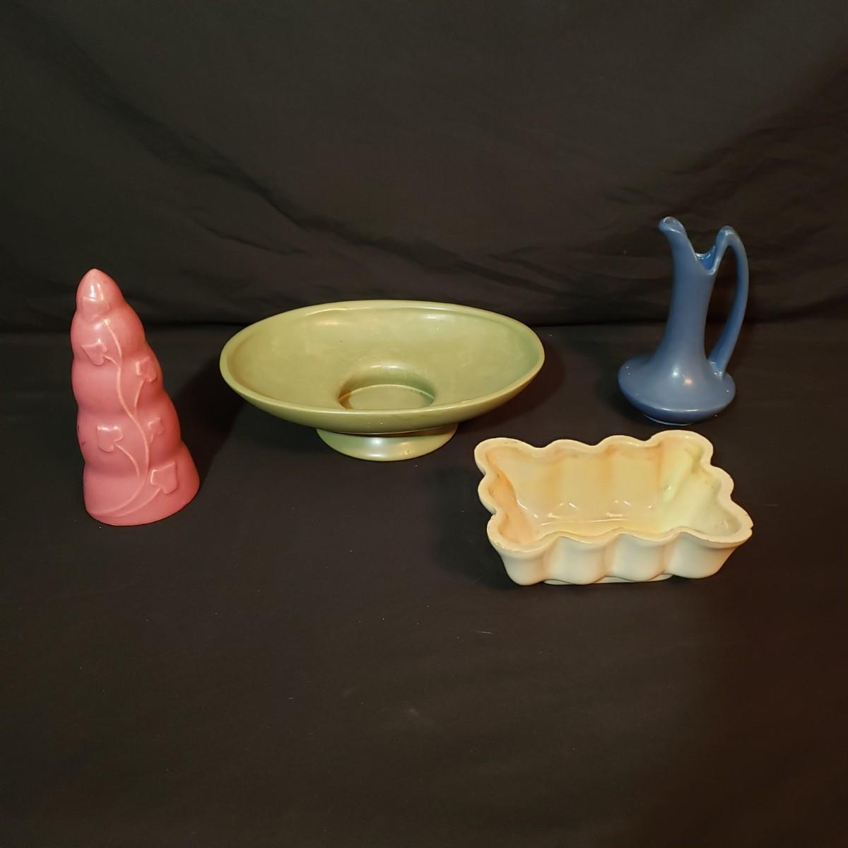 This mixed colored pottery all have a matte finish. The rose colored wall vase measures 3" x 7"H and is stamped Made in USA. There is a raised vine pattern on the front. The finish has a crackled effect and a black scuff mark that may wash off. The white ruffled bowl has R-3 USA stamped on the bottom. There is a small chip on the corner. The blue pitcher is made by Niloak potters. Finally, is a matted green bowl that measures 10" x 7" x 3"H. This bowl appears to be McCoy's Floraline USA. See photos for details.