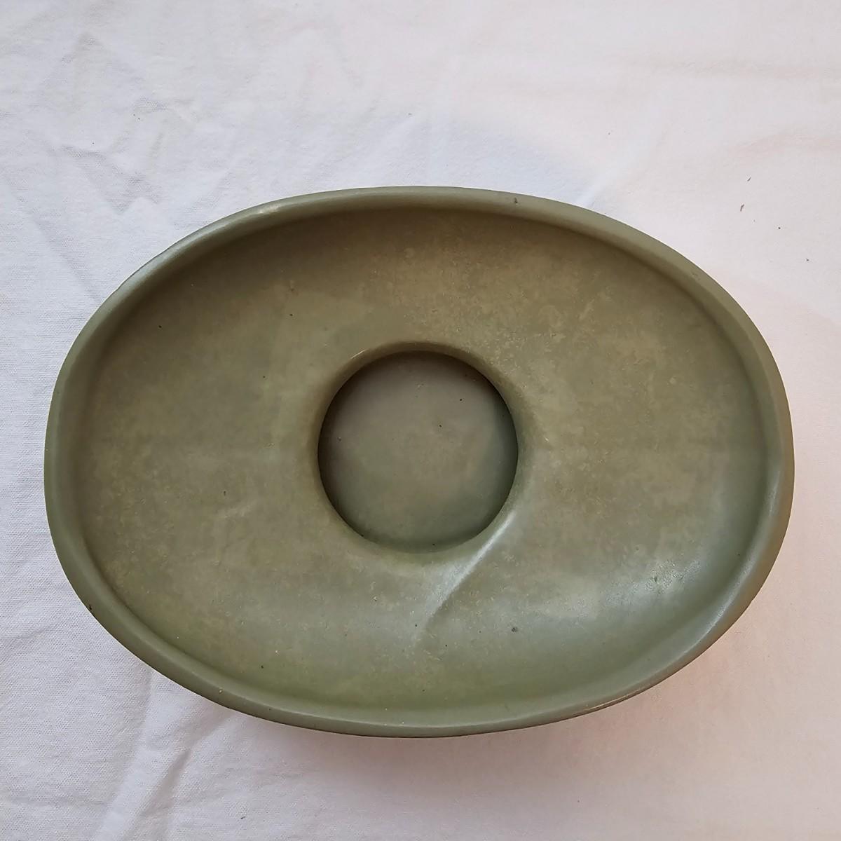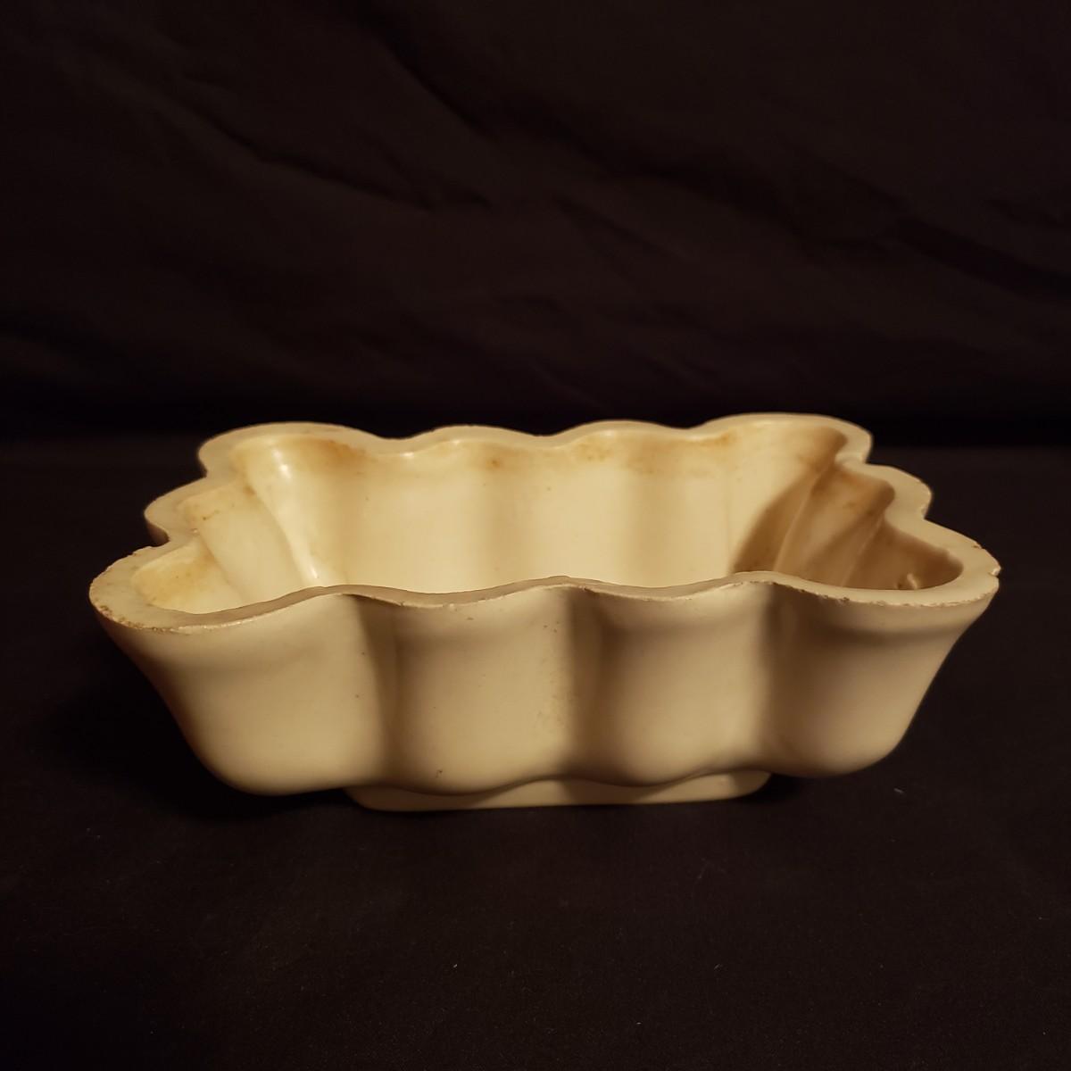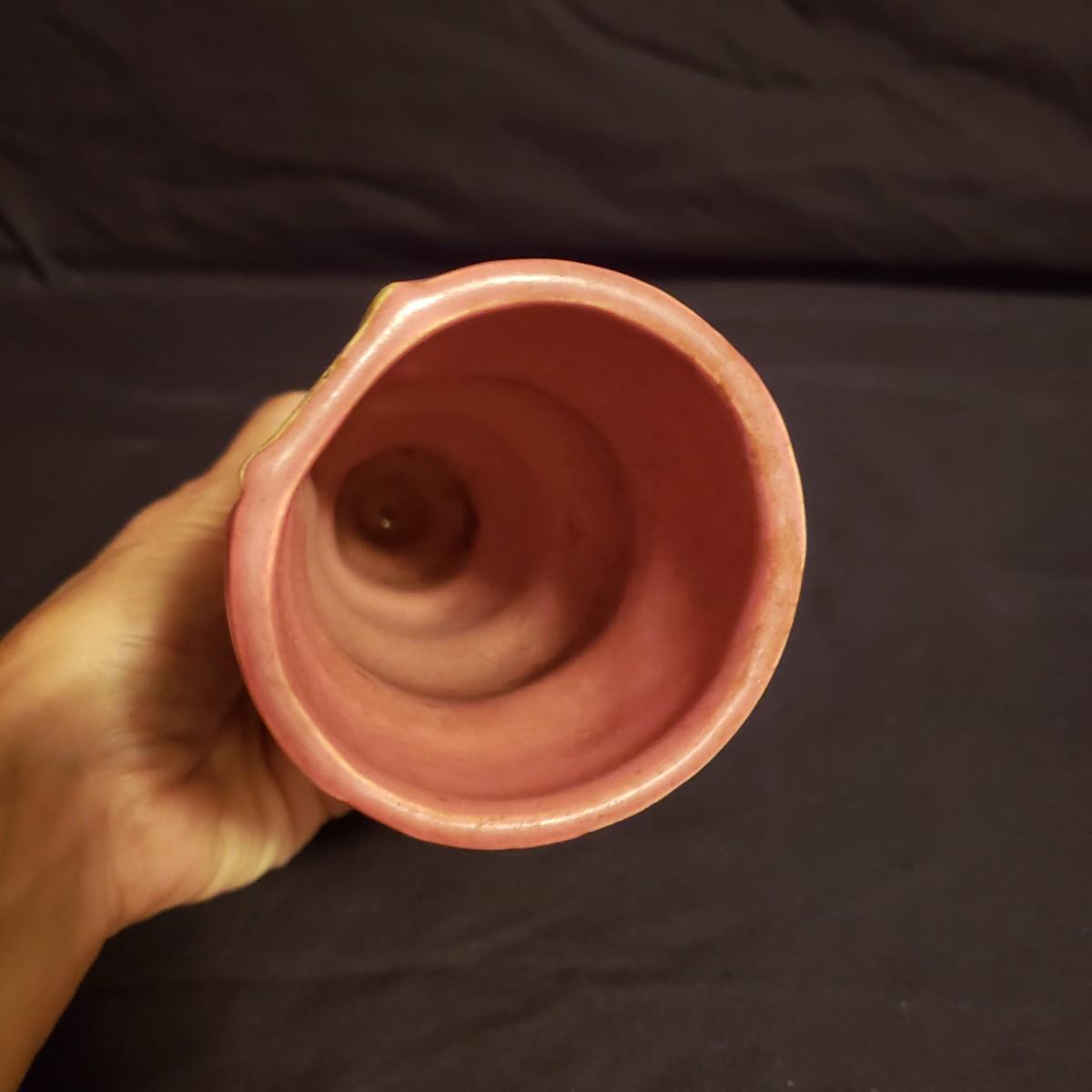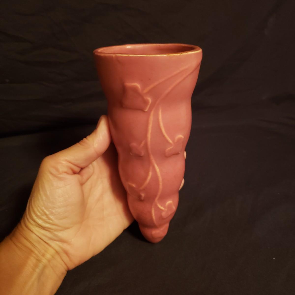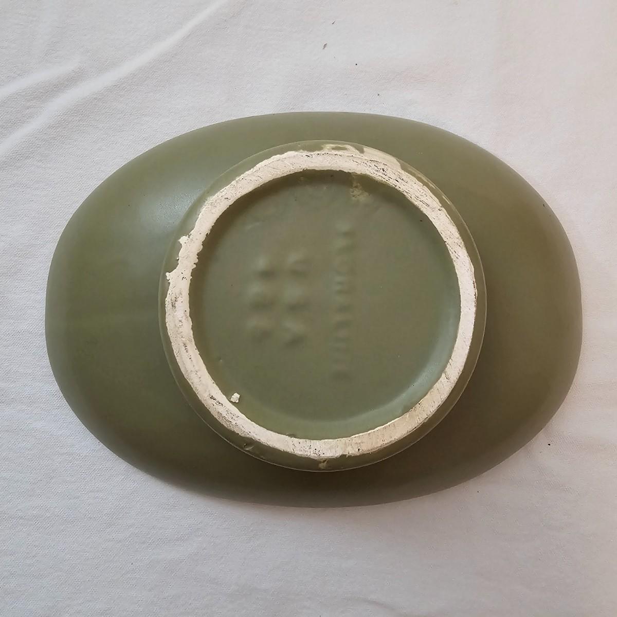 This mixed colored pottery all have a matte finish. The rose colored wall vase measures 3" x 7"H and is stamped Made in USA. There is a raised vine pattern on the front. The finish has a crackled effect and a black scuff mark that may wash off. The white ruffled bowl has R-3 USA stamped on the bottom. There is a small chip on the corner. The blue pitcher is made by Niloak potters. Finally, is a matted green bowl that measures 10" x 7" x 3"H. This bowl appears to be McCoy's Floraline USA. See photos for details.