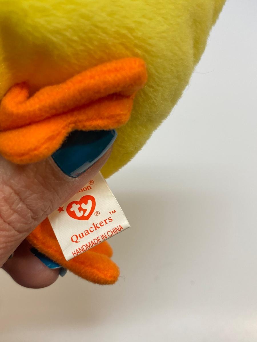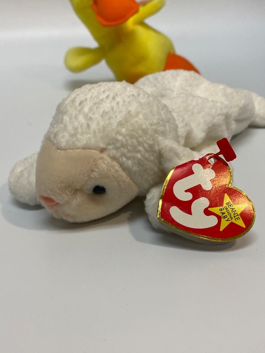 Mixed lot of cute TY beanie baby plush animals. Includes yellow duck "Quackers", white lamb "Fleece", chipmunk "Chipper", blue jay "Rocket", deer fawn "Whisper". All have their original hang tag.