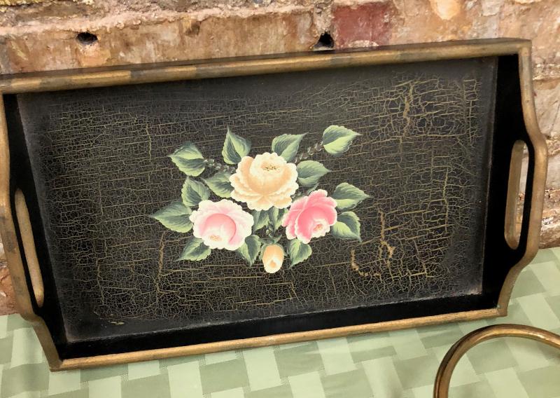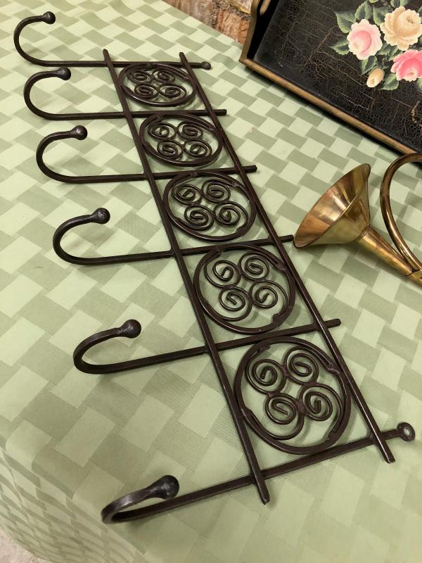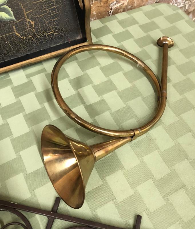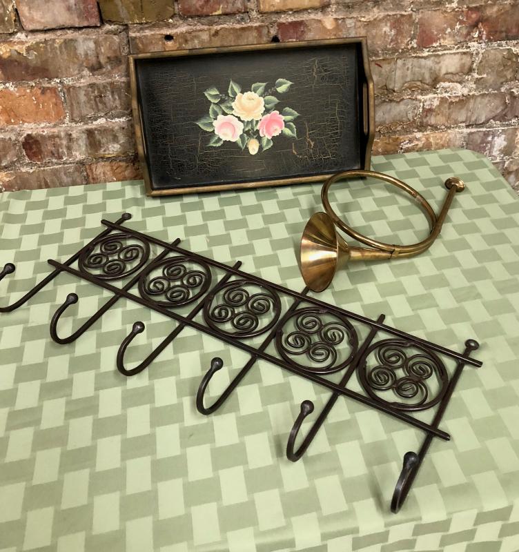 This lot contains a towel rack..festive horn and vintage tea tray....