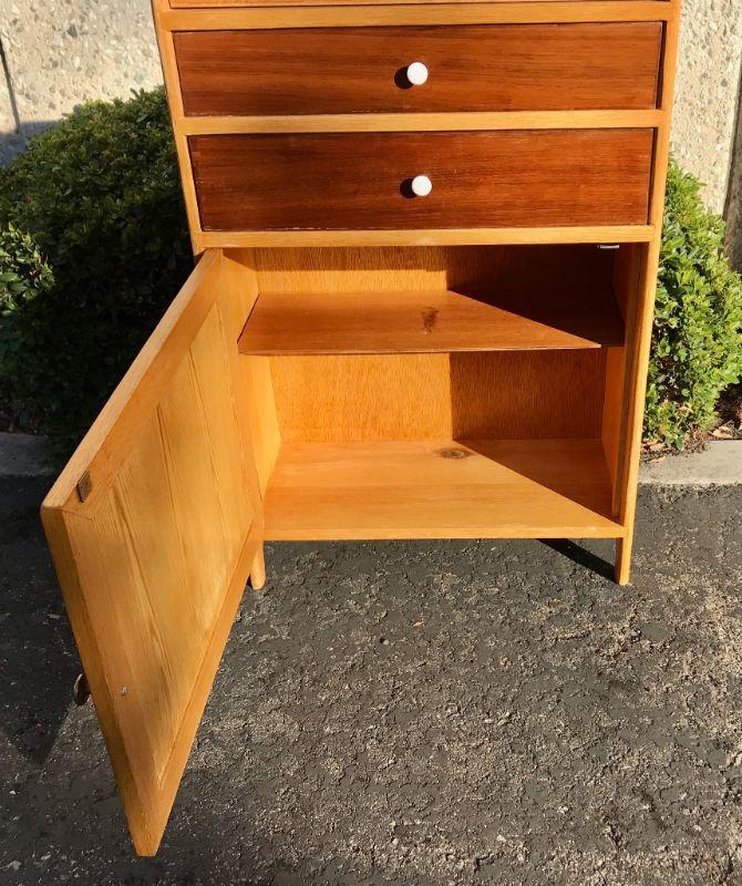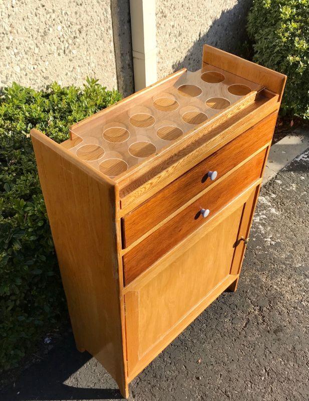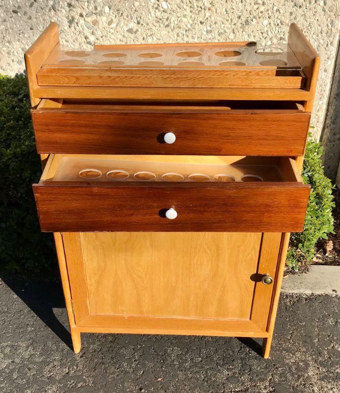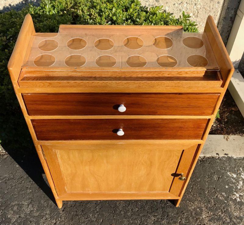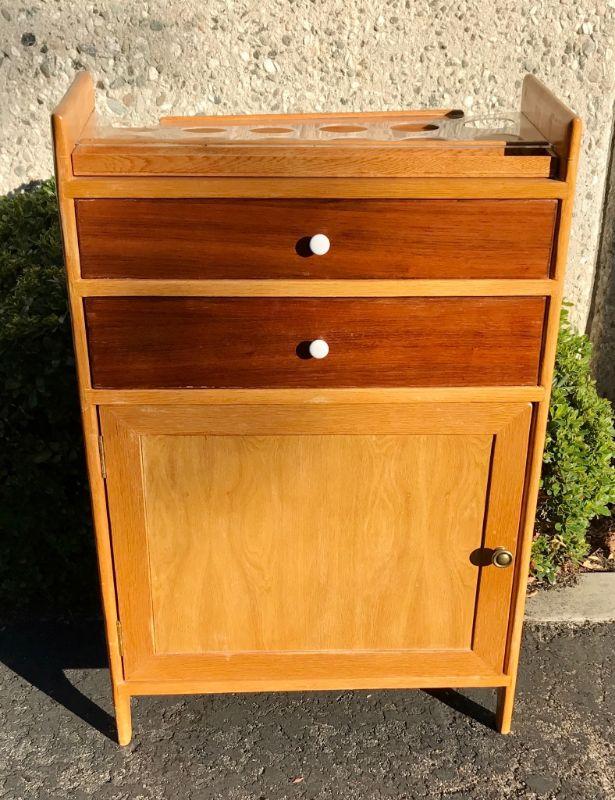 Mixed finish wood cabinet. Multi use possibility. Features two drawers and a lower cabinet. Small shelf inside cabinet. Top has a plexi piece with holes, can be removed, unsure of actual use. Slim so it can fit in a lot of places with out sticking out to much. Measures about 38hx28wx11d. Great for small dry bar or maybe in a bathroom or closet.