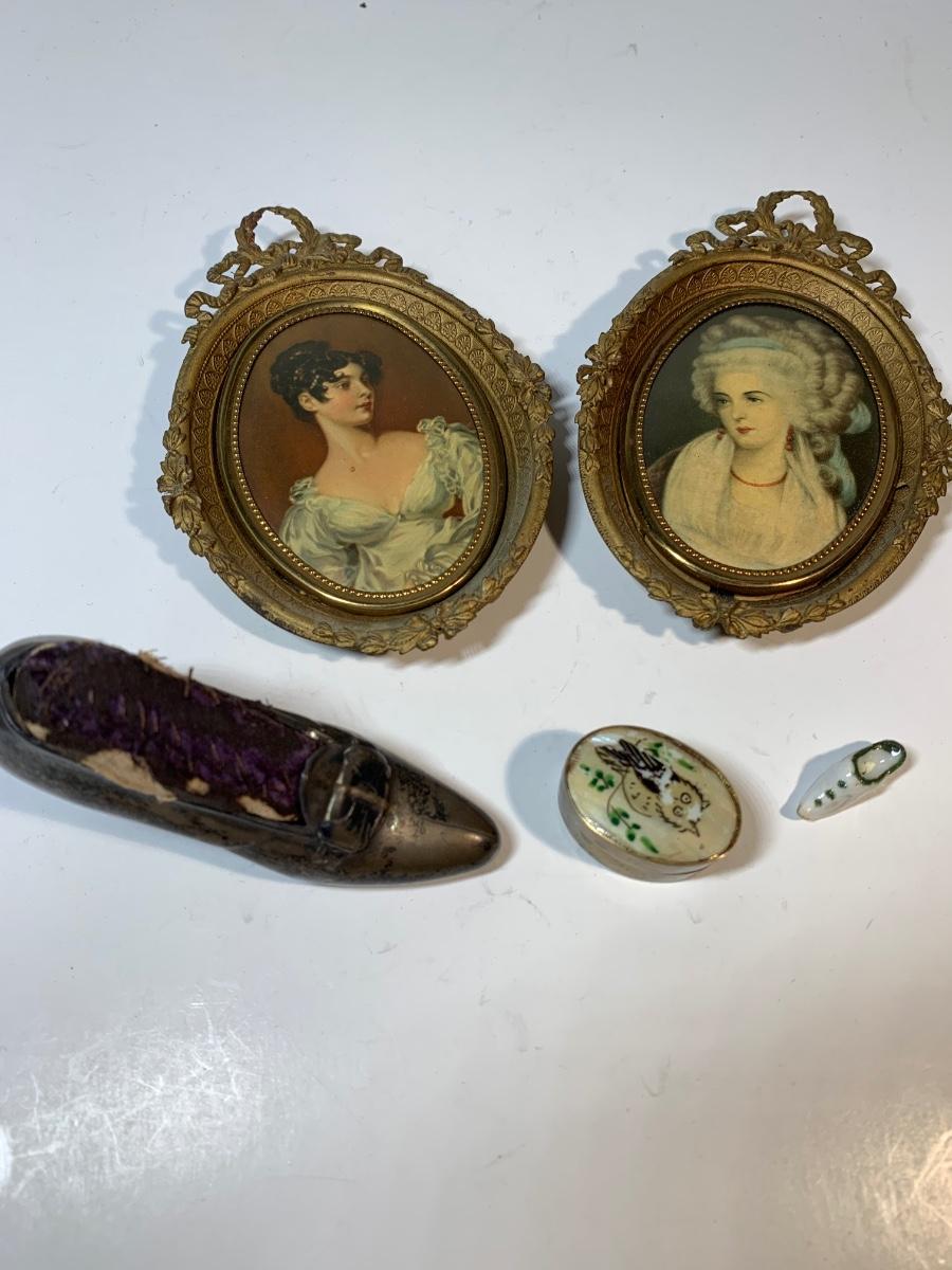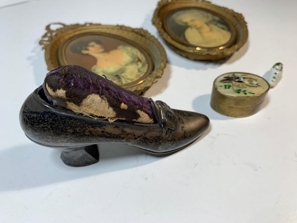 Sterling silver shoe pin cushion, a hand painted pill box etc