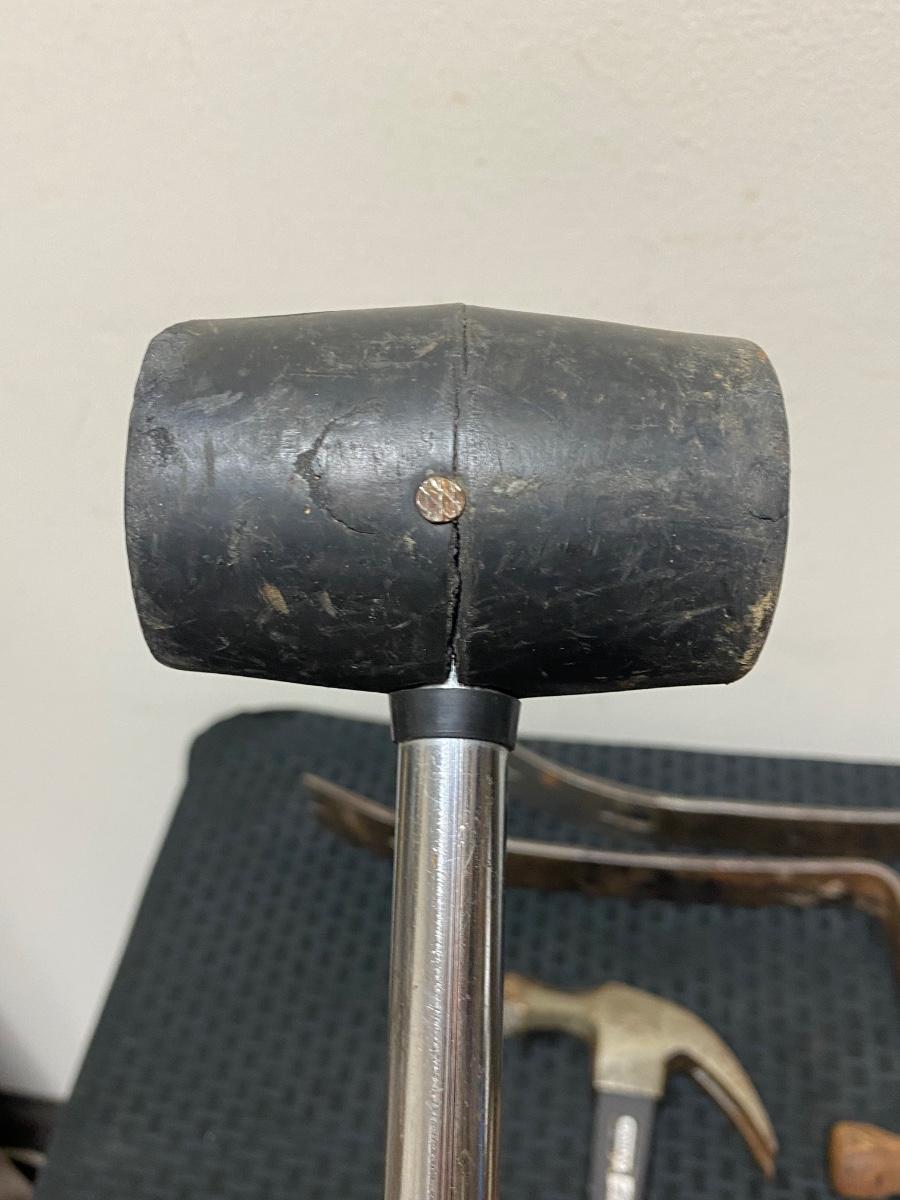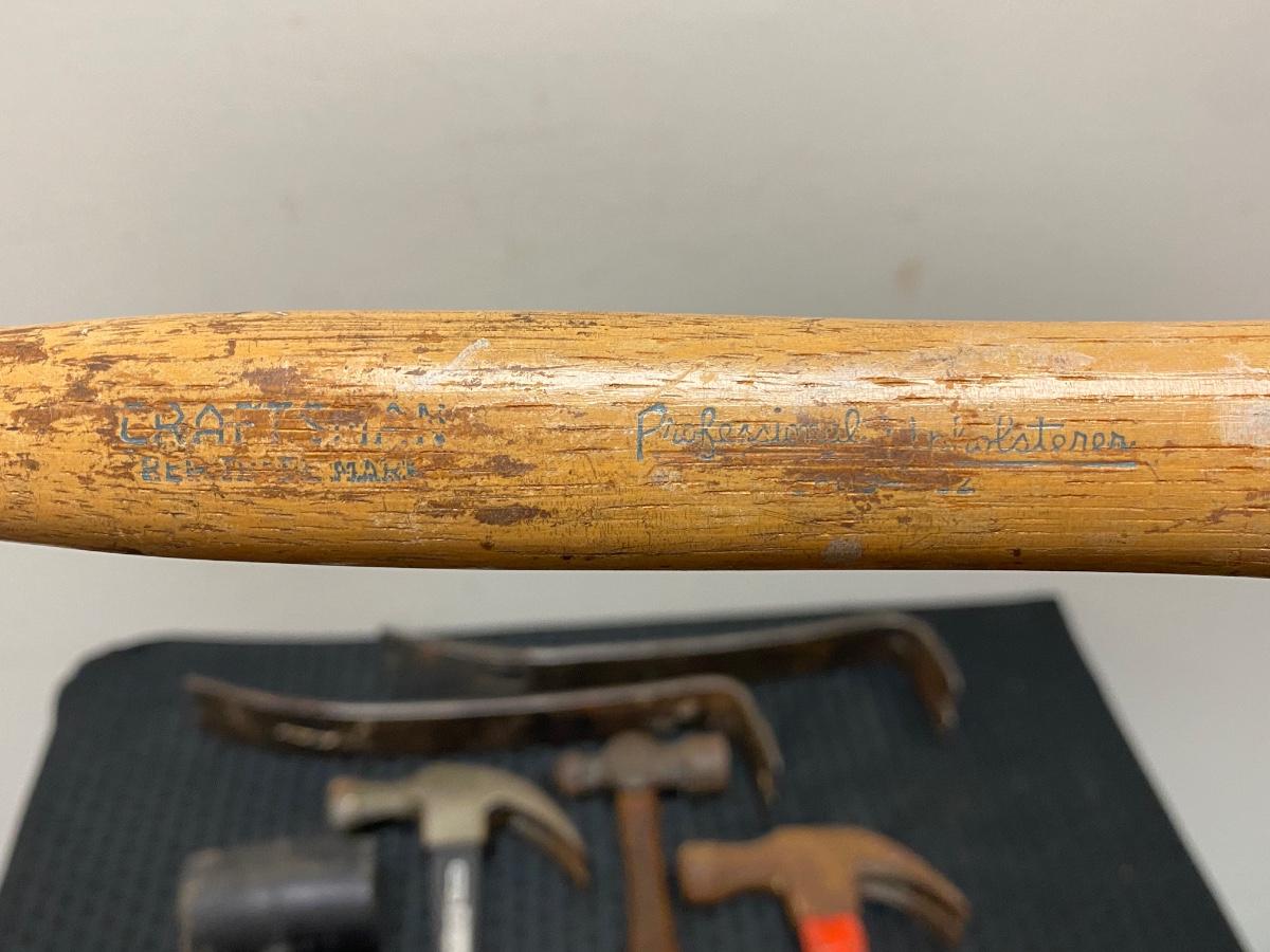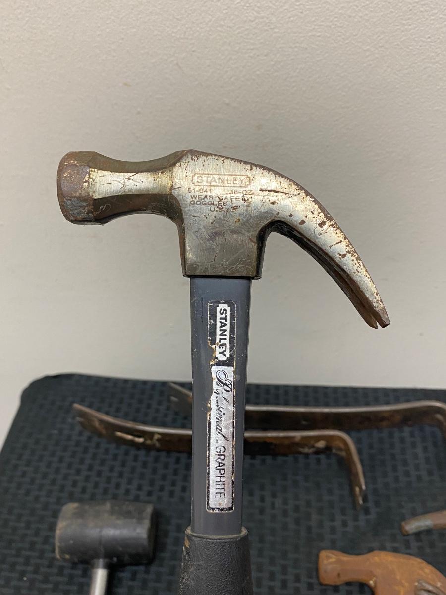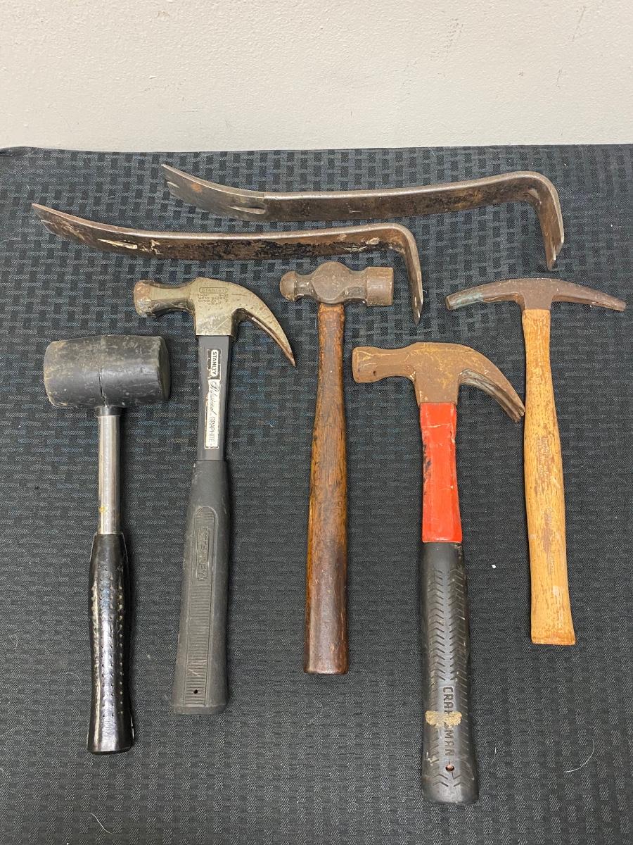 Mixed Hammer and Pry Bar Lot. Various styles of hammers for different uses. Included are two heavy duty handheld nail puller pry bars.