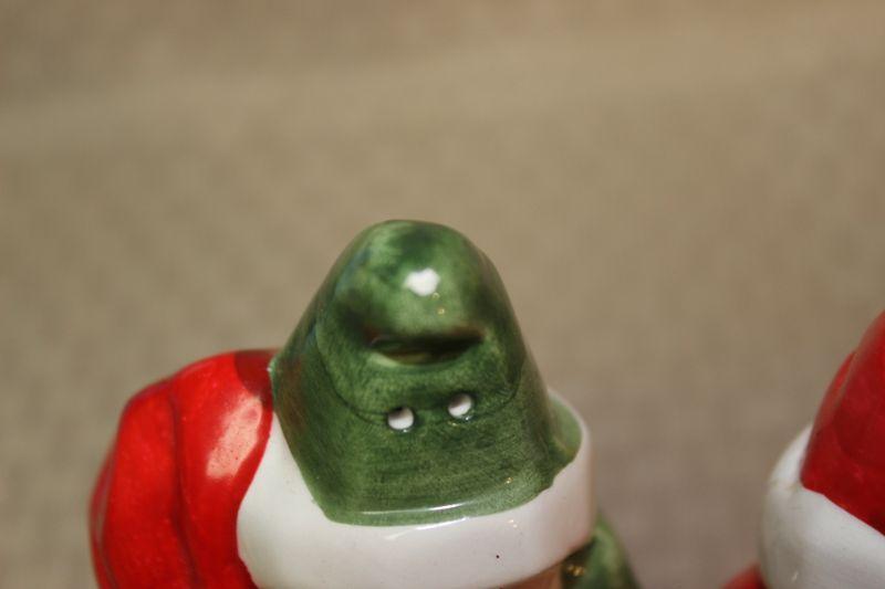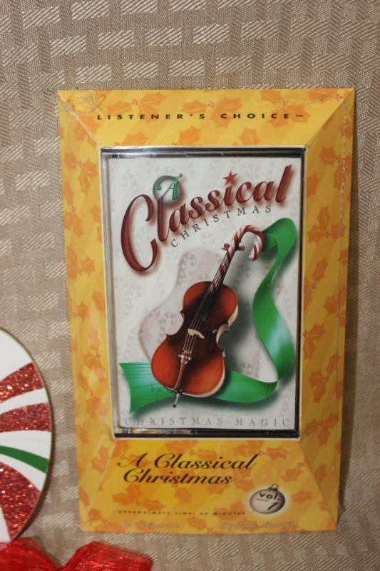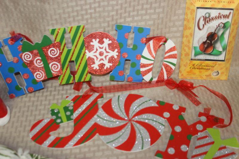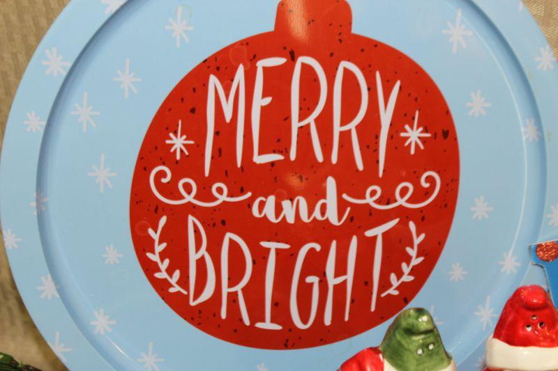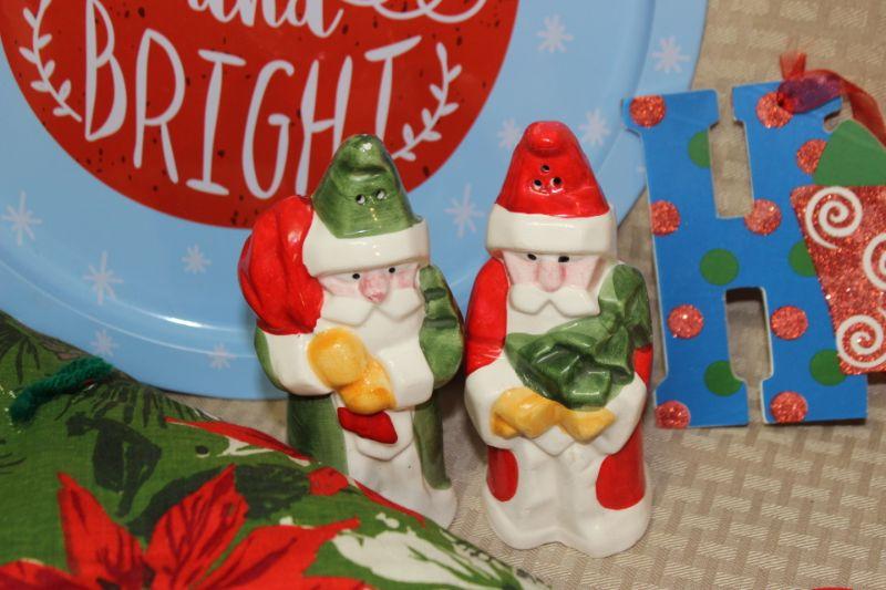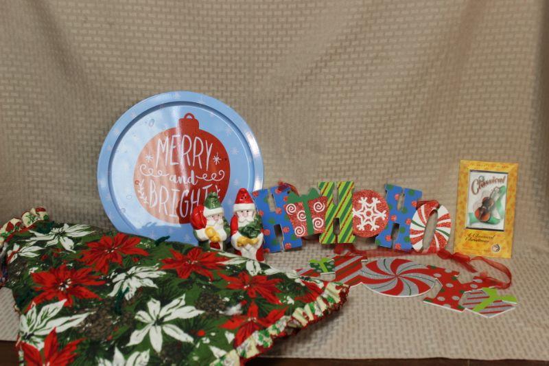 Christmas Holiday Decor Lot. Included is a pair of Santa salt shakers, metal round platter, 2 hanging signs, a Christmas music cassette, and a vintage small tree skirt. The green hat Santa has the smallest chip in his hat.