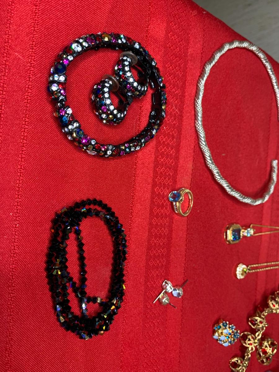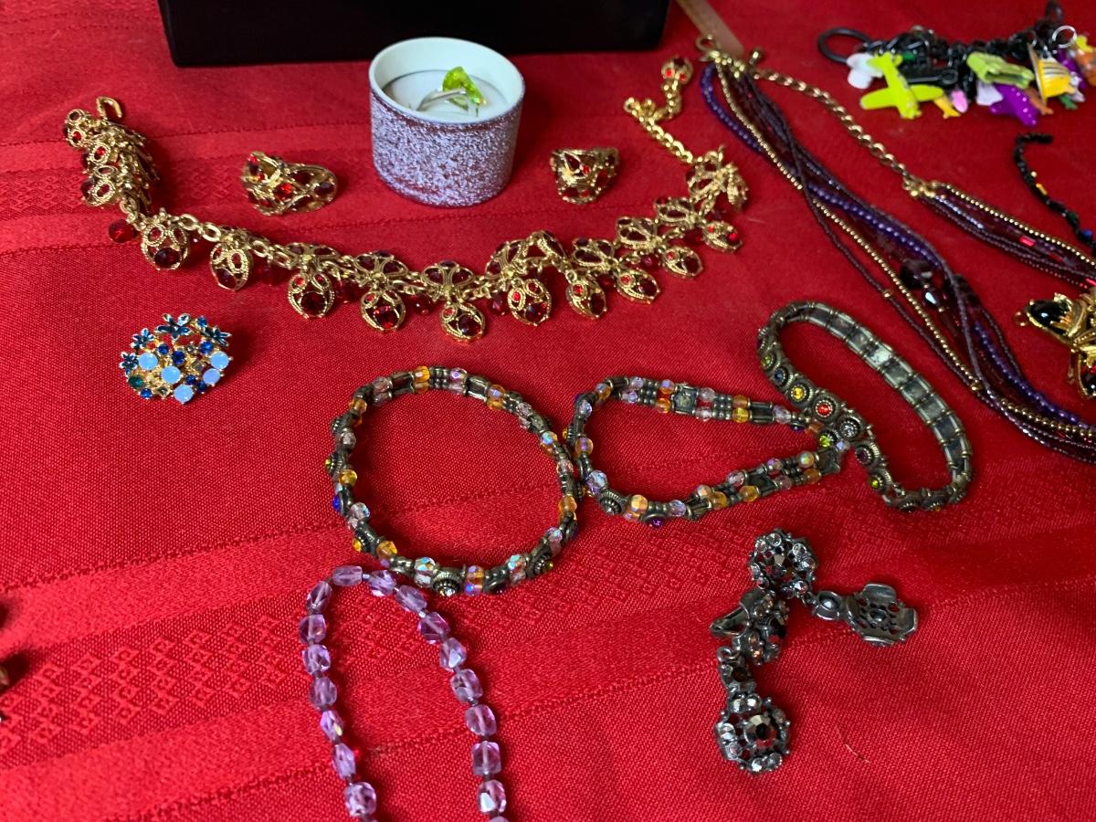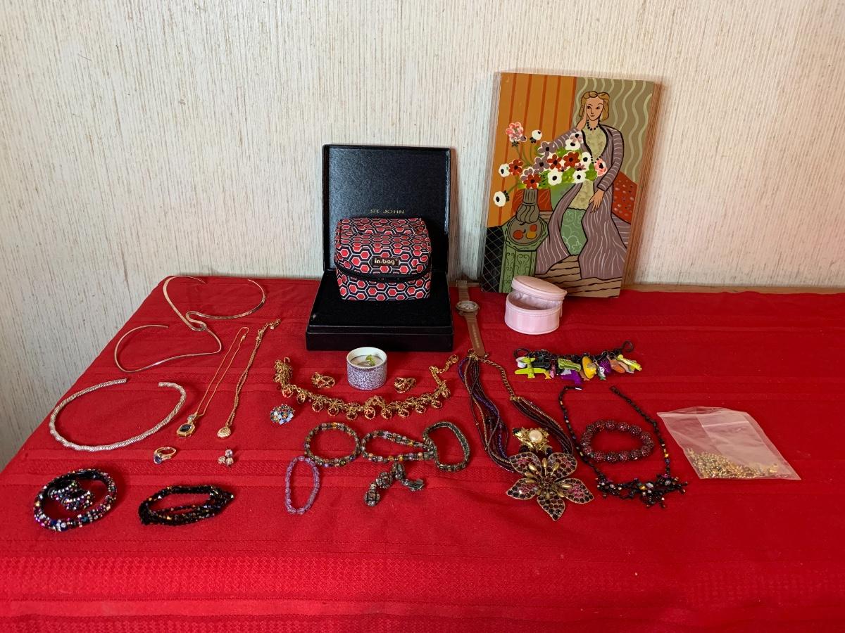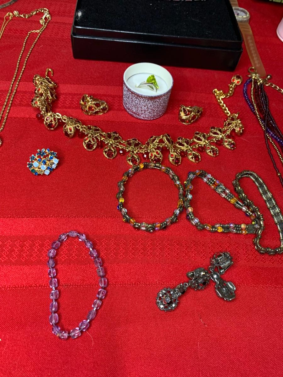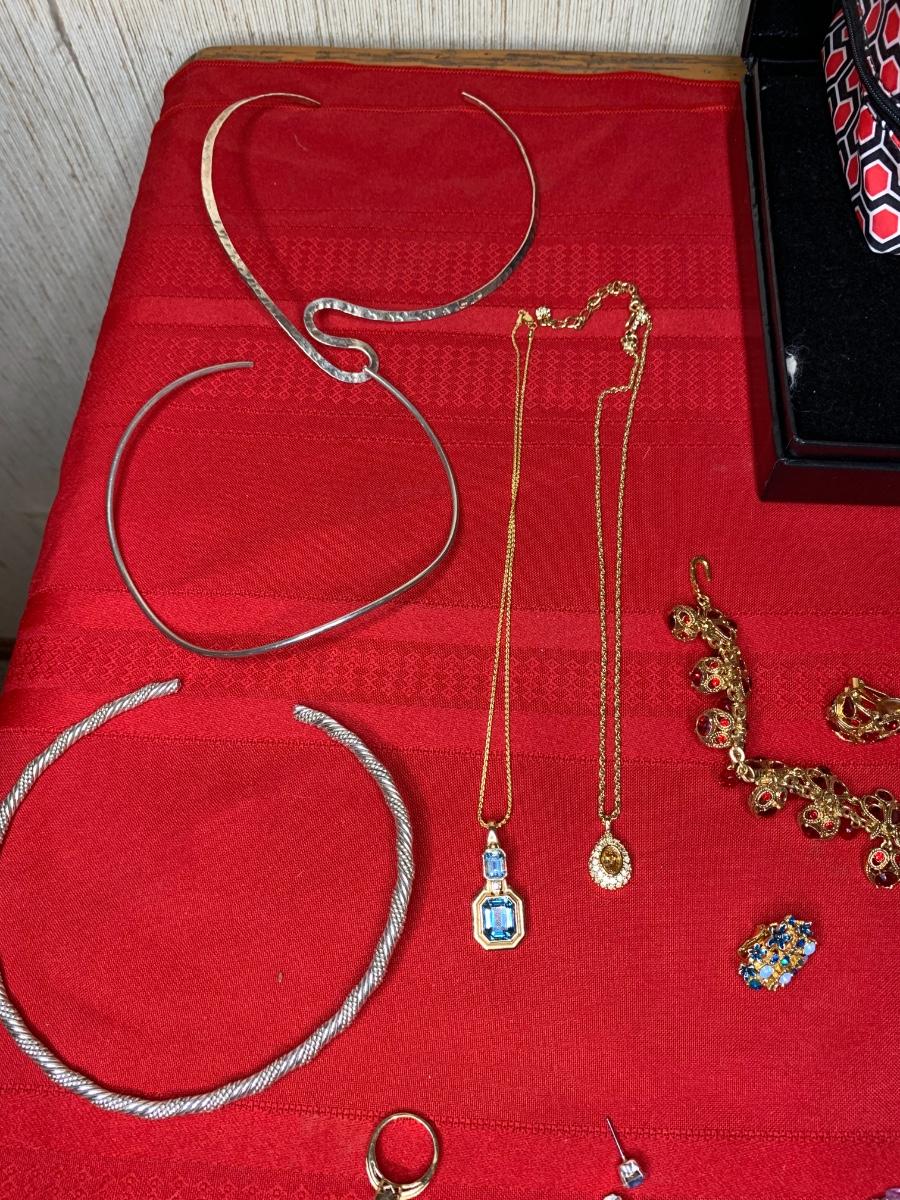 Mixed costume and gold jewelry, one 14k gold chain necklace, one vintage charm bracelet, one silver 925 ring with green stone and other bright gem jewelry. Includes 3 jewelry boxes