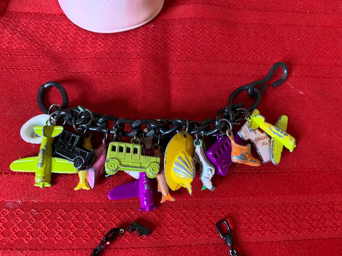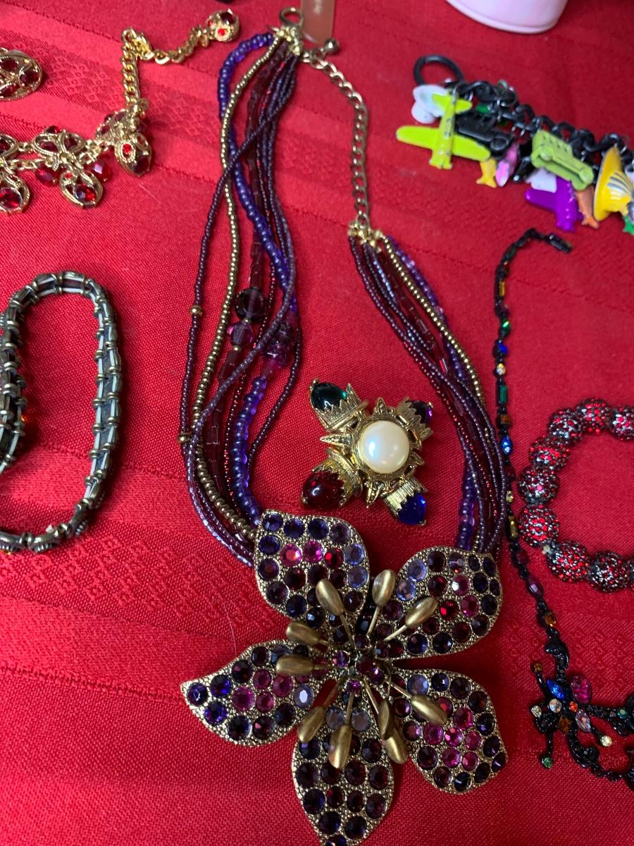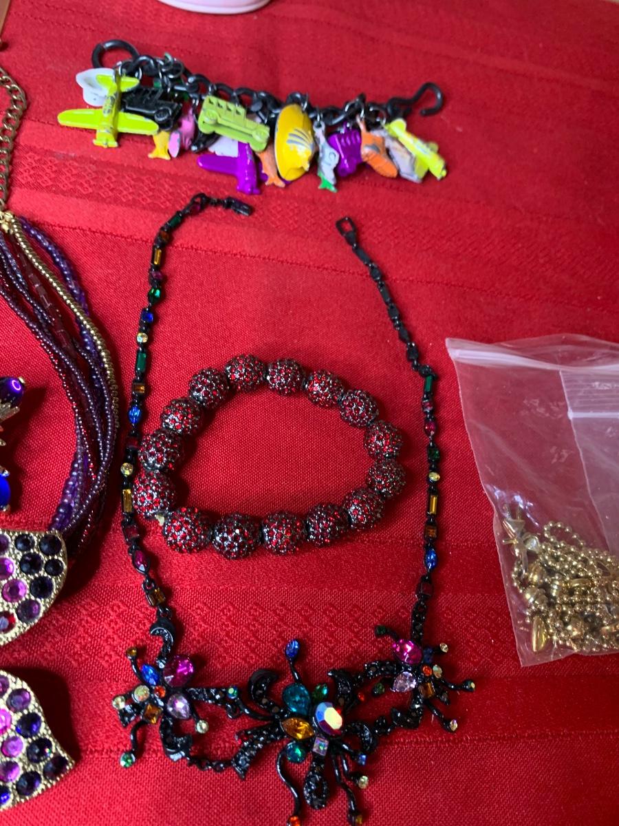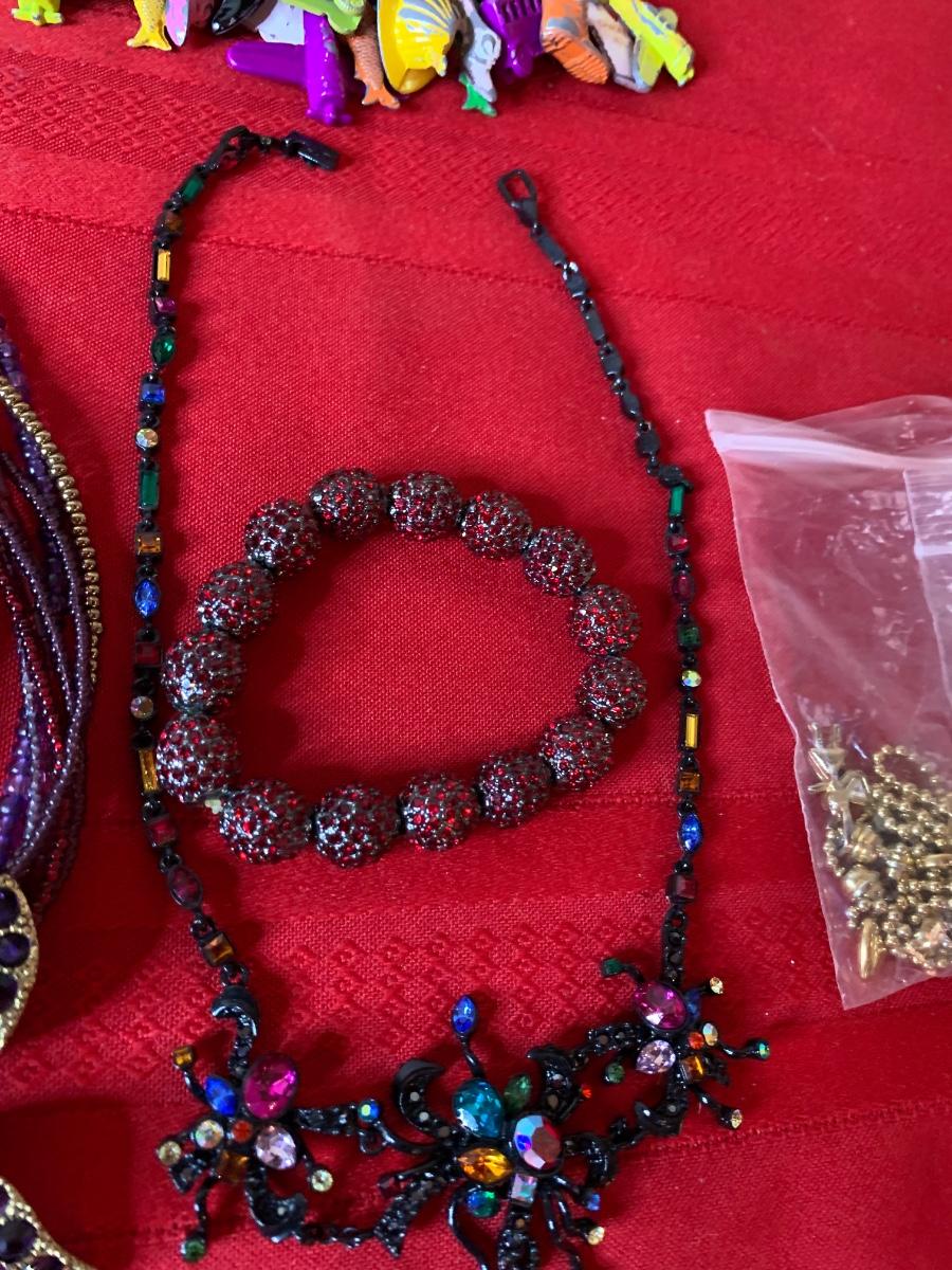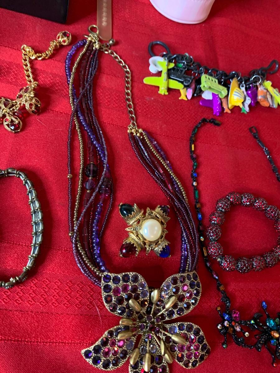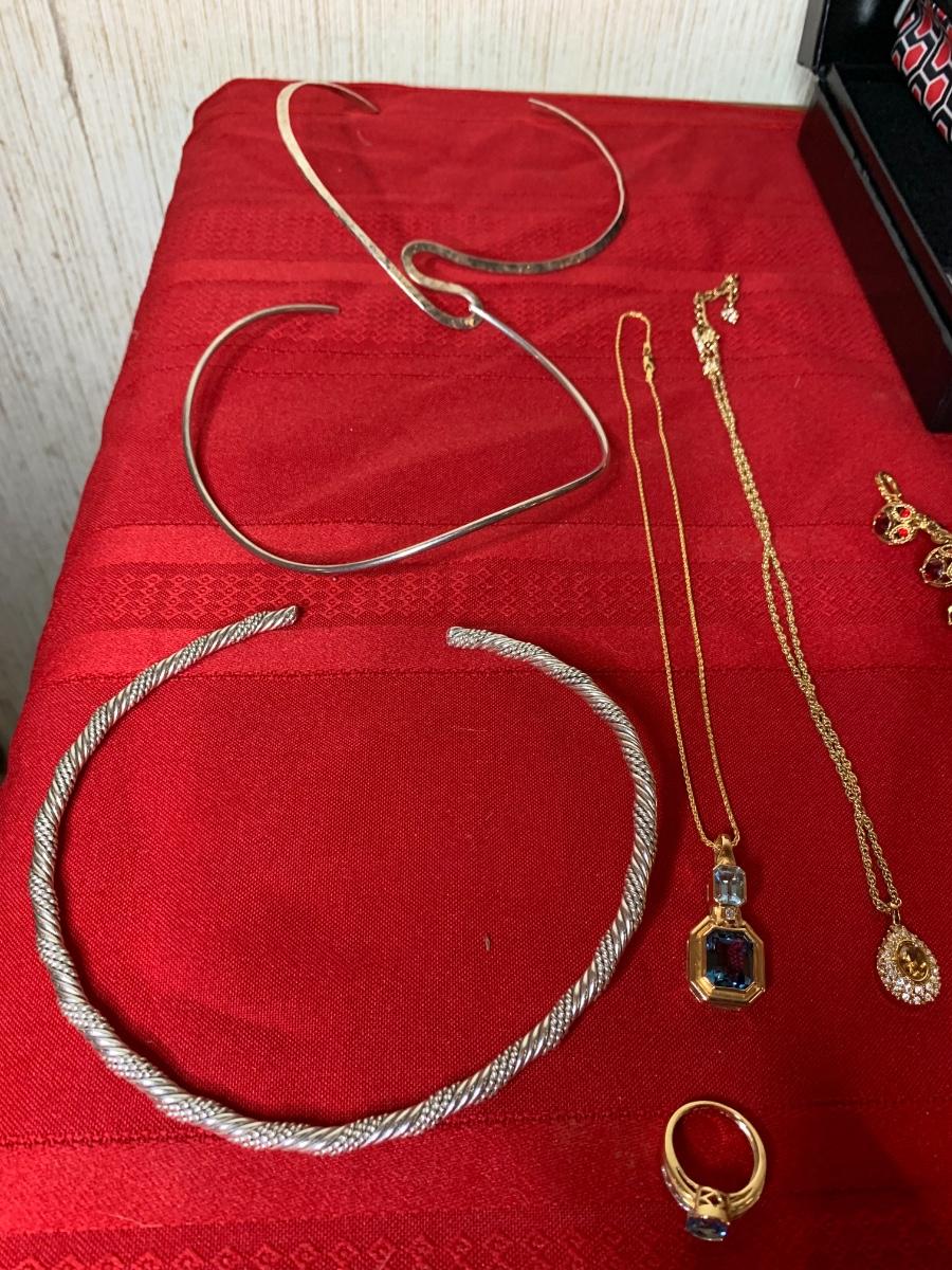 Mixed costume and gold jewelry, one 14k gold chain necklace, one vintage charm bracelet, one silver 925 ring with green stone and other bright gem jewelry. Includes 3 jewelry boxes