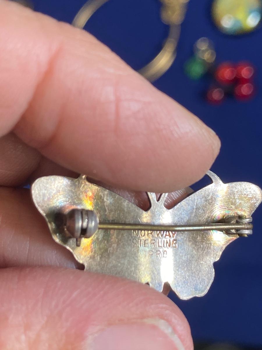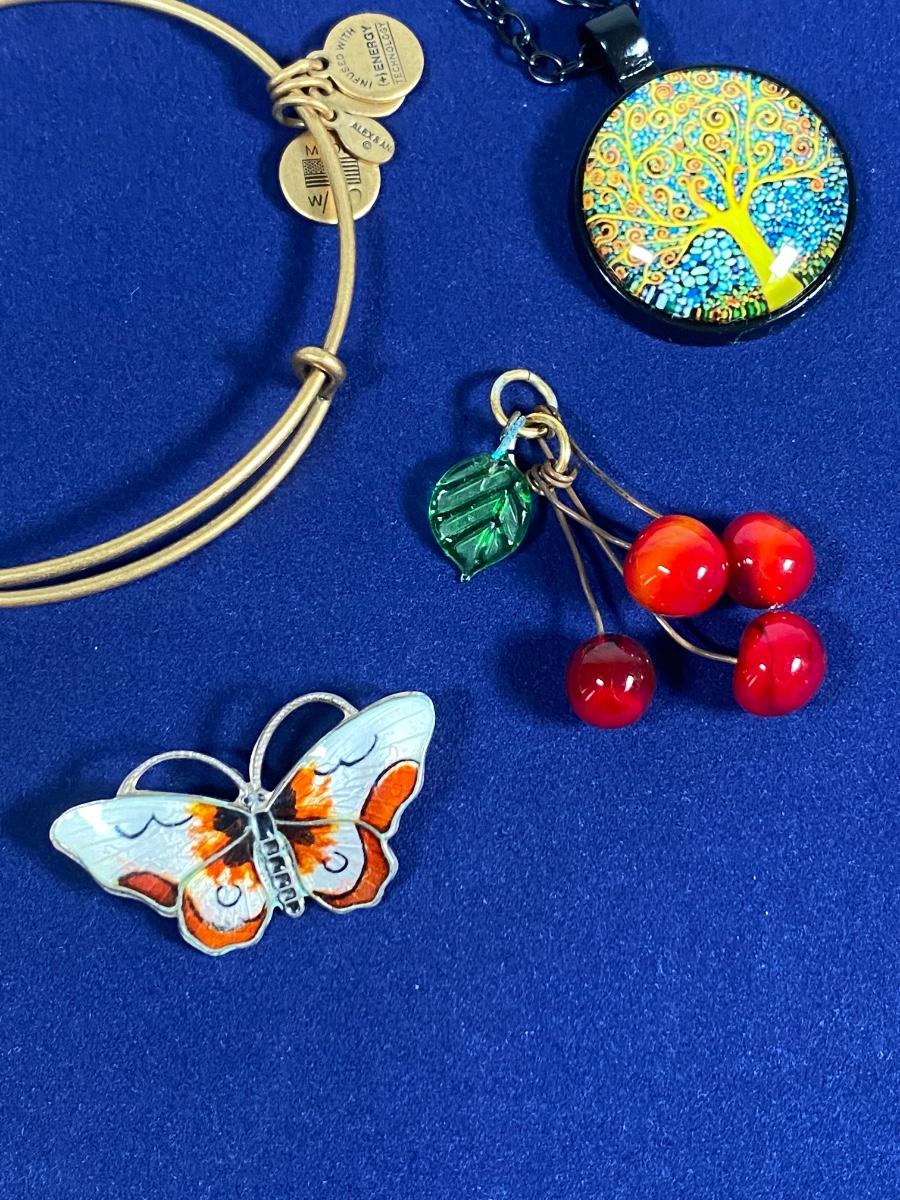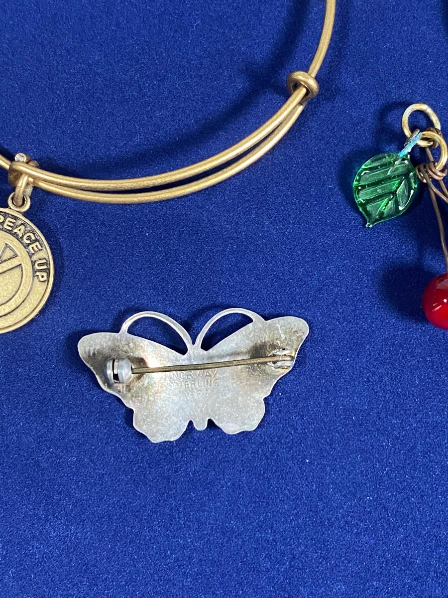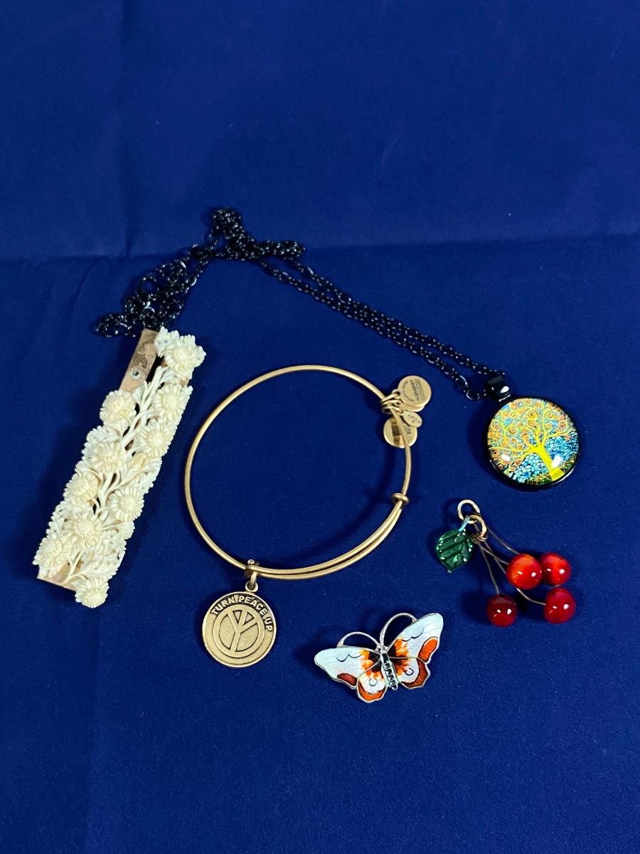 Mixed Jewlery Lot. Enameled sterling butterfly pin, glass cherries charm, Peace bracelet, pendant necklace, and a carved flower vine hair barrette. The barrette has some damage, everything else in good condition.