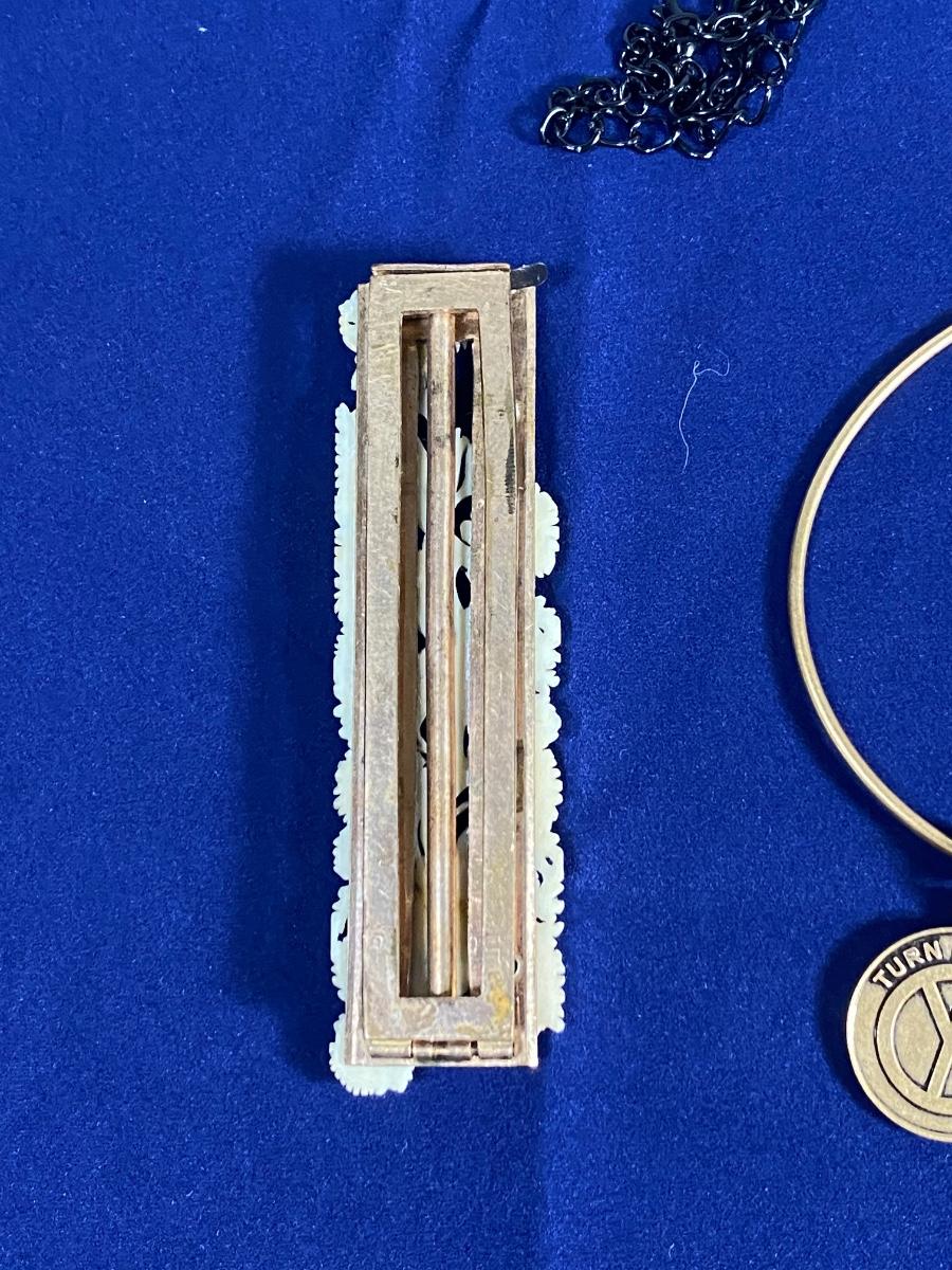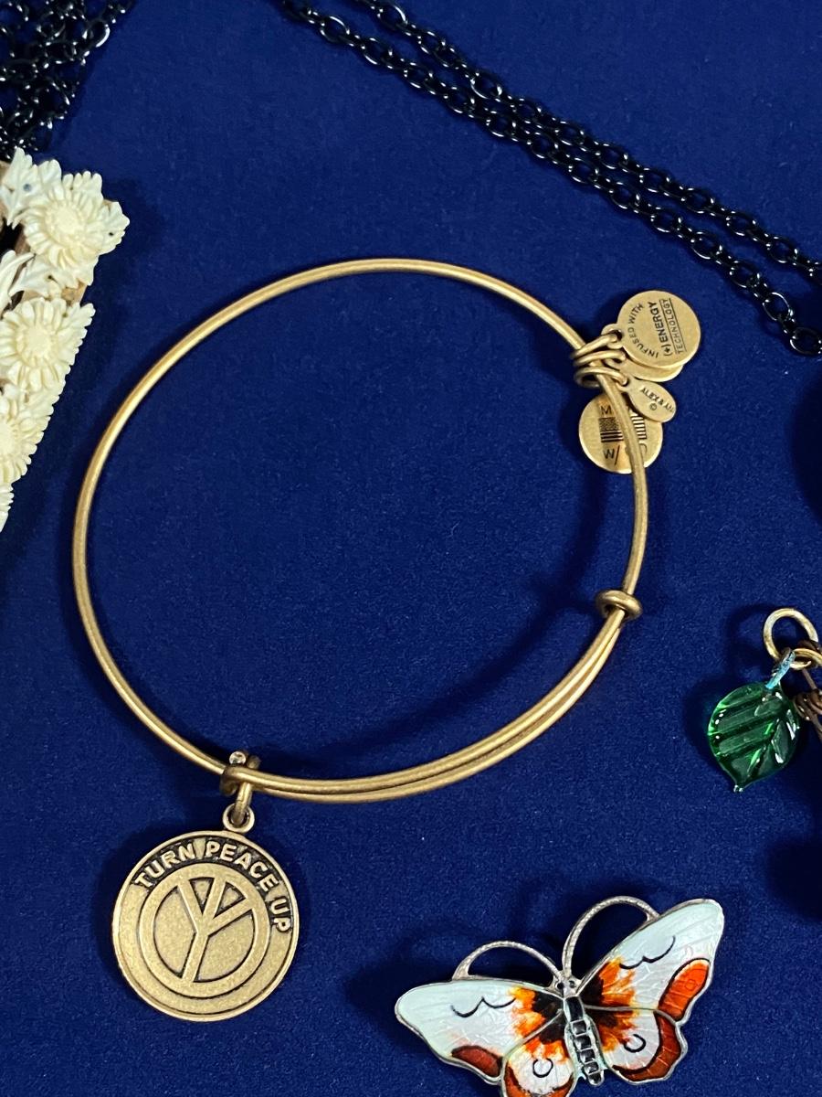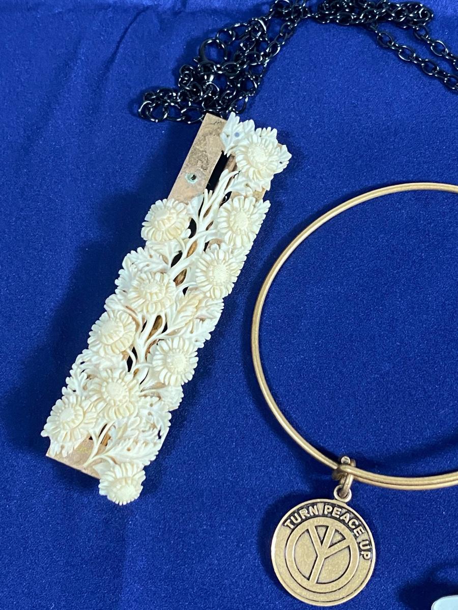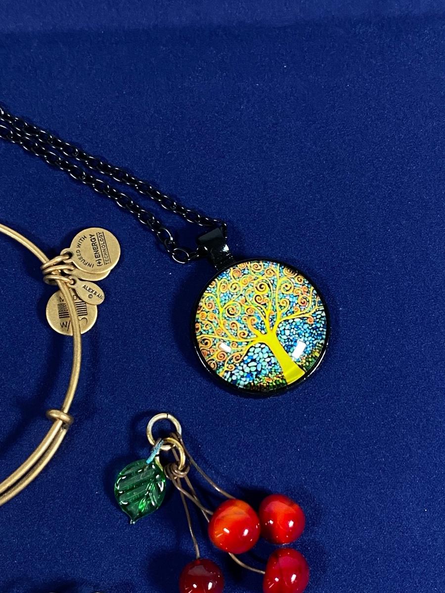 Mixed Jewlery Lot. Enameled sterling butterfly pin, glass cherries charm, Peace bracelet, pendant necklace, and a carved flower vine hair barrette. The barrette has some damage, everything else in good condition.
