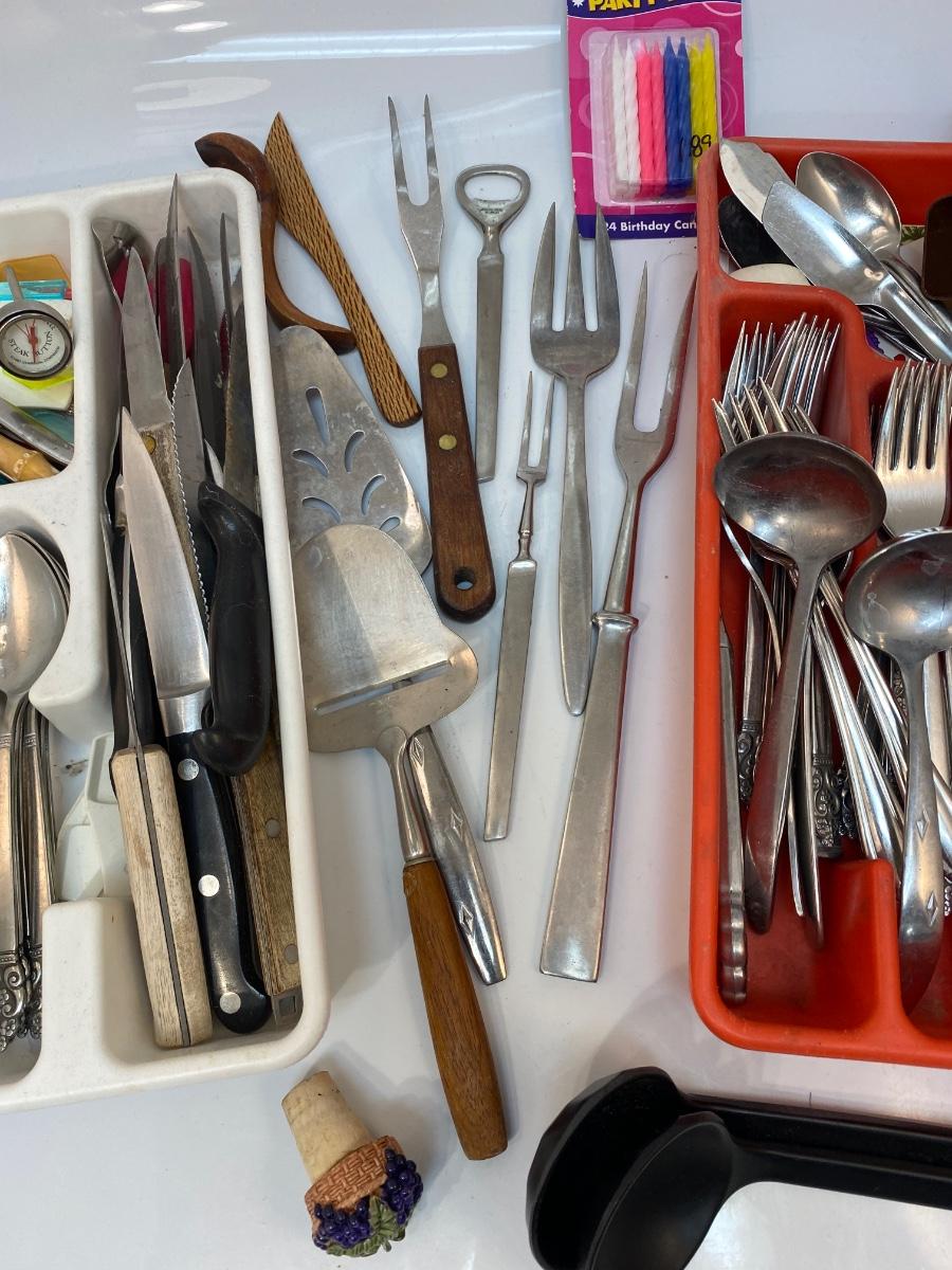 Mixed Kitchen Drawer Lot Silverware Knives Serving Utensils. Everything photo'd included. Good previously used condition.