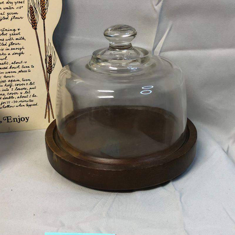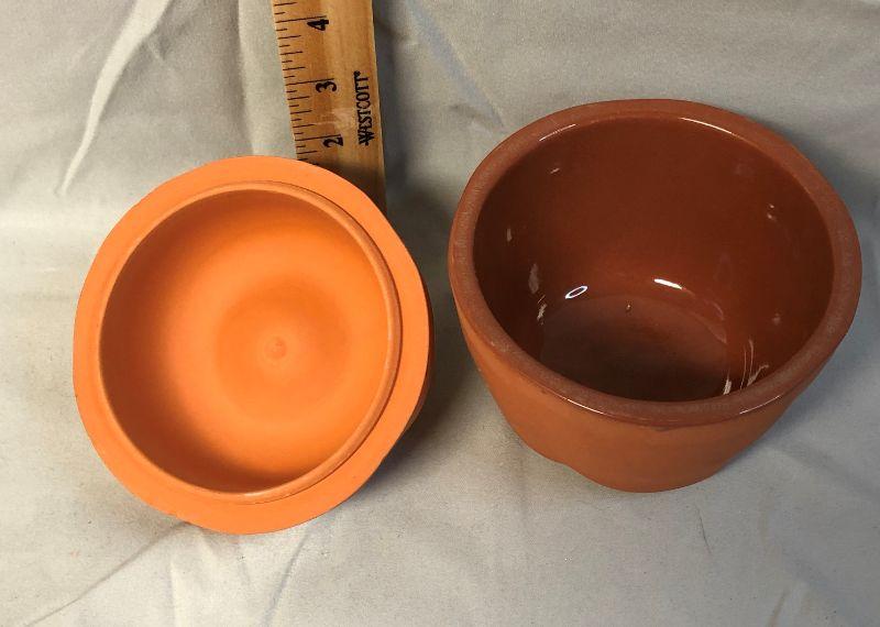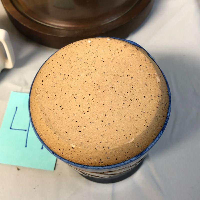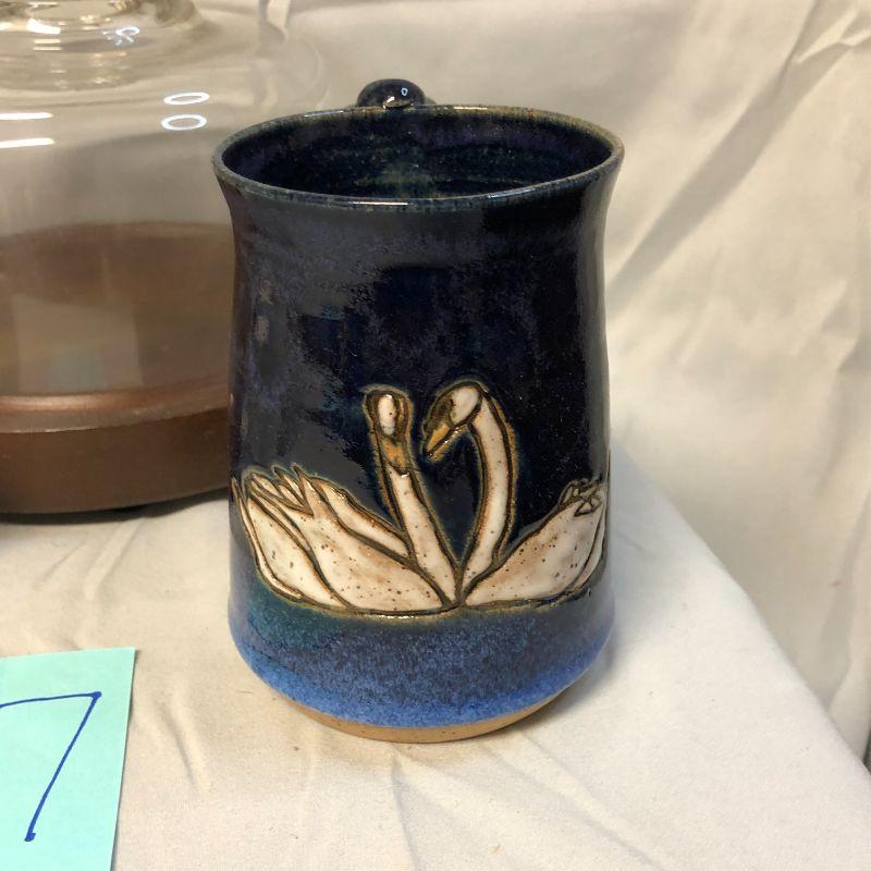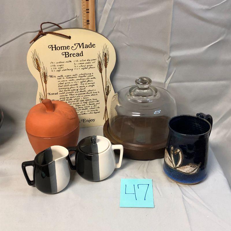 There is a terra cota apple baker that doesn't appear to have ever been used, a creamer and sugar by Teco of Japan, cheese dome with a wood base in excellent condition, and a pottery mug with swans.