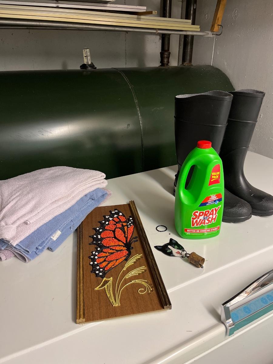 Rain boots size women’s 10. Almost full spray & wash. Towels not in great shape. See pictures for other items.