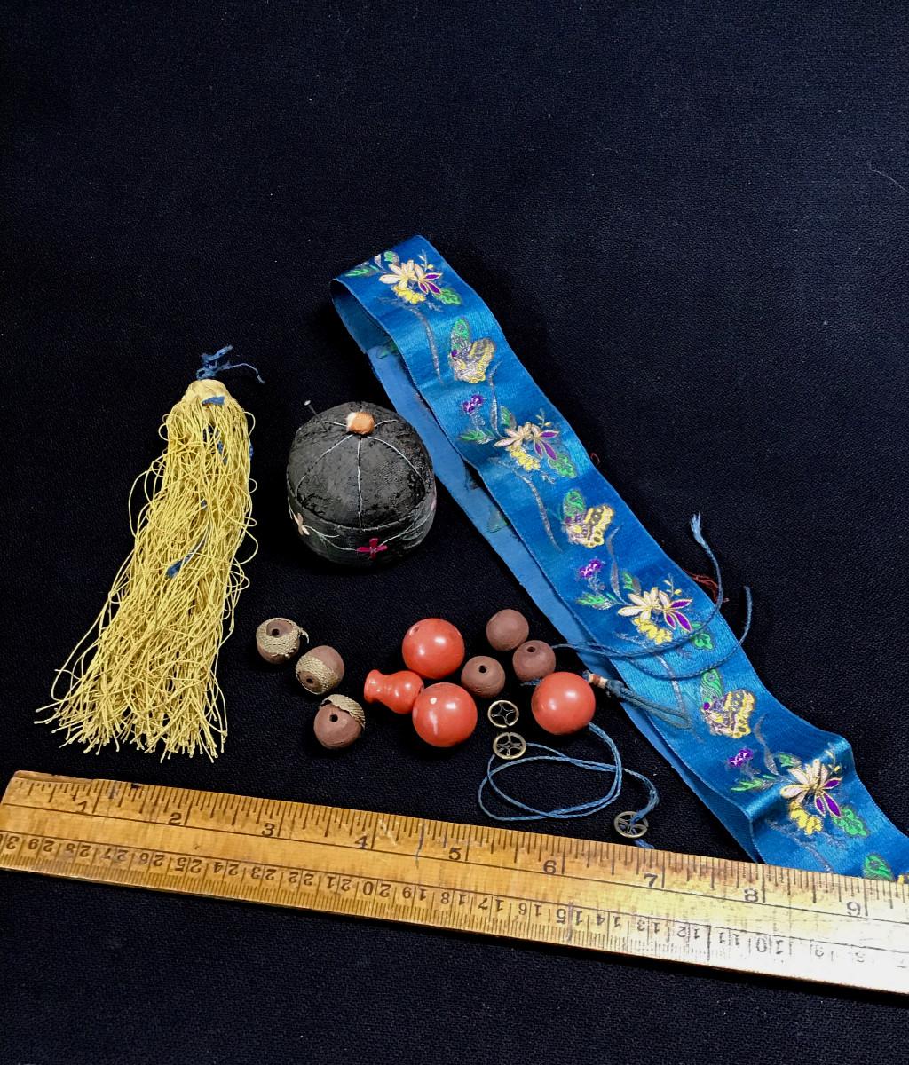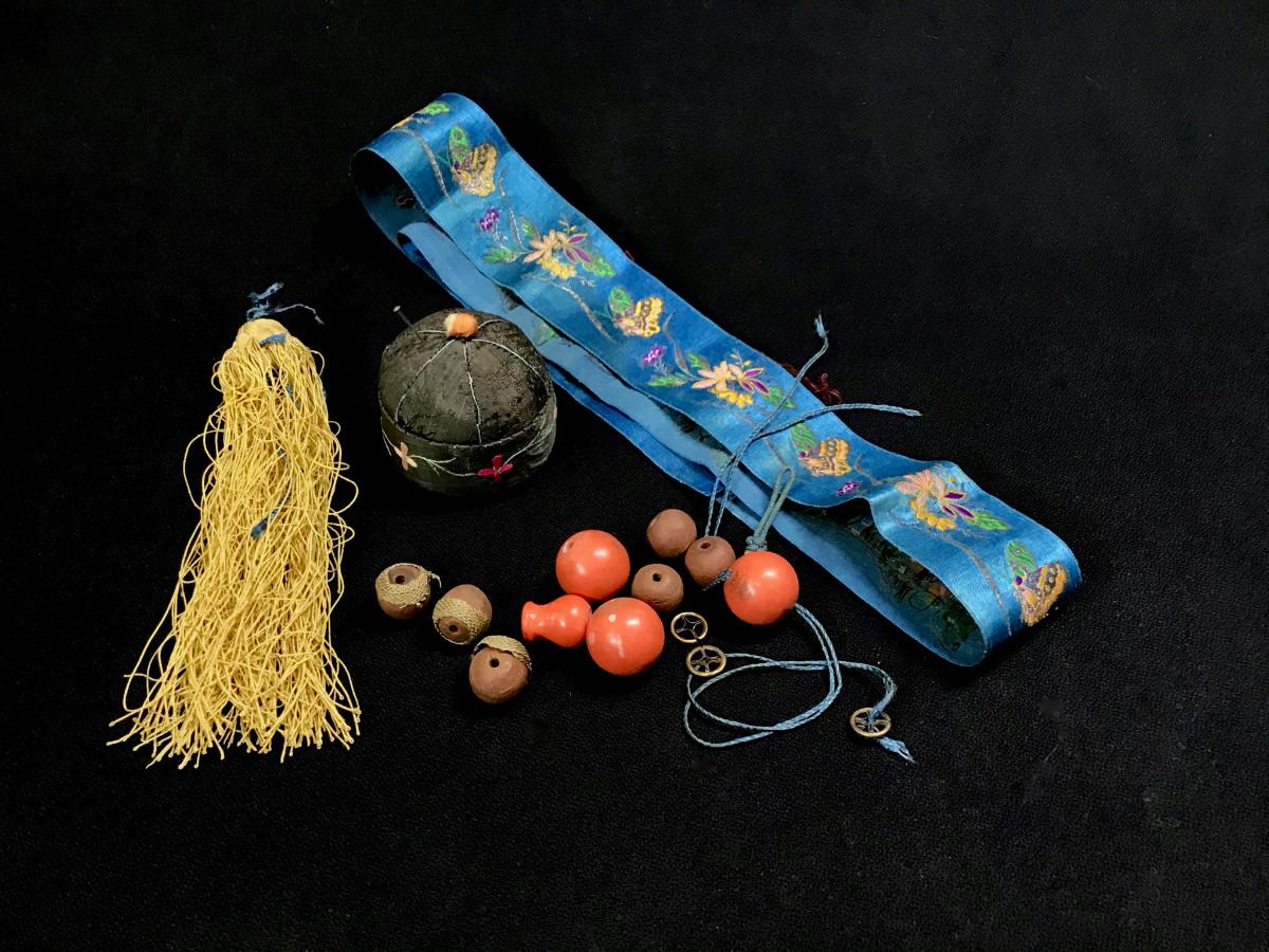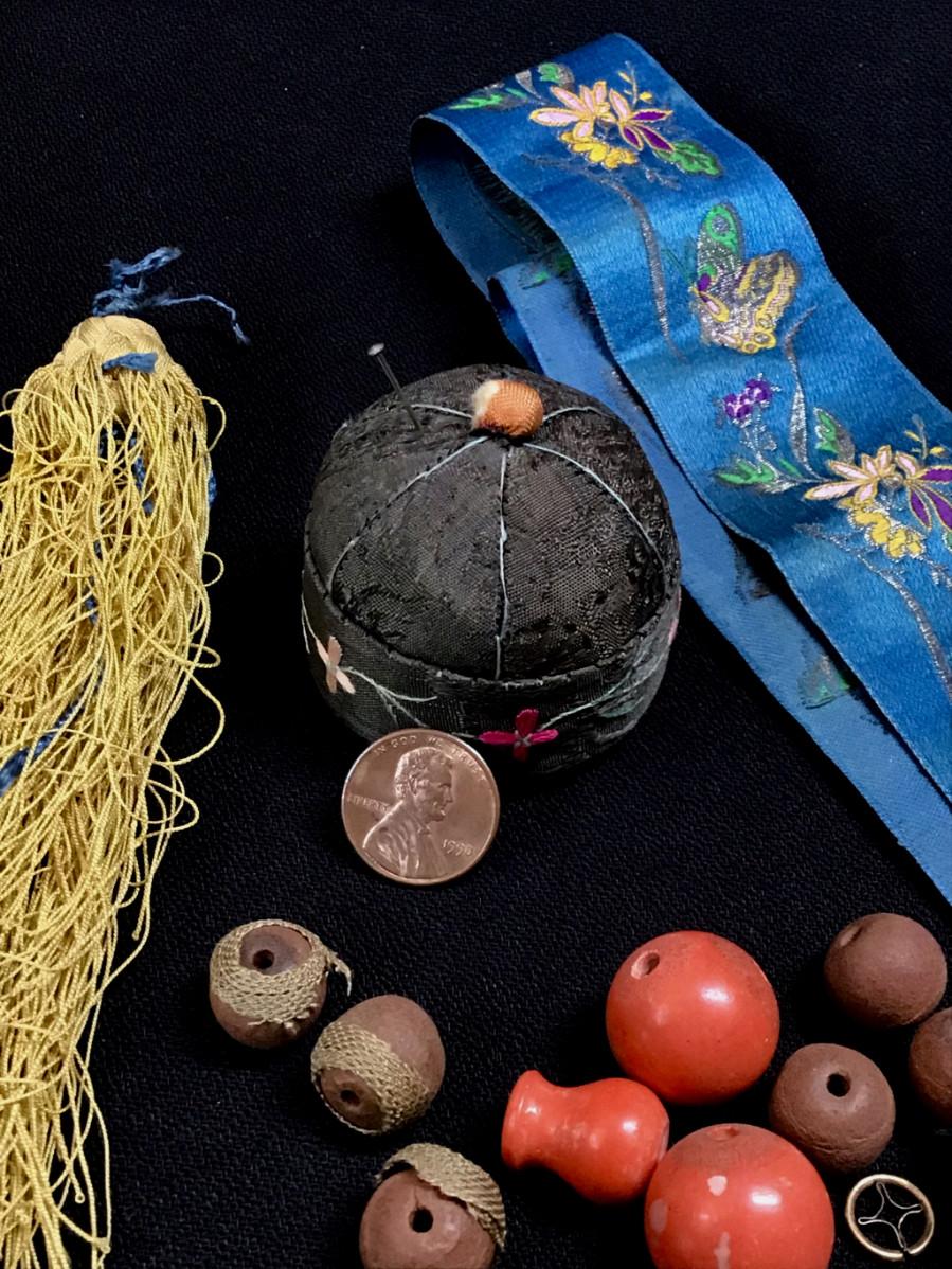 DESCRIPTION: This mixed lot of items is made up of composite and wooden beads with spacers and a yellow silk tassel that appear to be part of a Mandarin hat. The length of blue silk ribbon is worked the whole length with finely rendered flowers and butterflies. The pin cushion, which is shaped like a Chinese cap, is composed of silk, hand embroidered with a blossom border.
