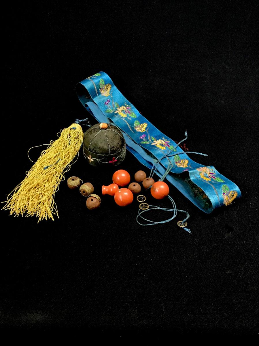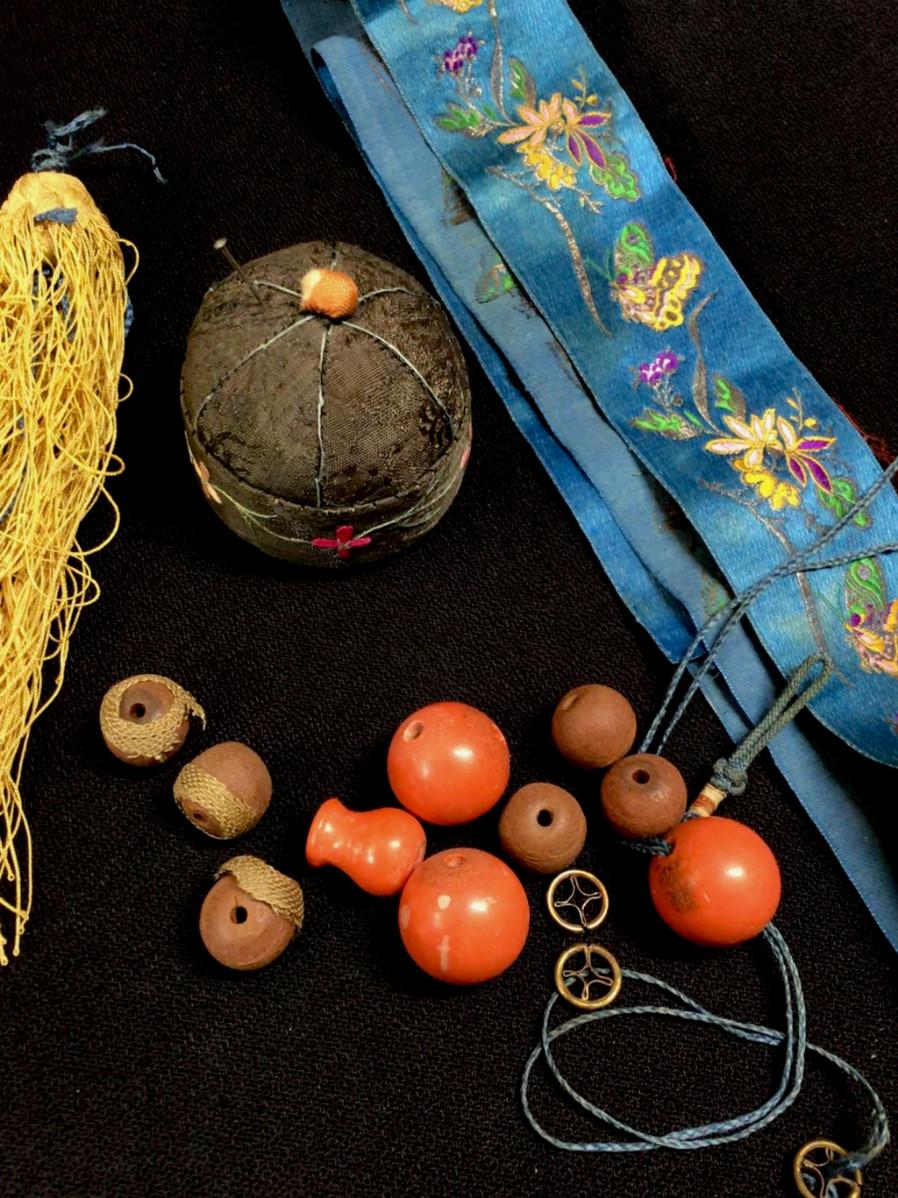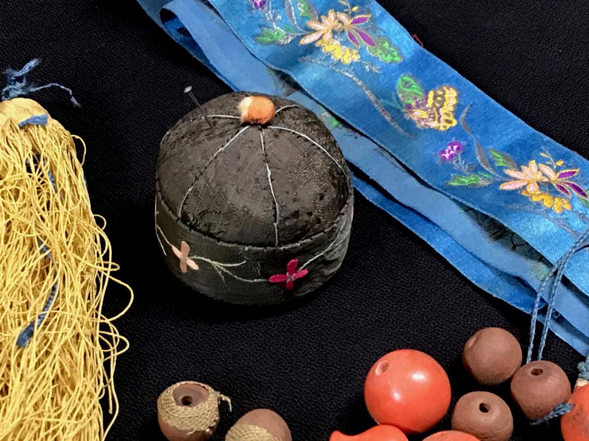 DESCRIPTION: This mixed lot of items is made up of composite and wooden beads with spacers and a yellow silk tassel that appear to be part of a Mandarin hat. The length of blue silk ribbon is worked the whole length with finely rendered flowers and butterflies. The pin cushion, which is shaped like a Chinese cap, is composed of silk, hand embroidered with a blossom border.