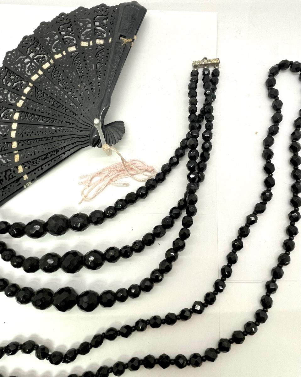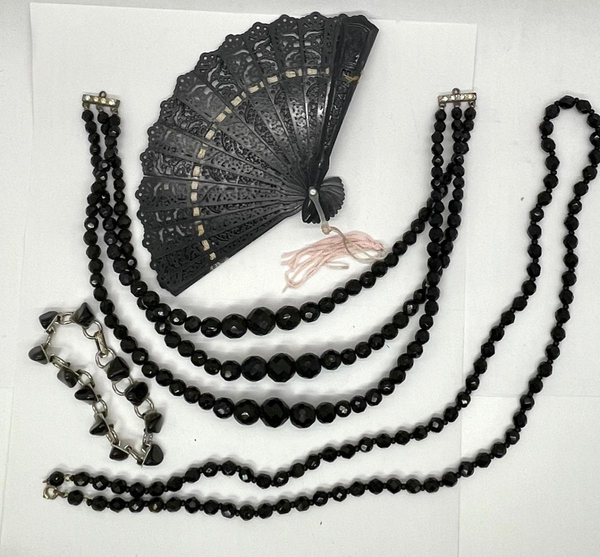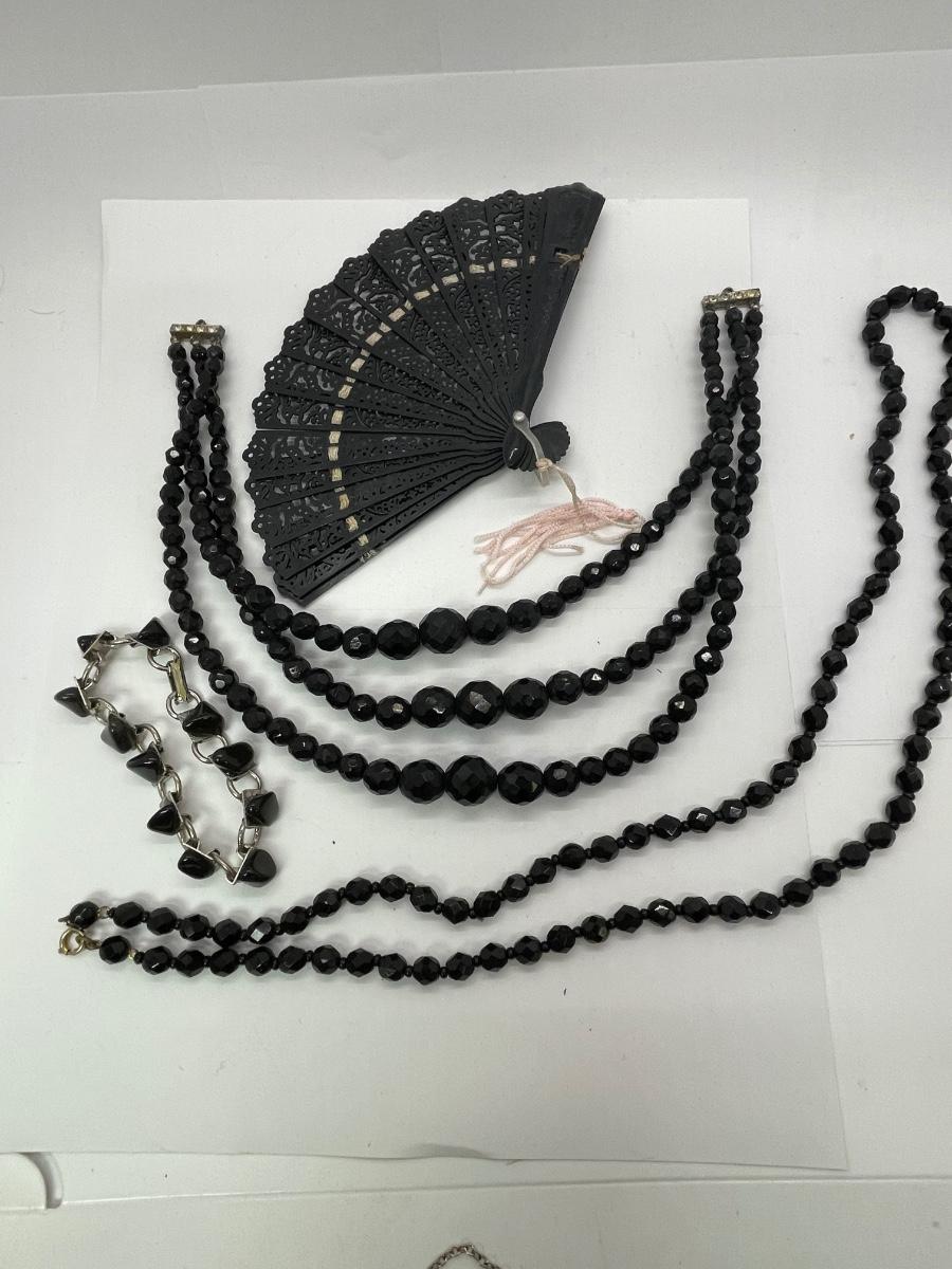 Mixed JewelryLot - black beaded neck;laces, bracelet, amd small fan