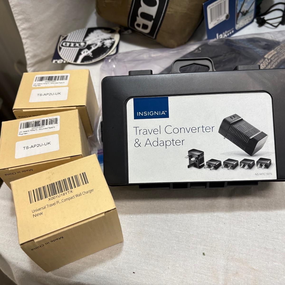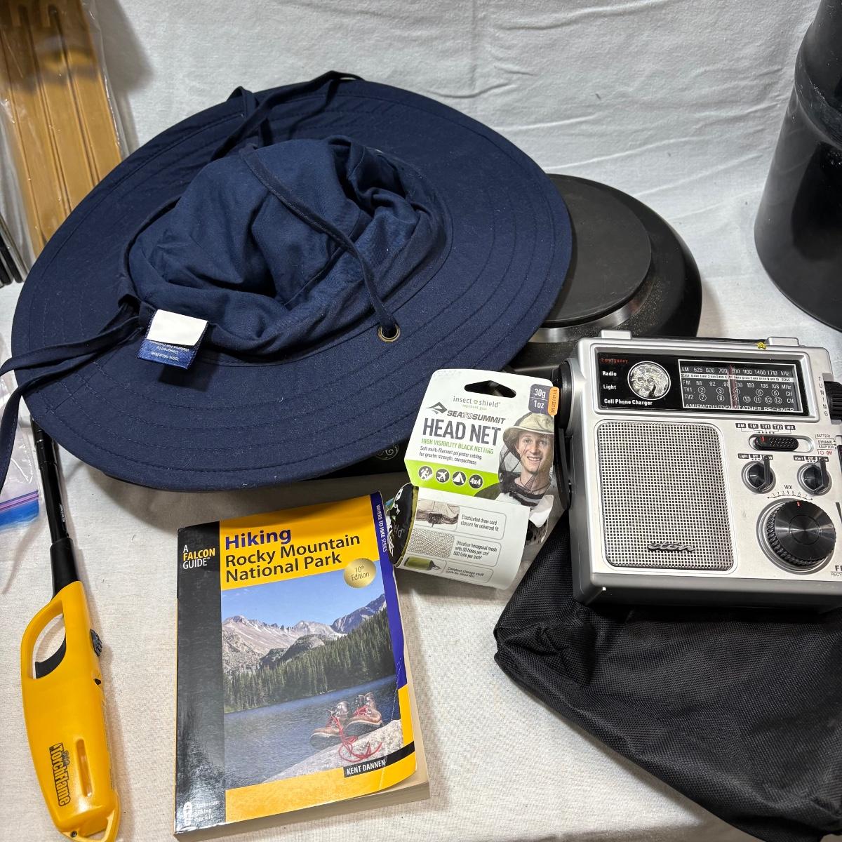 Eno double hammock with a bag of suspension straps, travel adapters, rain ponchos, chairs, bear-safe food canister, crank radio, electric hot plate and more. Black storage tub and large REI duffle bag included. The hot plate powered on when plugged in, see picture.