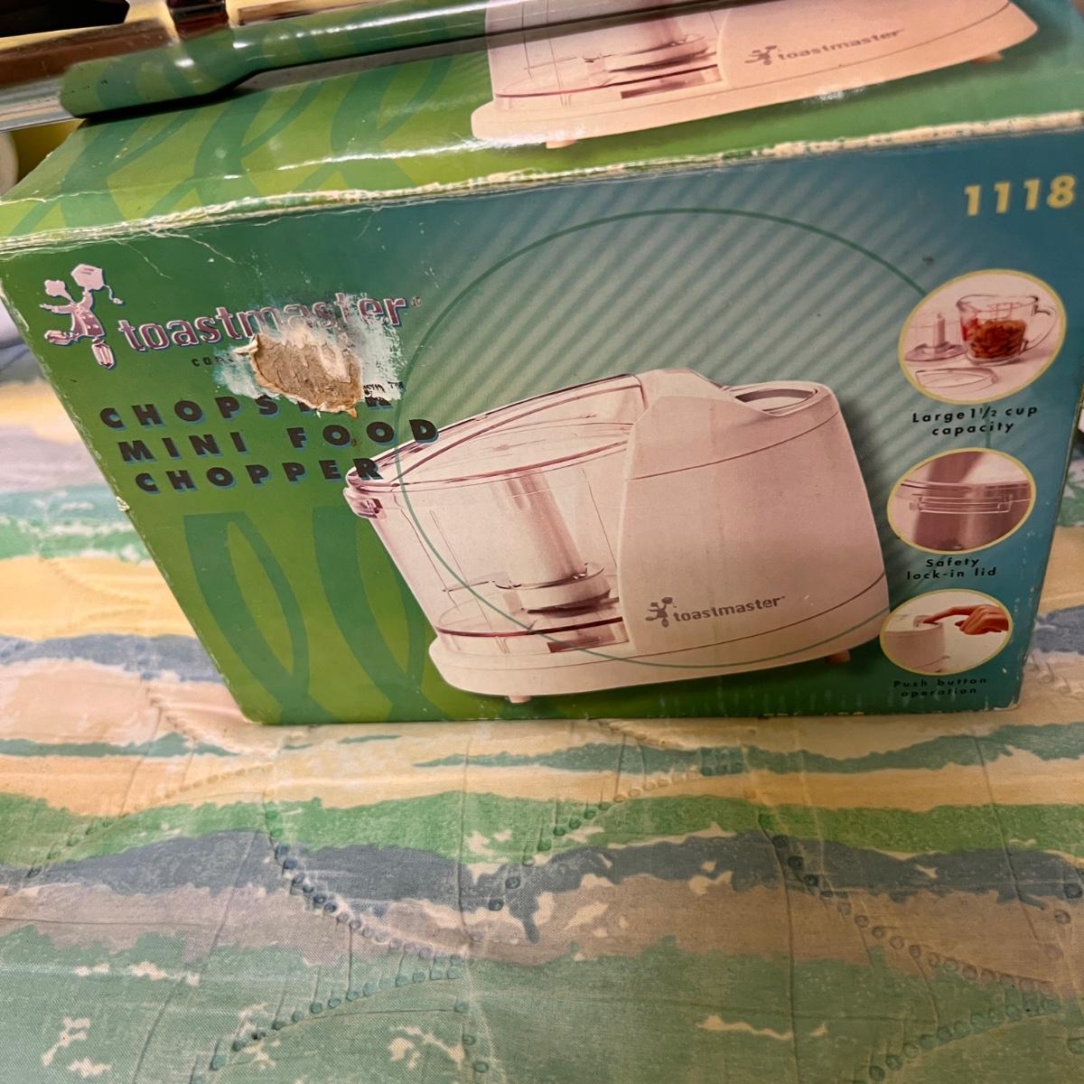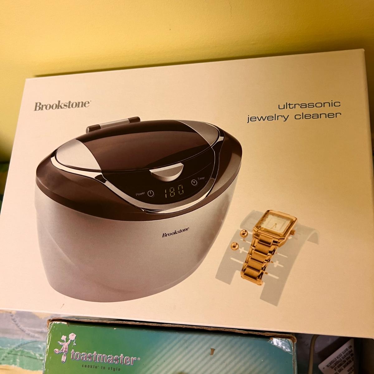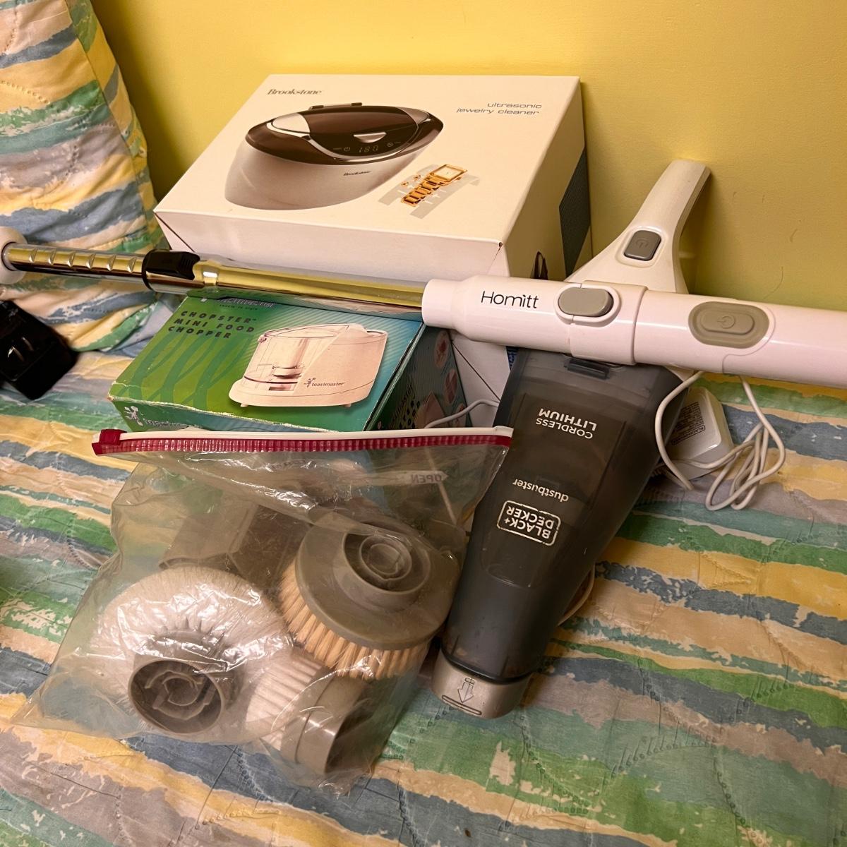 Tested and working Homitt power scrubber, Black and Decker cordless vac Dustbuster, Toastmaster mini chopper and new in sealed box Brookstibe ultrasonic jewelry cleaner.