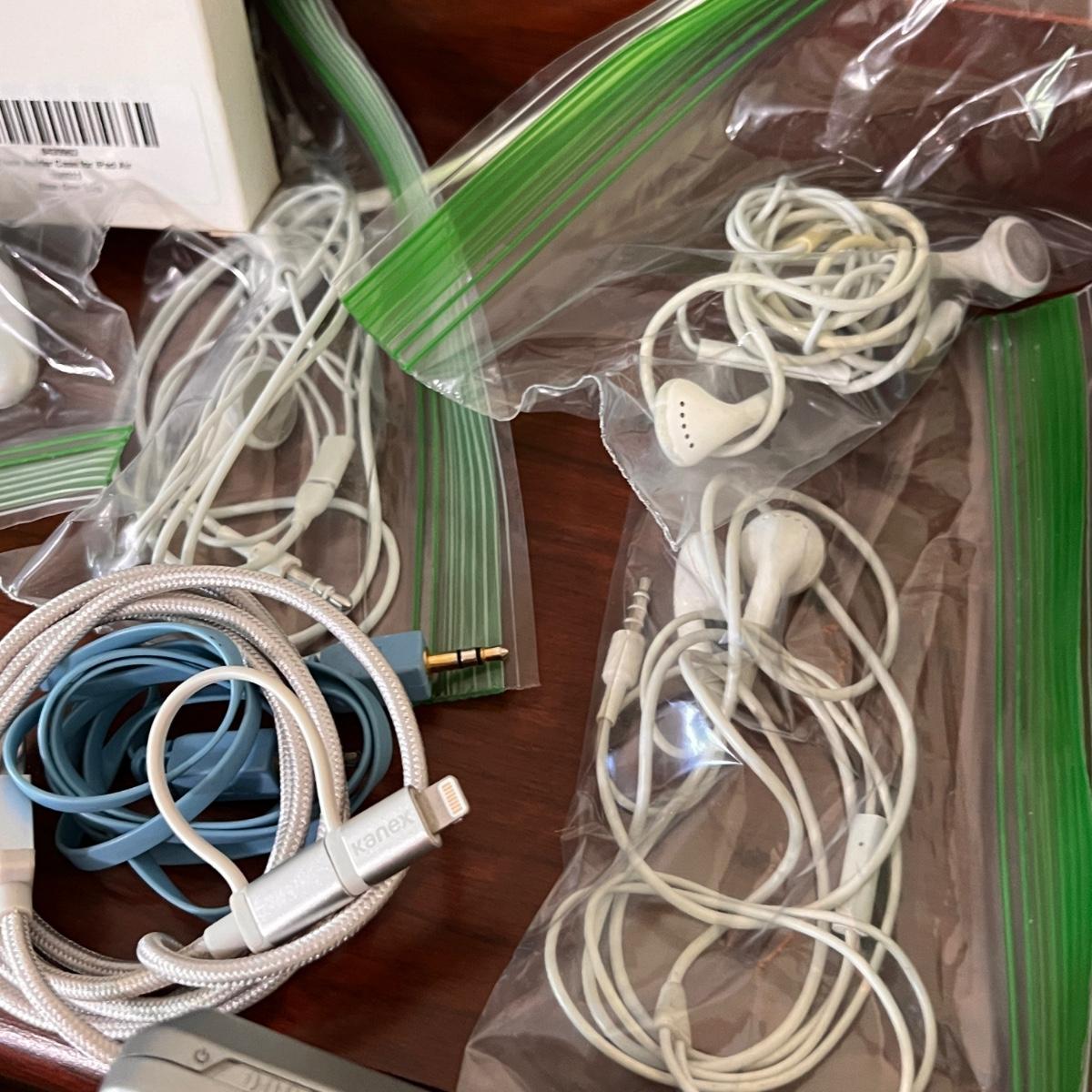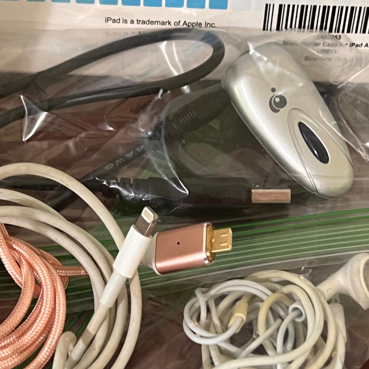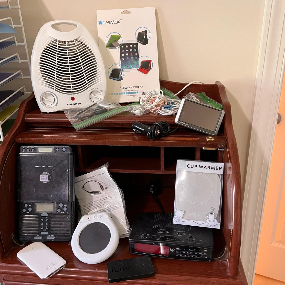 Portable office space heater, 2 portable battery chargers, Garmin GPS, 3 pairs earbuds, new wireless bluetooth headphones, wireless bluetooth over ear headset, new case for iPad Air, apple phone charger cables, usb powered mug warmer, sharper image shower cd player untested, GE radio alarm clock.